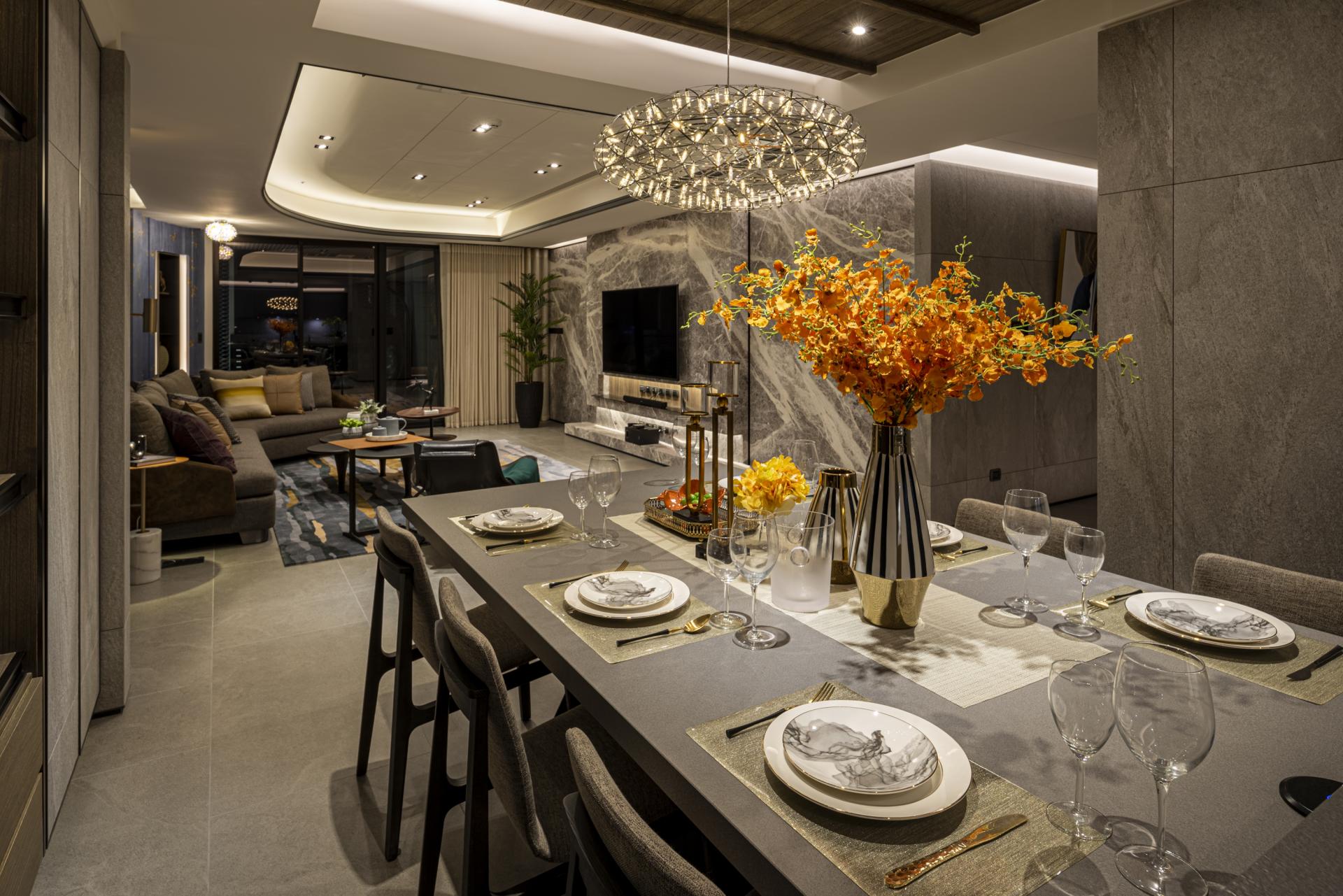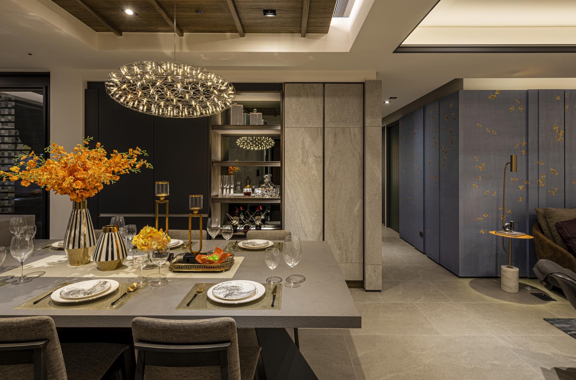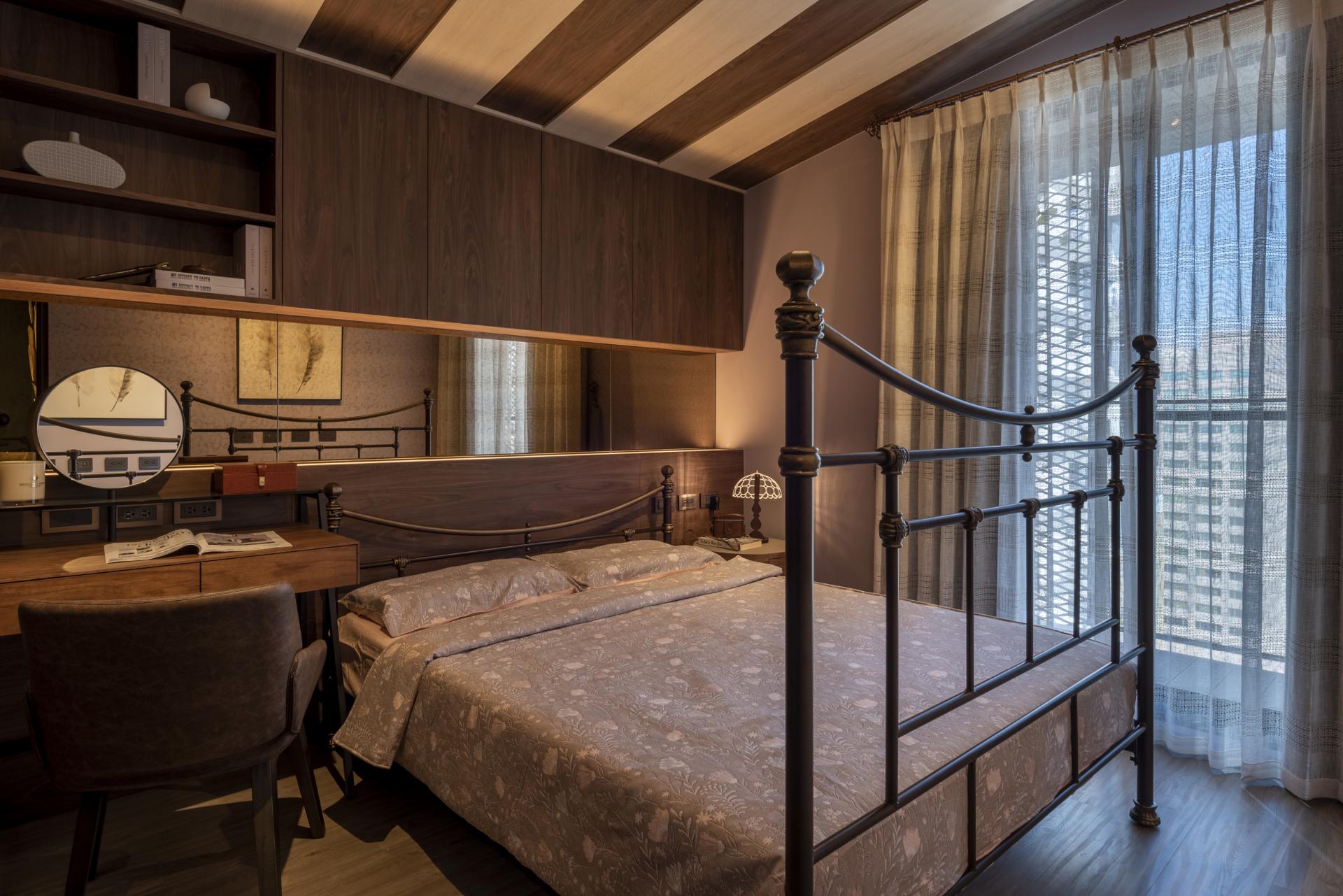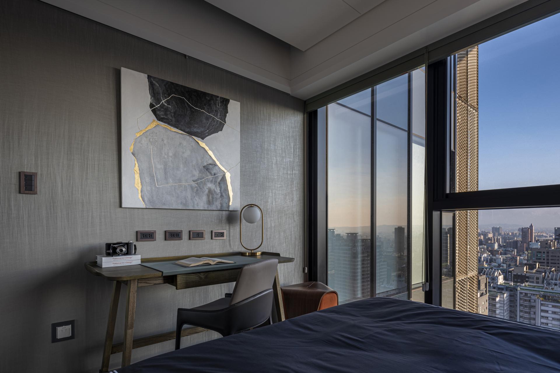 Ceiling treatments transform bulky beams and columns into visual anchors through mixed forms. The design enhances openness and fluidity, especially between the dining room and kitchen. A chrysanthemum-adorned chandelier serves as a visual centerpiece, enriching dining experiences and highlighting the value of family gatherings. Minimalistic elegance reigns in the master bedroom, where floor-to-ceiling windows not only amplify spatial dimensions but also extend the horizon. The secondary bedroom, with its sloping wooden ceiling, fulfills a youthful dream by evoking a Western attic, all within a high-rise context.