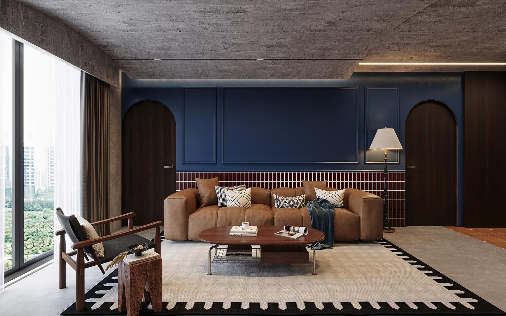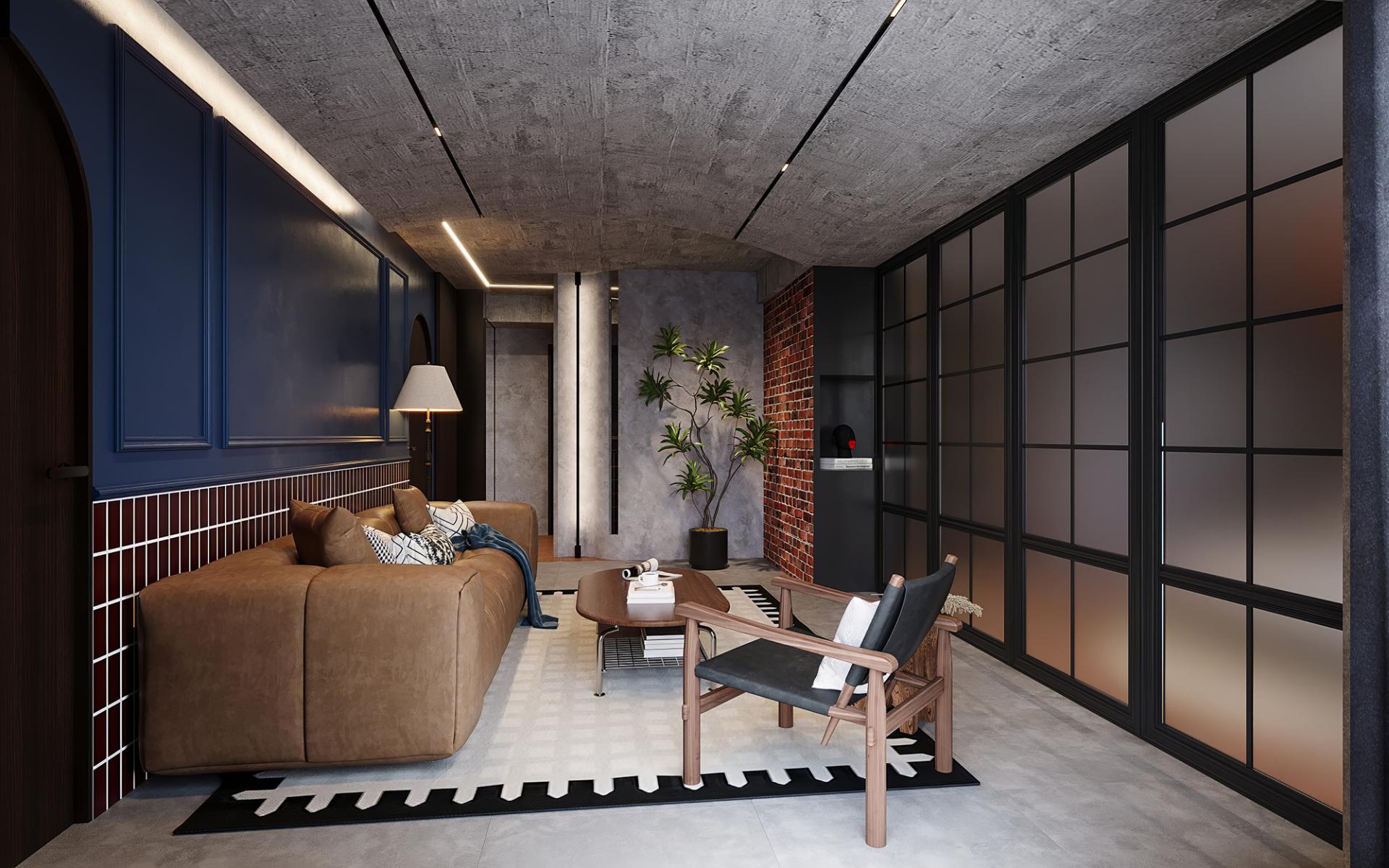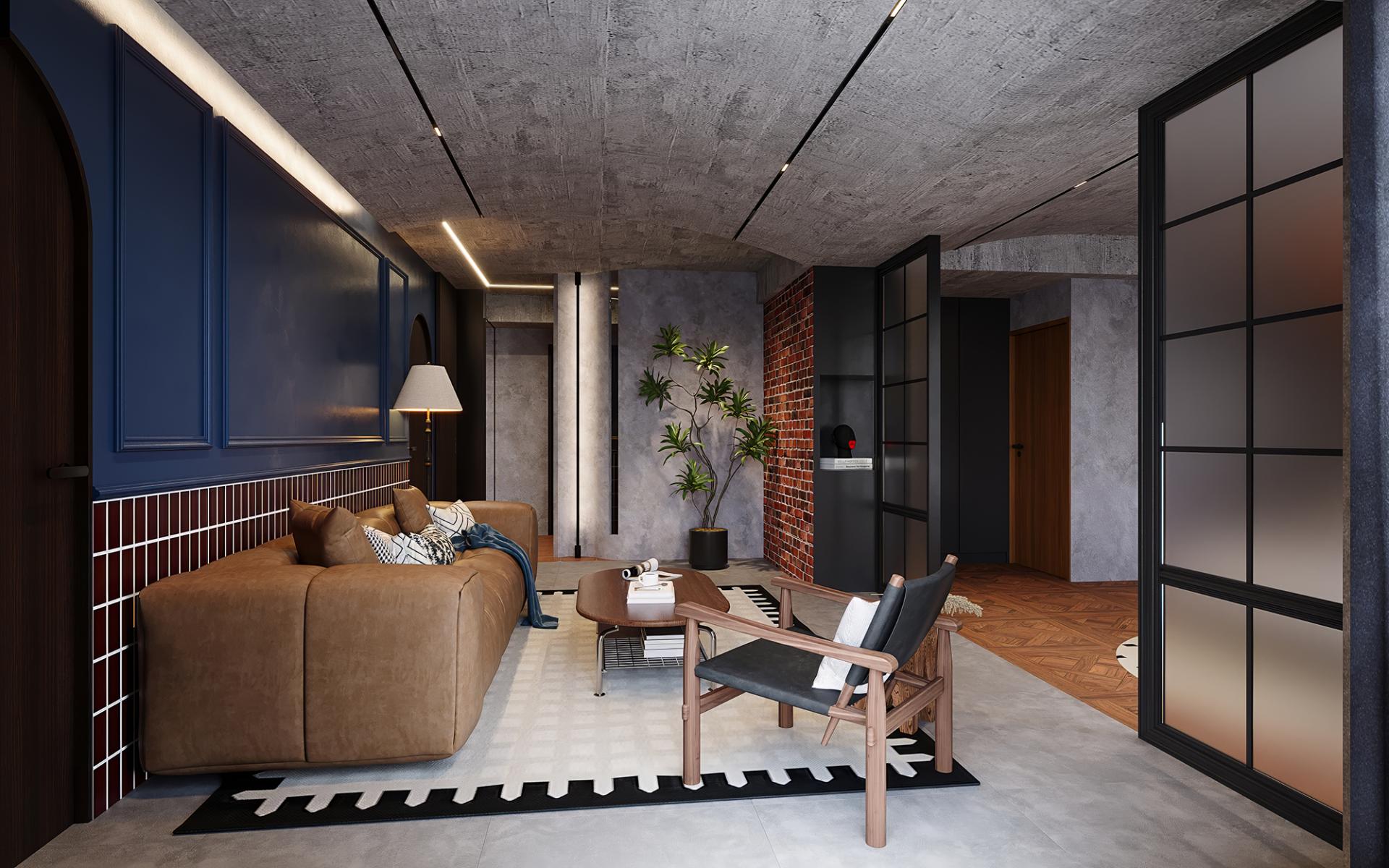 To create a visually striking and harmonious living room, the design team carefully selected a palette of Prussian blue moldings, rich wine-red mosaic tiles, and vibrant red brick wall stickers. These elements come together to form a stunning contrast against the calming gray tones that dominate the space. Furthermore, to enhance both functionality and aesthetics, frosted glass sliding doors elegantly divide the public and private areas. This thoughtful design choice not only ensures privacy but also allows natural light to flow throughout, fostering a bright and inviting atmosphere.