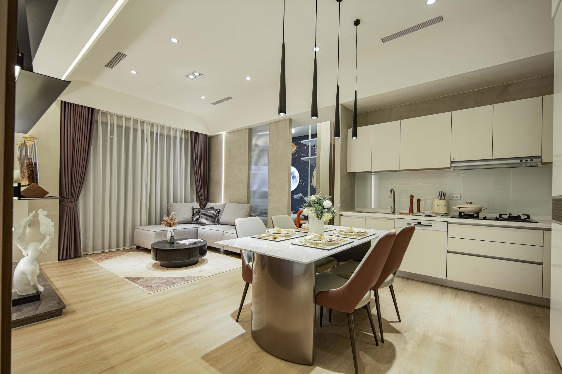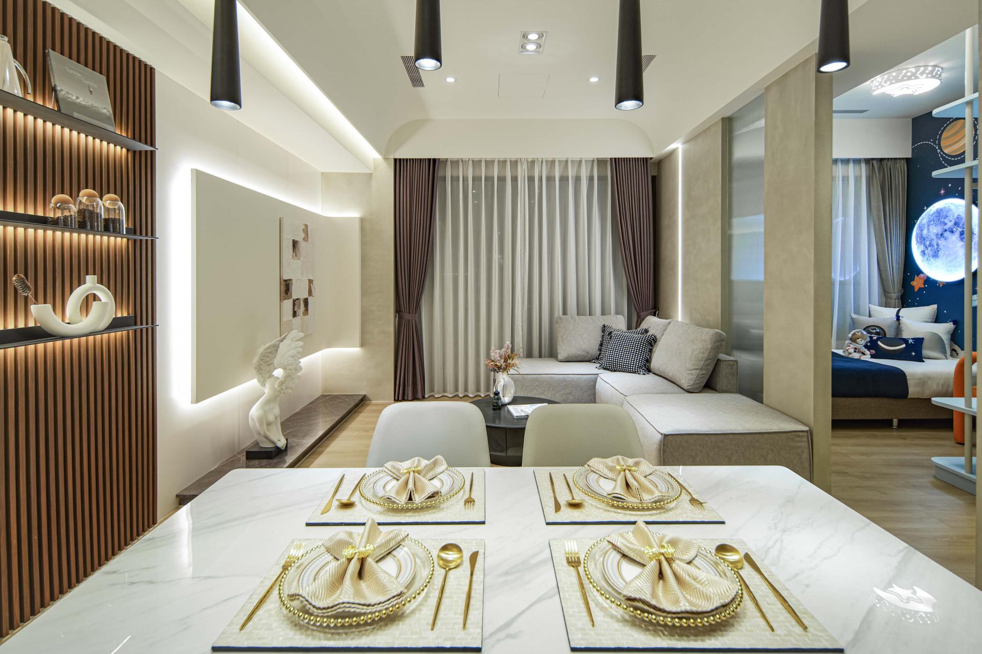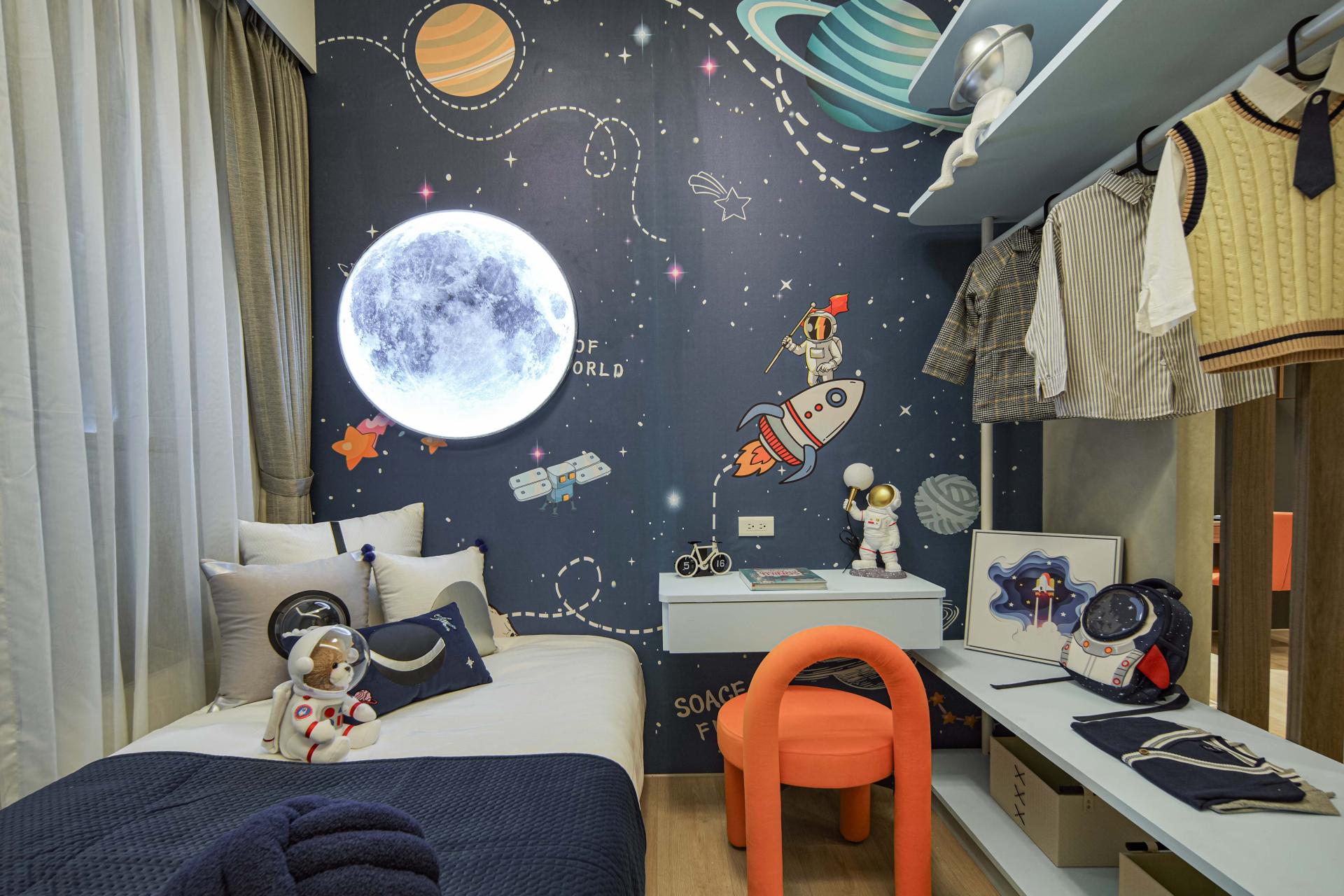 The designer translated these family traits into spatial language: the entrance begins with a grille design that extends into a coffee display wall, making the father’s profession a spiritual symbol of the home. The dining table and kitchen bar respond to the mother’s love of baking, creating the family’s central hub of interaction. In the child’s bedroom, galaxy-themed wallpaper and a moon-shaped lamp reflect the child’s aspirations of space and exploration.