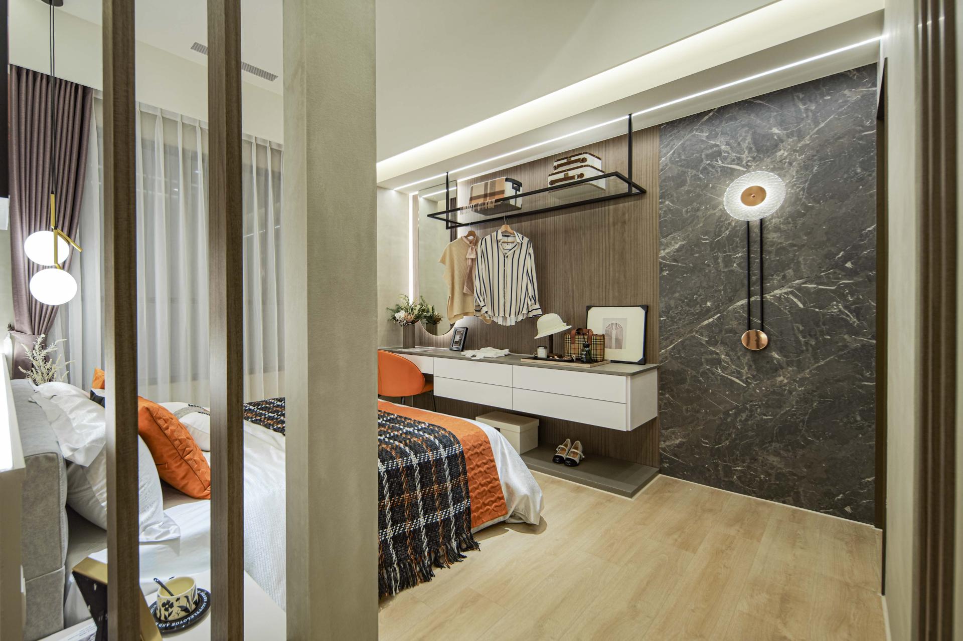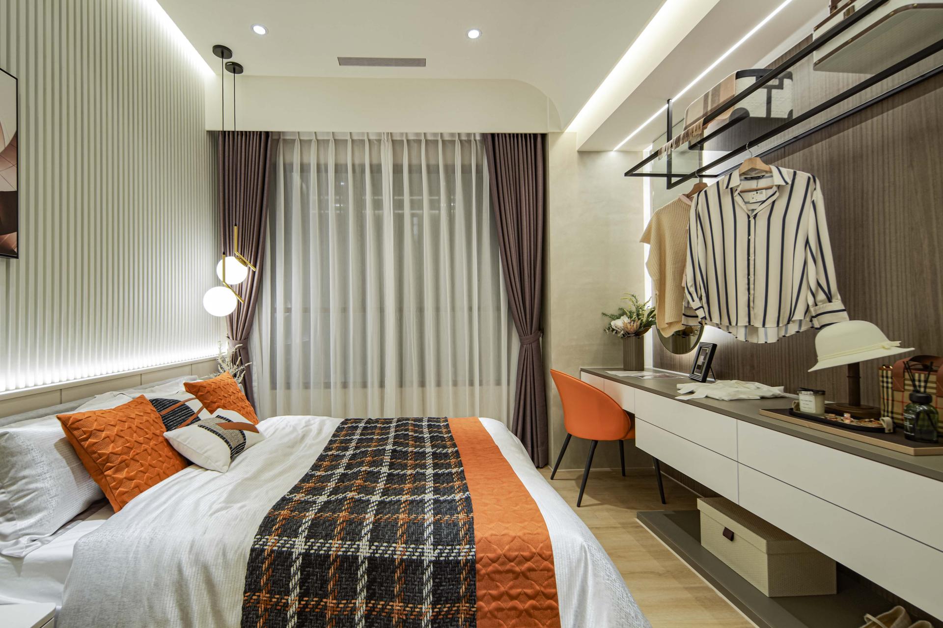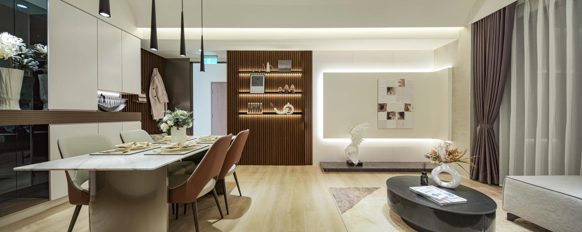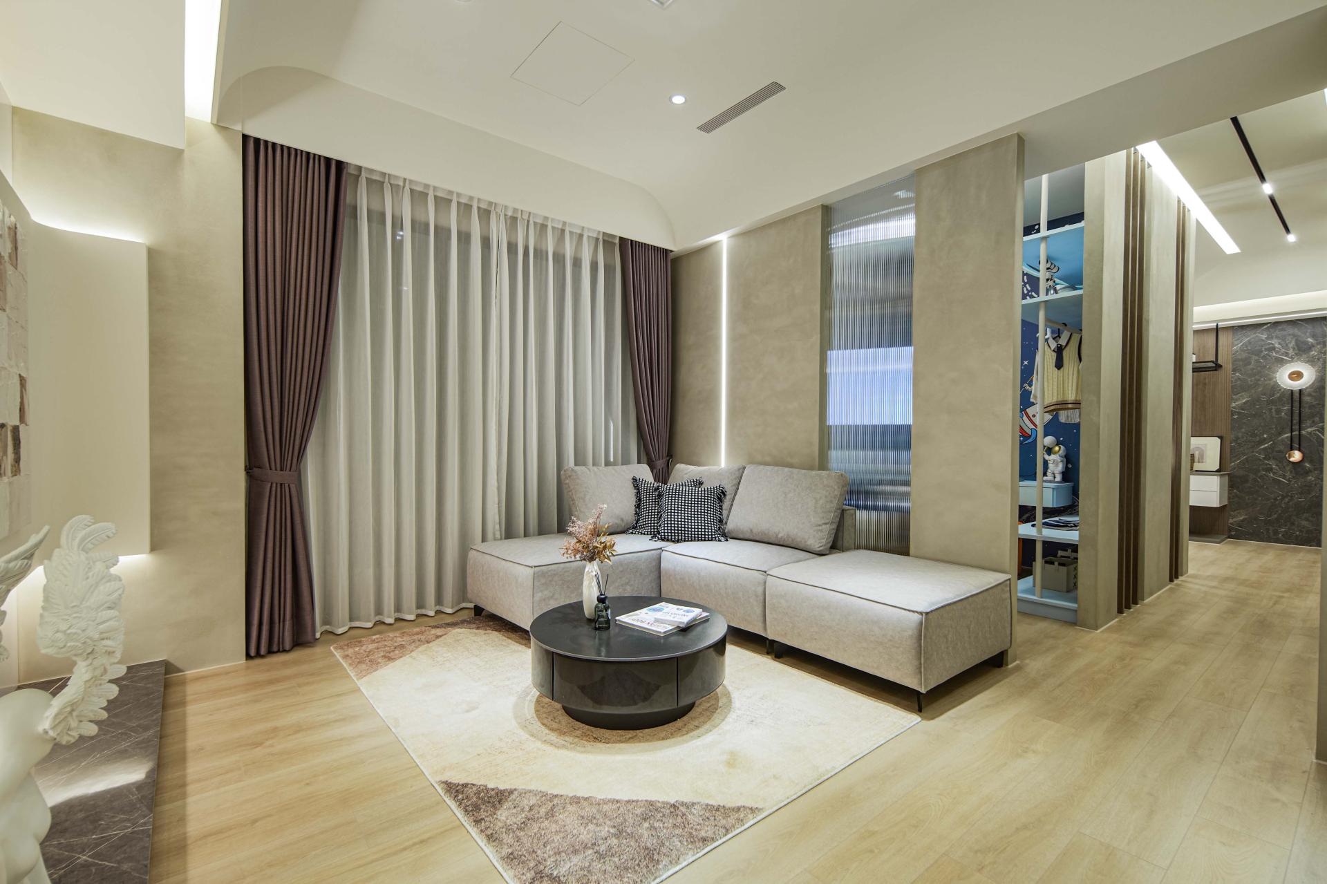 The designer translated these family traits into spatial language: the entrance begins with a grille design that extends into a coffee display wall, making the father’s profession a spiritual symbol of the home. The dining table and kitchen bar respond to the mother’s love of baking, creating the family’s central hub of interaction. In the child’s bedroom, galaxy-themed wallpaper and a moon-shaped lamp reflect the child’s aspirations of space and exploration.