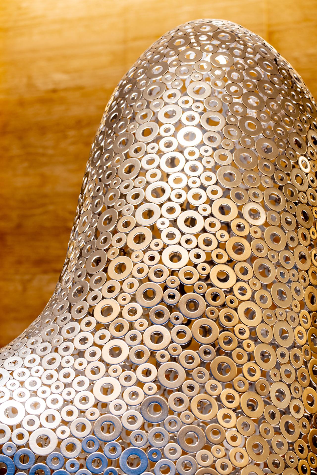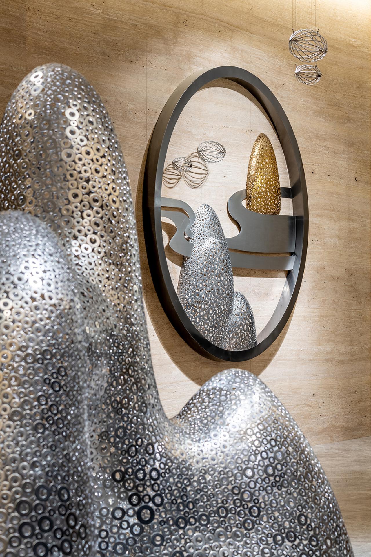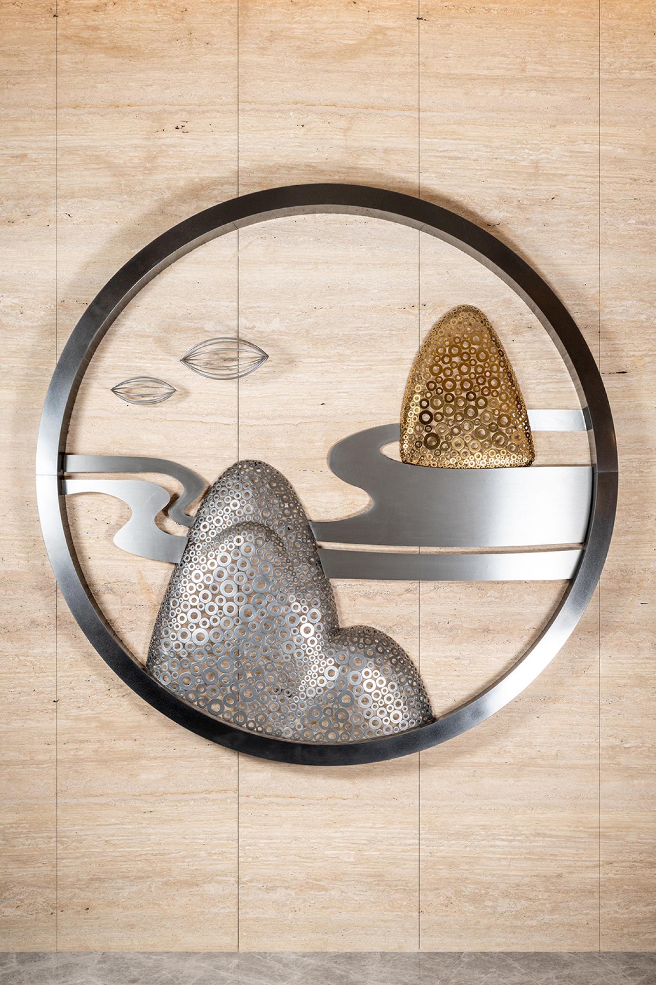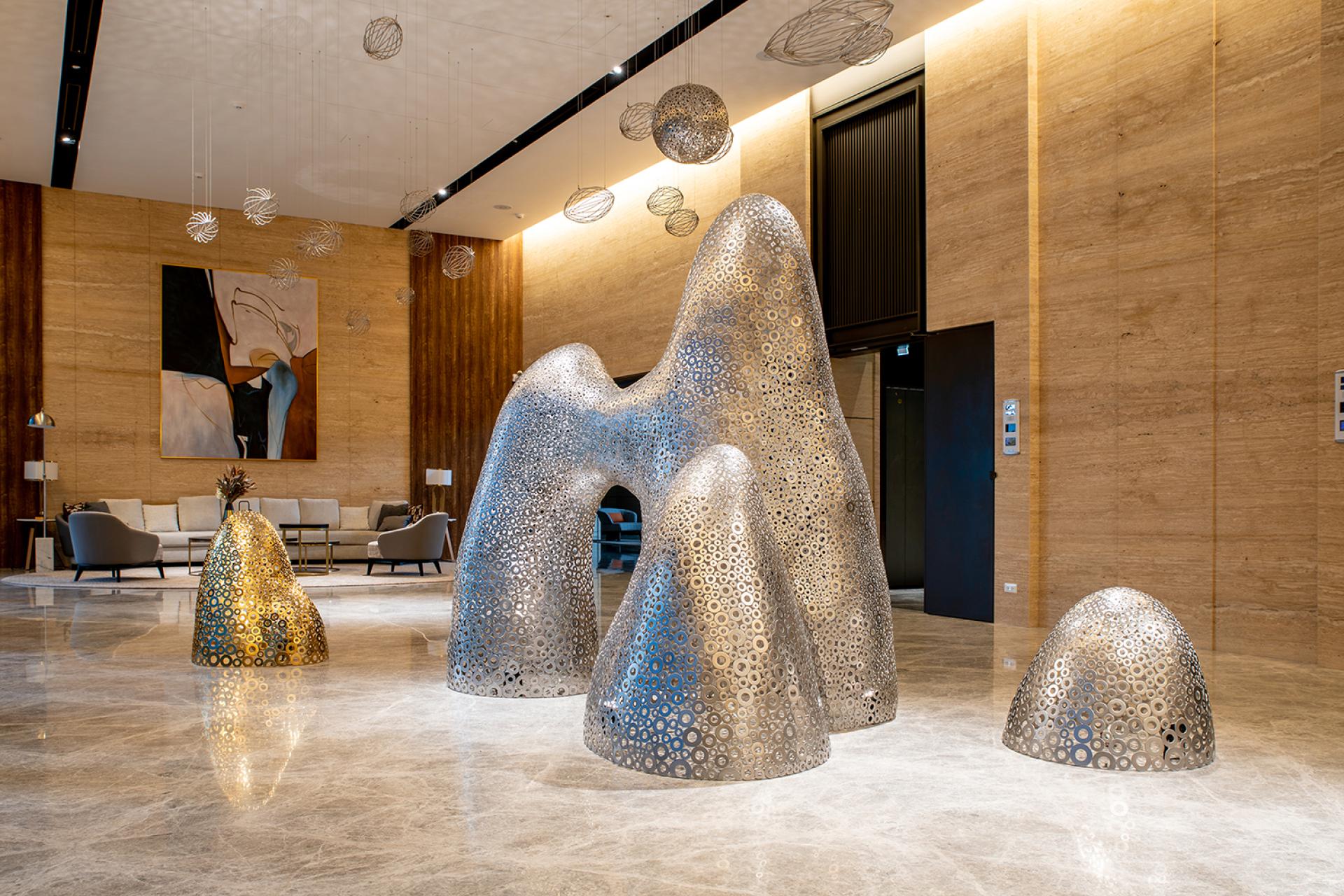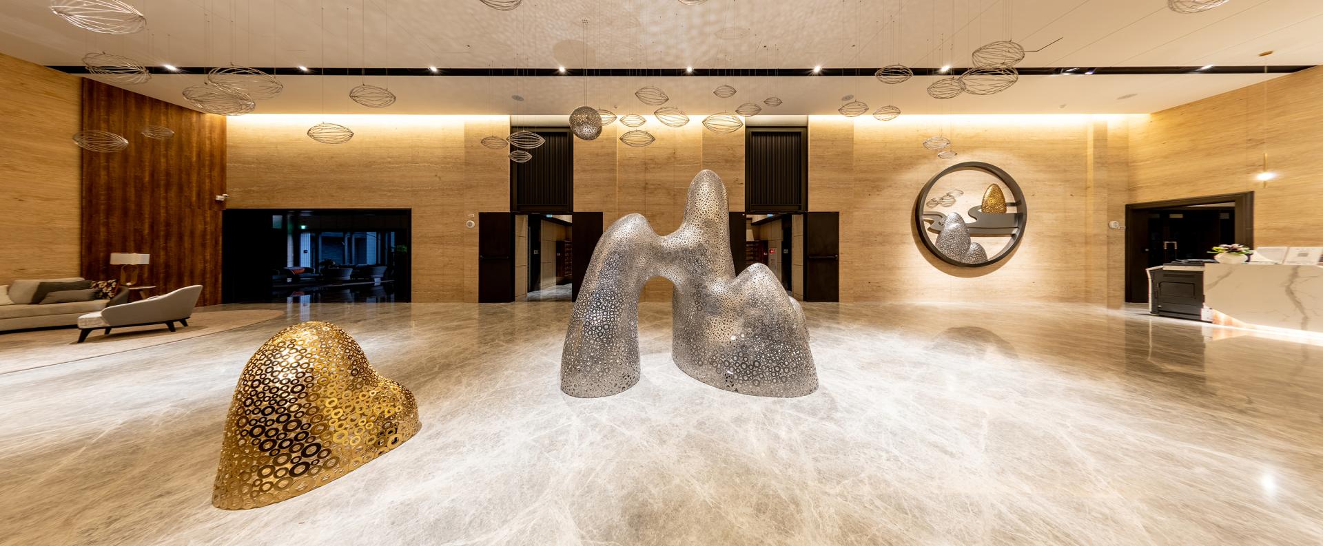 “Rich Landscape” is a site-specific sculptural installation created for the grand lobby of a luxury residential development in Taiwan. Inspired by the spirit of traditional Chinese landscape painting, the artist composed a flowing mountain-scape using thousands of stainless steel washers in silver and gold hues. These softly undulating forms echo the natural rhythm of peaks and clouds, creating a poetic spatial anchor that transforms the lobby into a place of serenity and elegance. Reflecting light and shadow on the marble floor, the piece redefines the space not only visually, but emotionally—offering residents a daily encounter with art, nature, and tranquility.