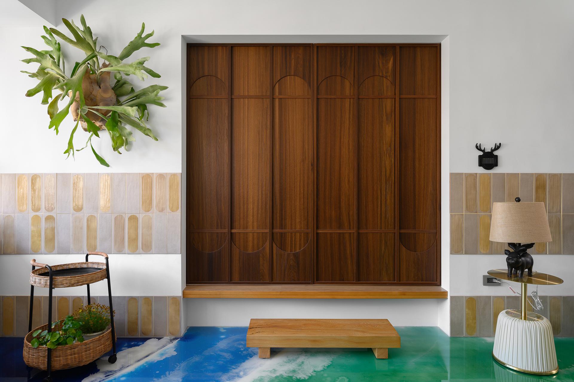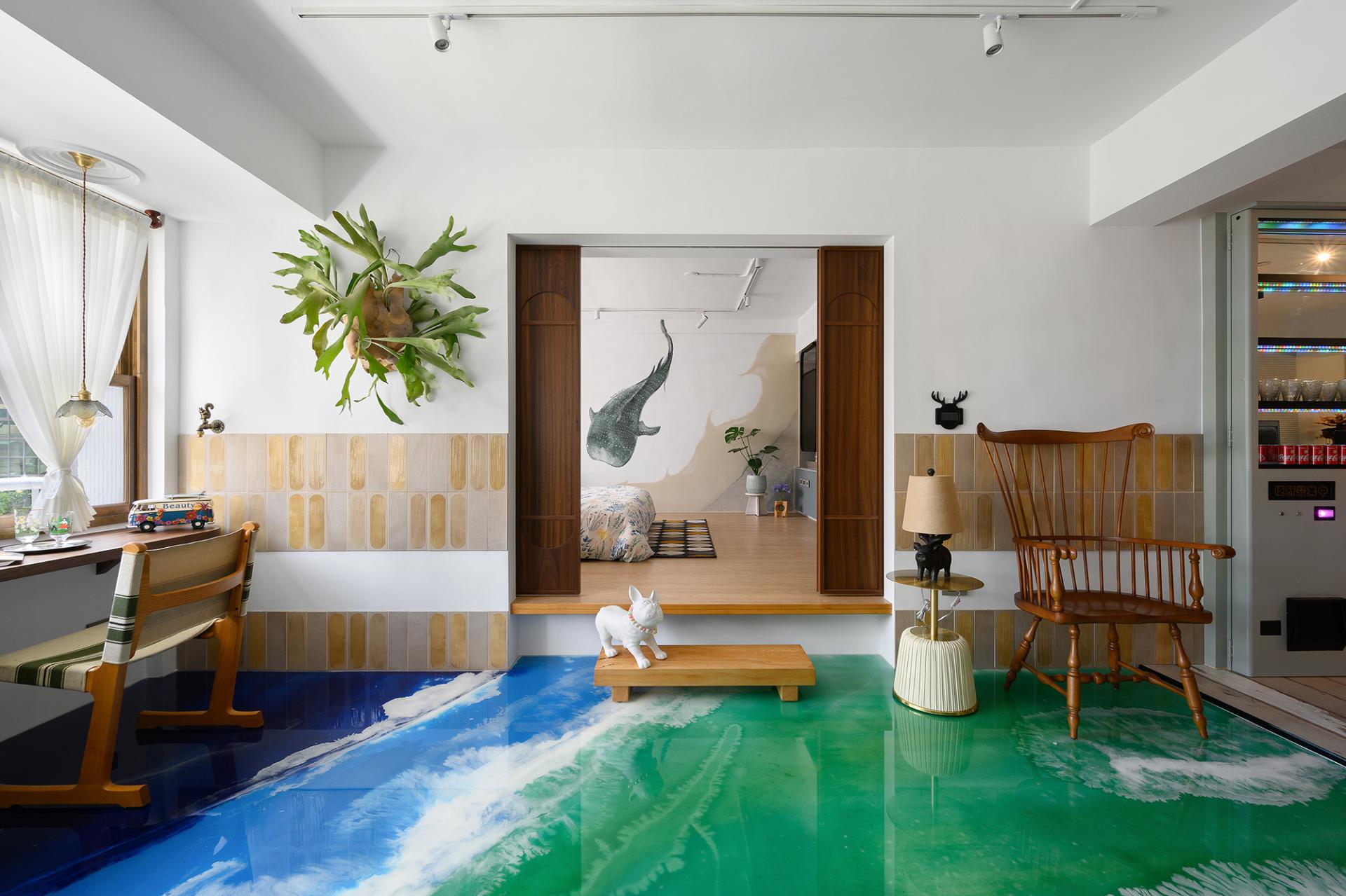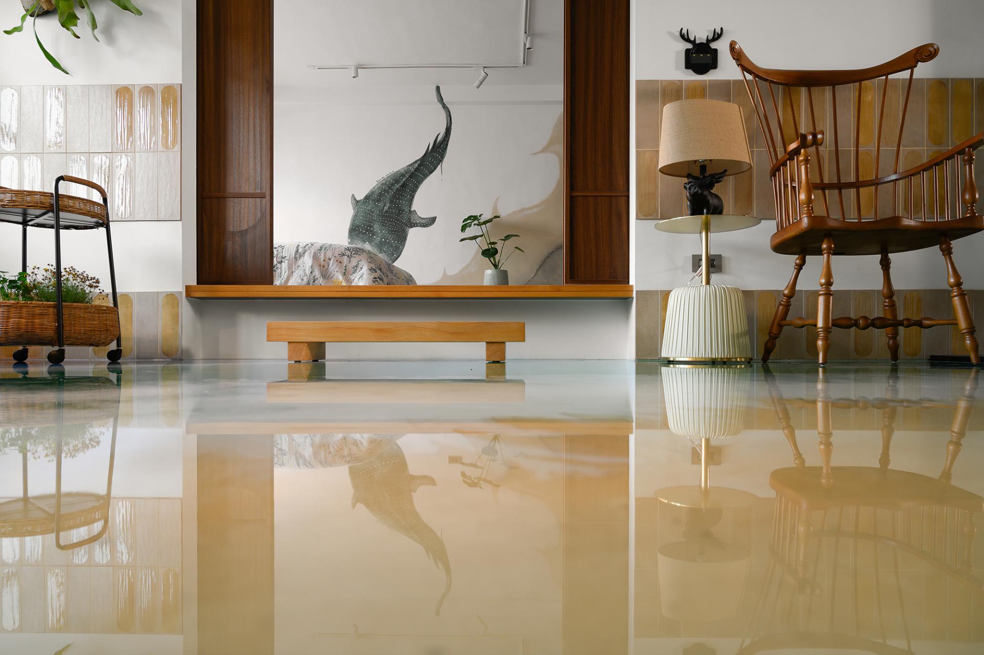 The common area captivates with its marine-themed floor, which acts as the striking visual focal point. This exquisite design is meticulously crafted through multiple layers of intricate rendering and sampling, evoking a resort-like ambiance that conjures images of sunlight dancing upon the ocean surface. In this serene setting, waves and light seamlessly intertwine, creating a soft, harmonious landscape that draws the eye and senses. Moreover, the design thoughtfully integrates elegant wooden window frames, vintage Danish chairs from the 1970s, and luxurious woolen textiles, all of which collectively contribute to an atmosphere of relaxed sophistication. Simple black circular tubes serve to elegantly delineate spatial boundaries; in addition, a cleverly positioned rotating TV stand further defines the living room and study area. This arrangement ensures each space maintains its independence while still embracing the benefits of an open layout. Consequently, this harmonious blend of functionality and aesthetics results in an ideal environment that is not only practical but also visually stunning, inviting residents to immerse themselves in its tranquil charm.