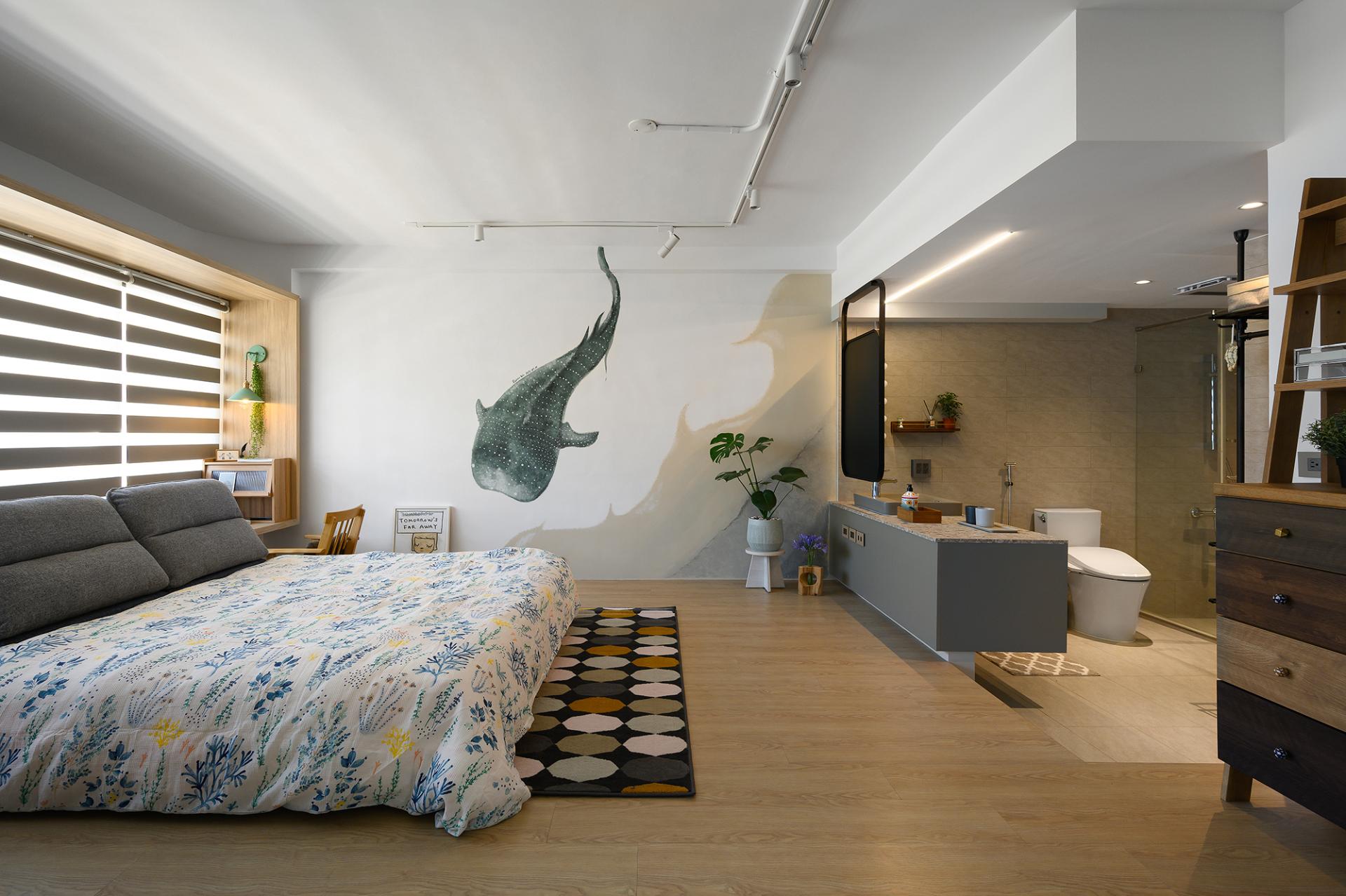 The private area beautifully continues the ocean theme, showcasing a vibrant painting of a shark gracefully swimming in the sea against the pristine white walls of the master bedroom.