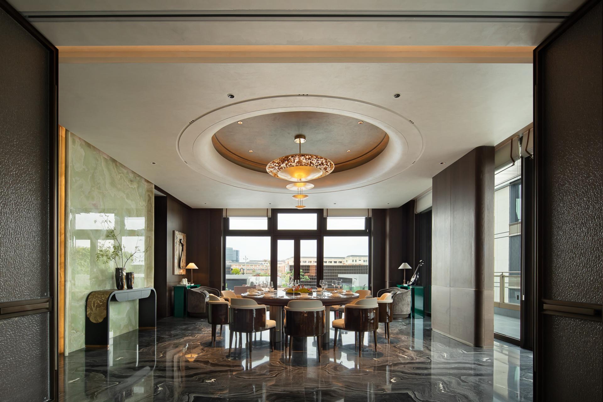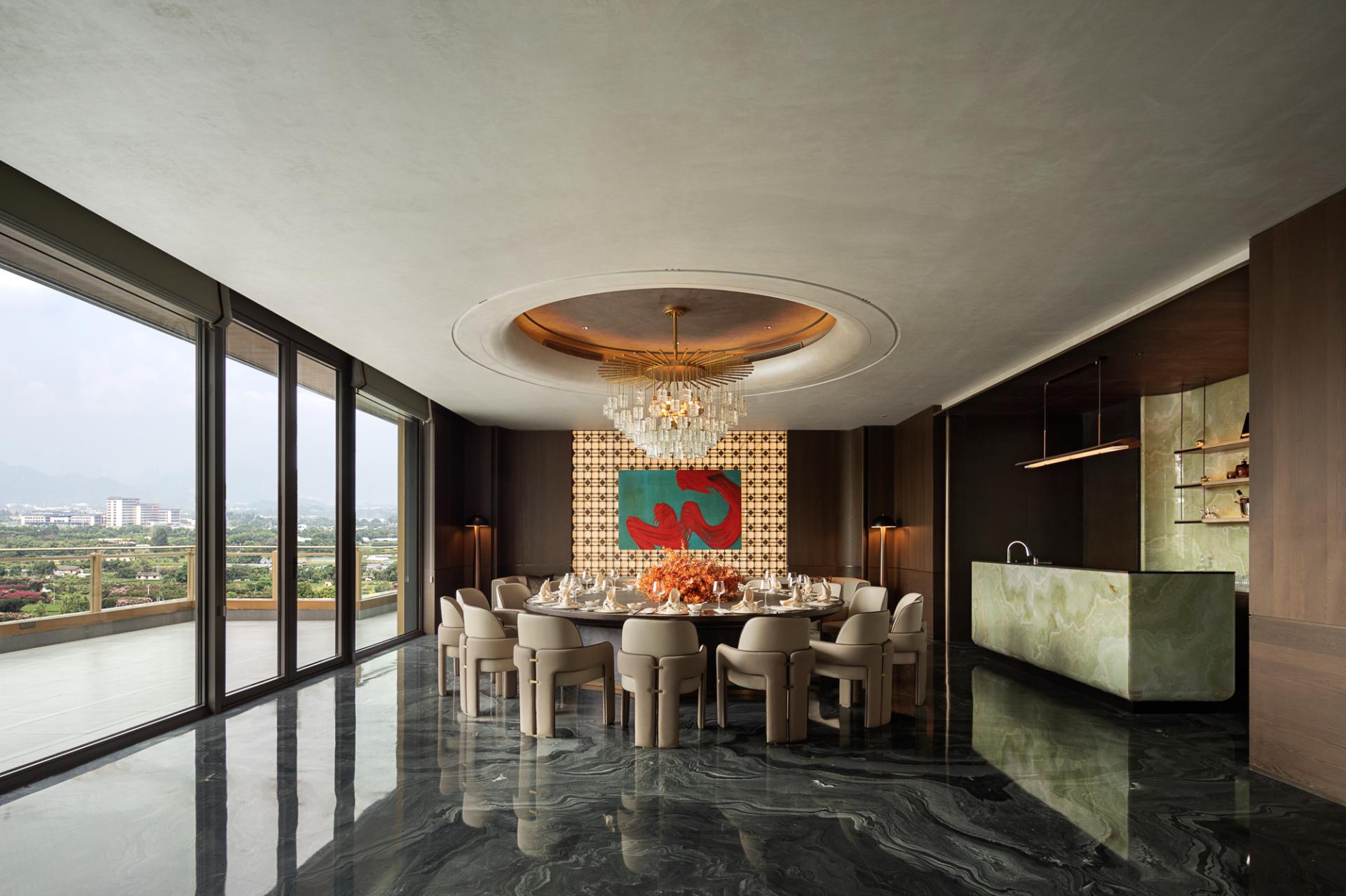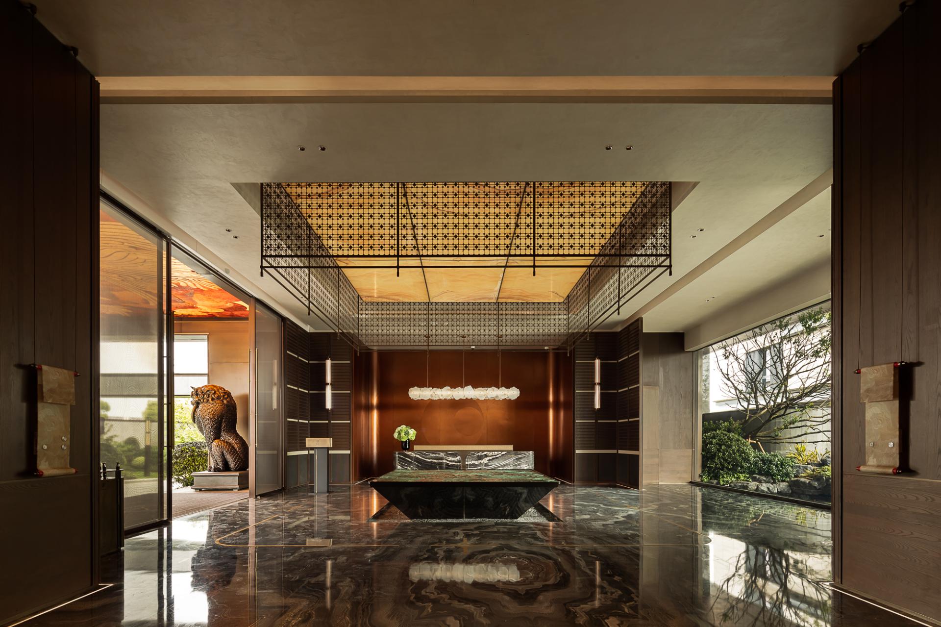 Unlike the traditional literati Song Yun of green mountains and waters, Qian Geng and He Xi drew on a more luxurious and prominent royal culture, creating products with richer colors and more respected regulations. About 12 meters of glass curtain wall, compared to the facade of Apple Park in San Francisco, its cost far exceeds that of ordinary clubs. The transparent texture is like a painting frame, framing the sunken courtyard "Sishui Guitang" into a scenery. Sitting here and looking at each other, one's mood will suddenly become clear. The spiritual totem located in the center of the sunken courtyard - Song Zhi Xuan Gong, was personally customized by Master Xiao Jinliang, the second generation disciple of Liang Sicheng, and can be regarded as a treasure level Chinese collection. In the clubhouse, the arch of wooden architecture art installation with a weight of more than 2 tons is suspended at a height of about 12 meters. It is extremely rare for it to be super heavyweight and super scale. It is worth mentioning that the private banquet hall of Qian Geng and He Xi was built according to banquet level standards, with a retractable design that can accommodate banquets of different levels, making it very suitable for high-level banquets such as business leaders and business elites.
