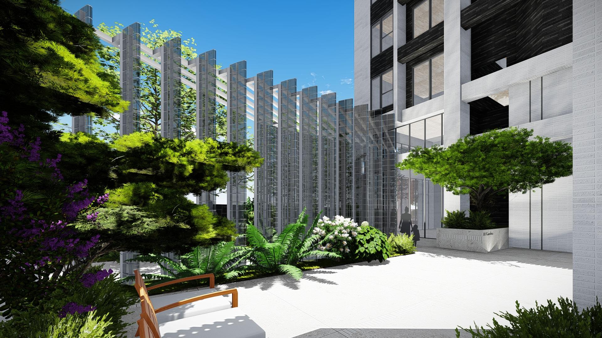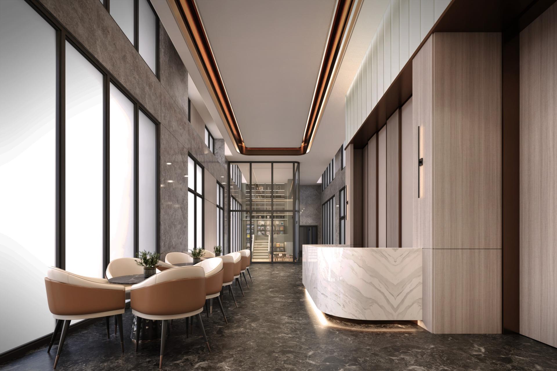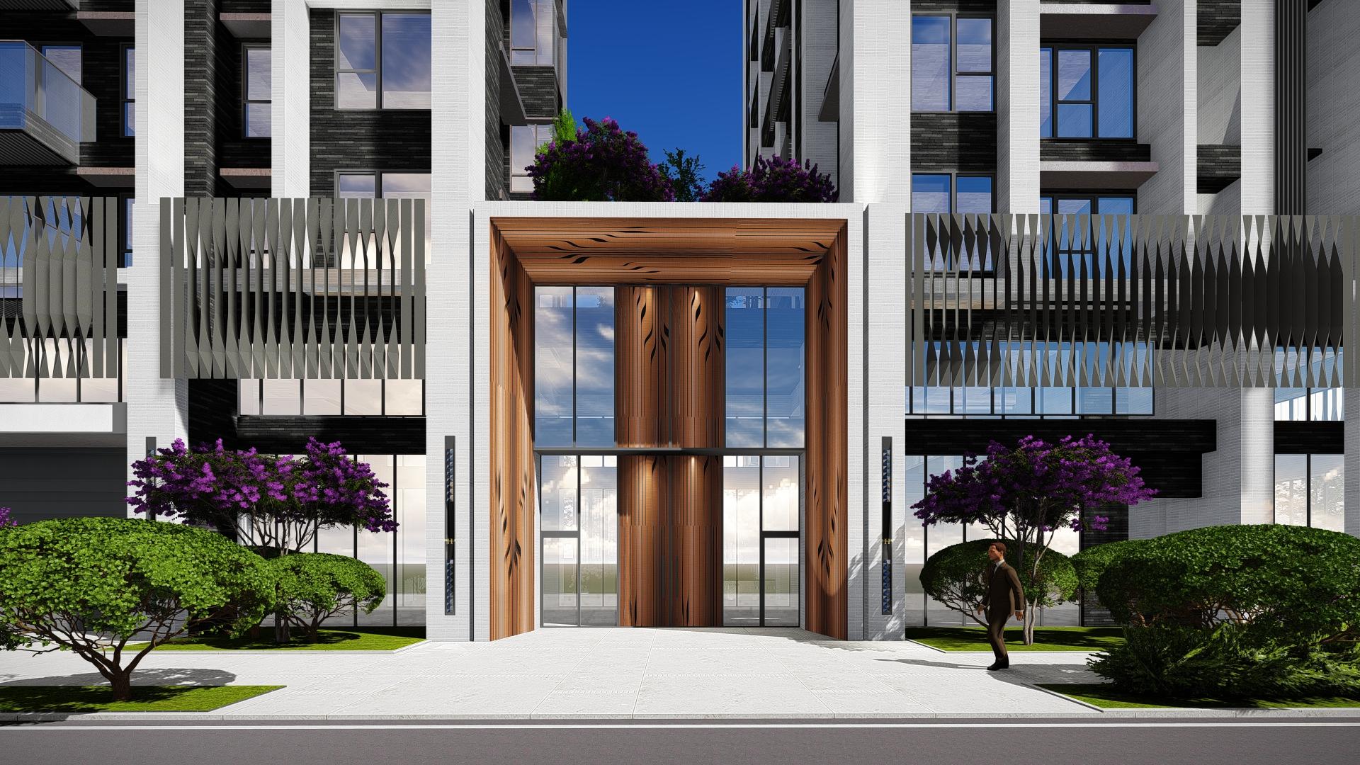 The architecture reflects a dialogue between strength and serenity. A sculptural wooden entry frame welcomes residents with its soft, flowing lines, evoking the warmth of homecoming. The building façades combine hand-laid dark bricks with light-toned ceramic tiles, creating a rich visual texture that responds to sunlight throughout the day. Vertical metal fins shimmer like reeds in the wind, layering shadow and light into the urban streetscape.