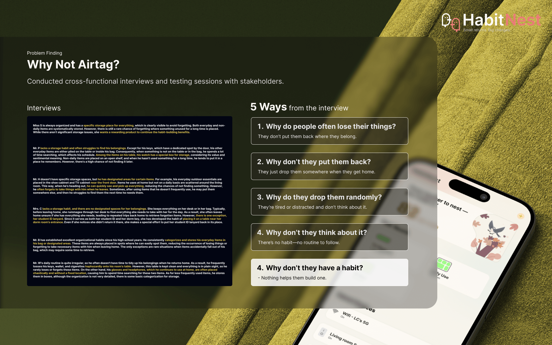 The smart organizing system HabitNest emerged from multiple research methods to solve the real root problem of daily clutter by guiding users to develop the habit of returning items instead of locating lost items. The HabitNest system combines a tray with smart lighting features, home automation capabilities, and mobile application connectivity to guide users through their daily routines with a focus on timing and consistency, while minimizing effort to develop sustainable organizational habits. The system provides gentle alerts, individualized progress reports, and community support to users. HabitNest transforms regular daily activities into lasting habits that users can sustain.