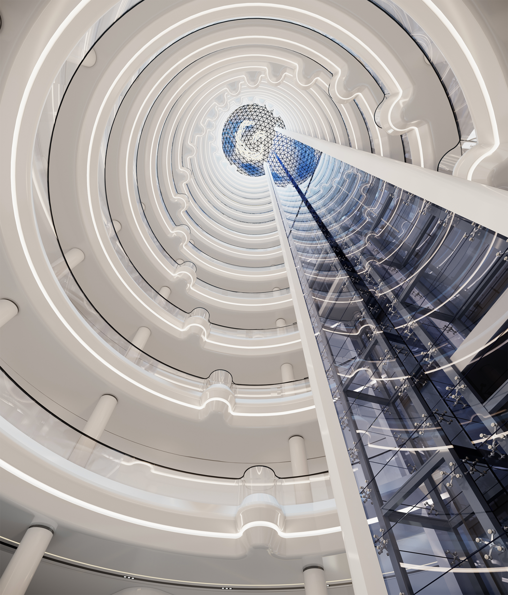 This project is the 6# R&D office building of Guangdong Sansheng Pharmaceutical Co., Ltd, which consists of a 6-storey podium and an 11-storey tower, with a modern style of glass curtain wall, and the architectural design is positioned as a self-constructed, self-use R&D office building. The design combines the three themes of Sansheng Pharmaceuticals, “Cherish Life, Focus on Survival, and Create Life”; and extends through the three themes - the Wheel of Life, the Order of Survival, and the Glamour of Life; and evolves the elements and extracts the colors, and integrates the extracted elements and colors into our whole design; The NDA of Sansheng to improve the quality of life of patients with high quality medicines for the benefit of human health was integrated into the interior design. For the design of the sightseeing elevator area in the atrium, we hope to create a sense of futuristic technology to fit in with the positioning of the pharmaceutical company's business, and we used a sequential spiral in the design to present it, while controlling the cost.