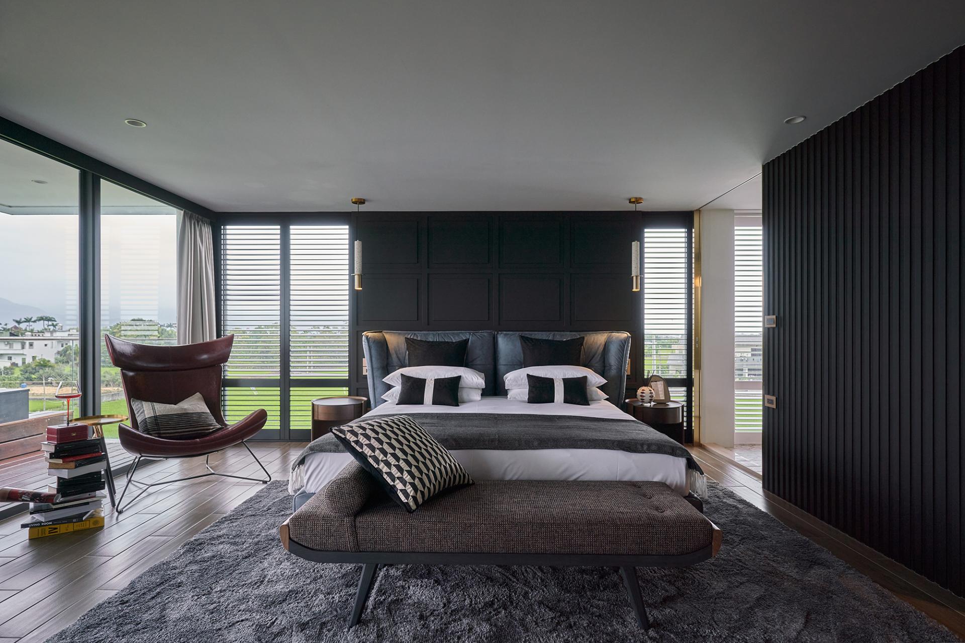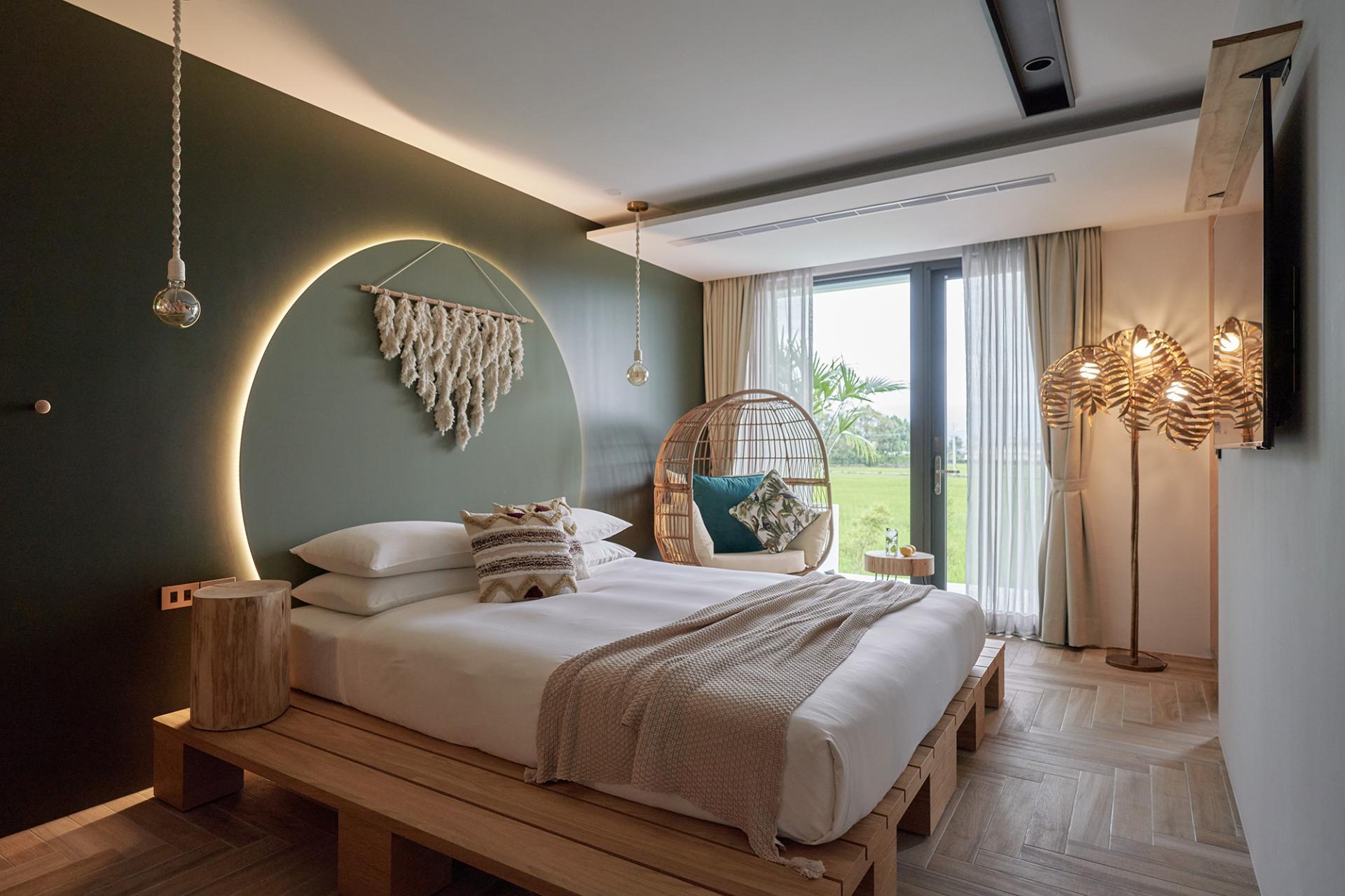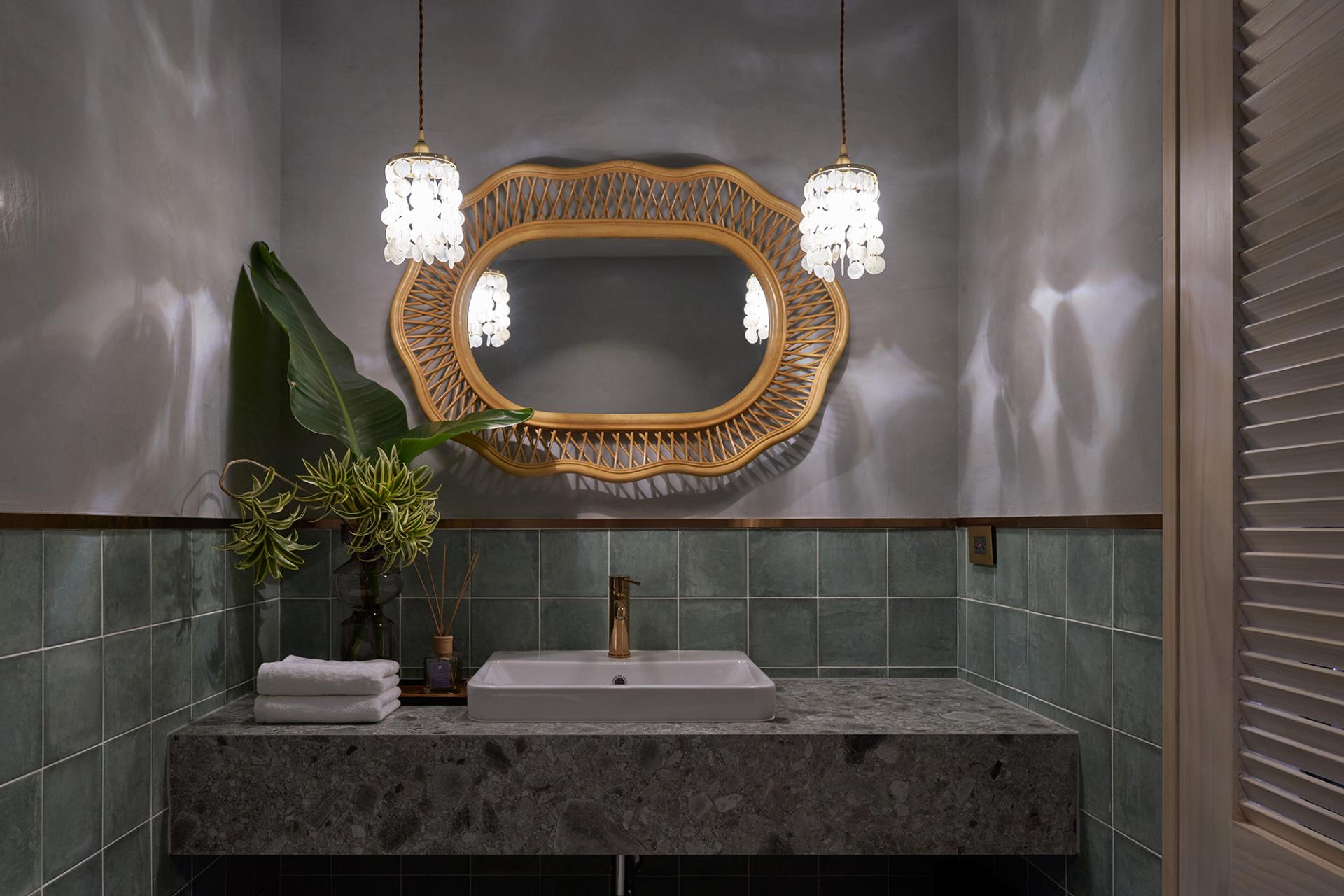 Transitioning into the Jungle Room, one will be immediately enveloped in a Bohemian-inspired haven. The vibrant tropical banana leaf wallpaper envelops the walls, while whimsical floor lamps shaped like palm trees add a playful touch. A custom-made wooden bed frame, thoughtfully designed with rounded corners, provides both visual softness and practical safety for an inviting retreat. The blue-toned room features a sophisticated multi-layered color scheme of blue and gray, enhanced by a sumptuous velvet headboard that pairs elegantly with a bronze coffee table resting on a marble base. This arrangement injects an understated luxury into the space.