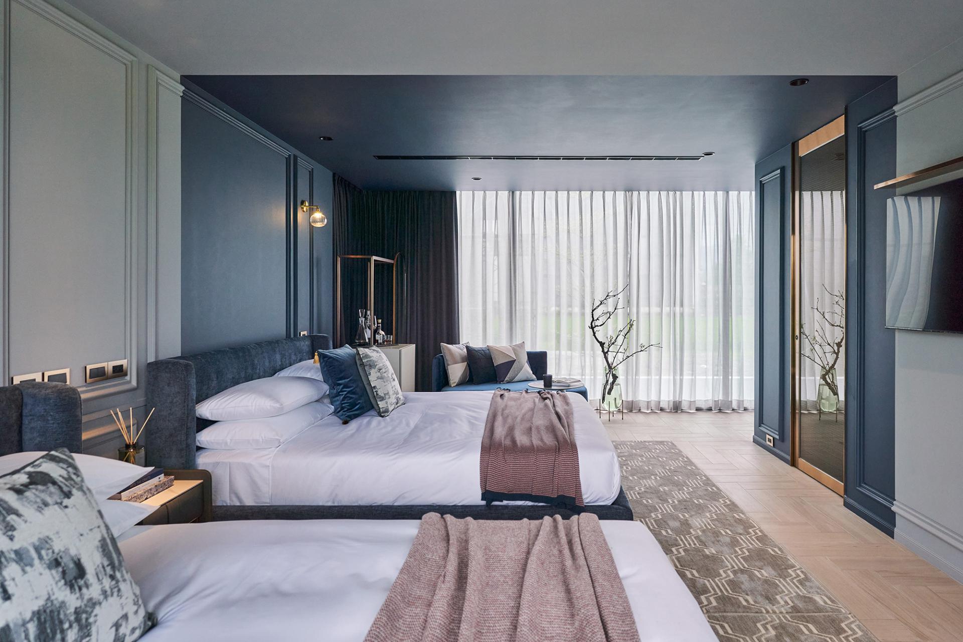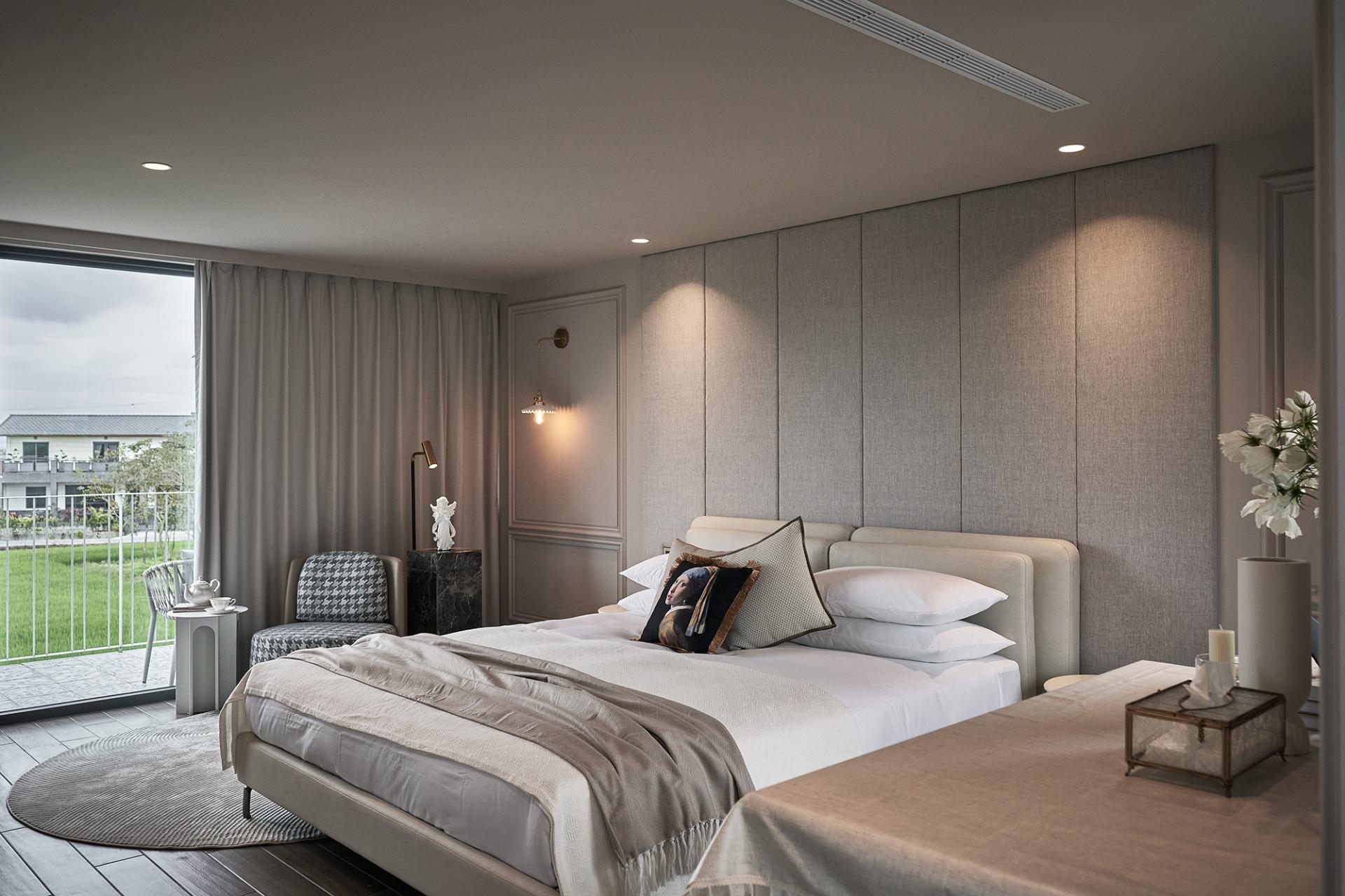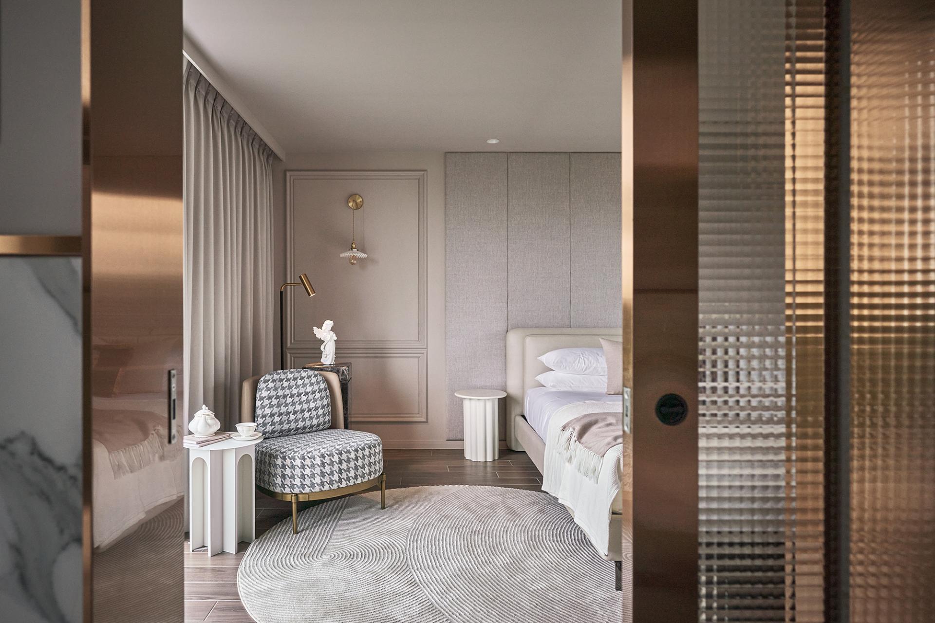 Moreover, the classical room creates a stunning fusion of French elegance and Renaissance design. Soft lotus pink walls, coupled with cream-colored upholstered headboards, exude warmth and sophistication, making this room a perfect sanctuary for relaxation.