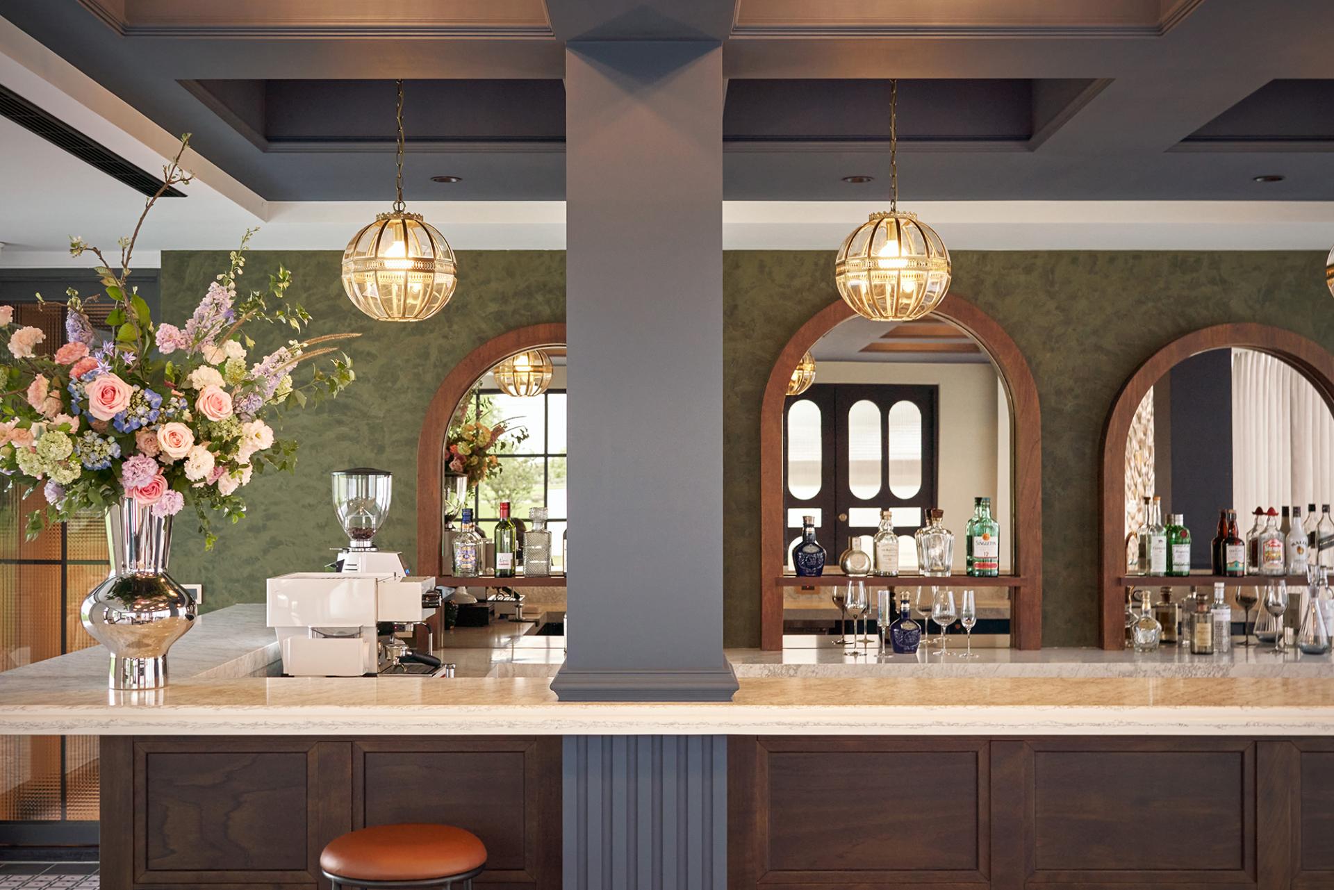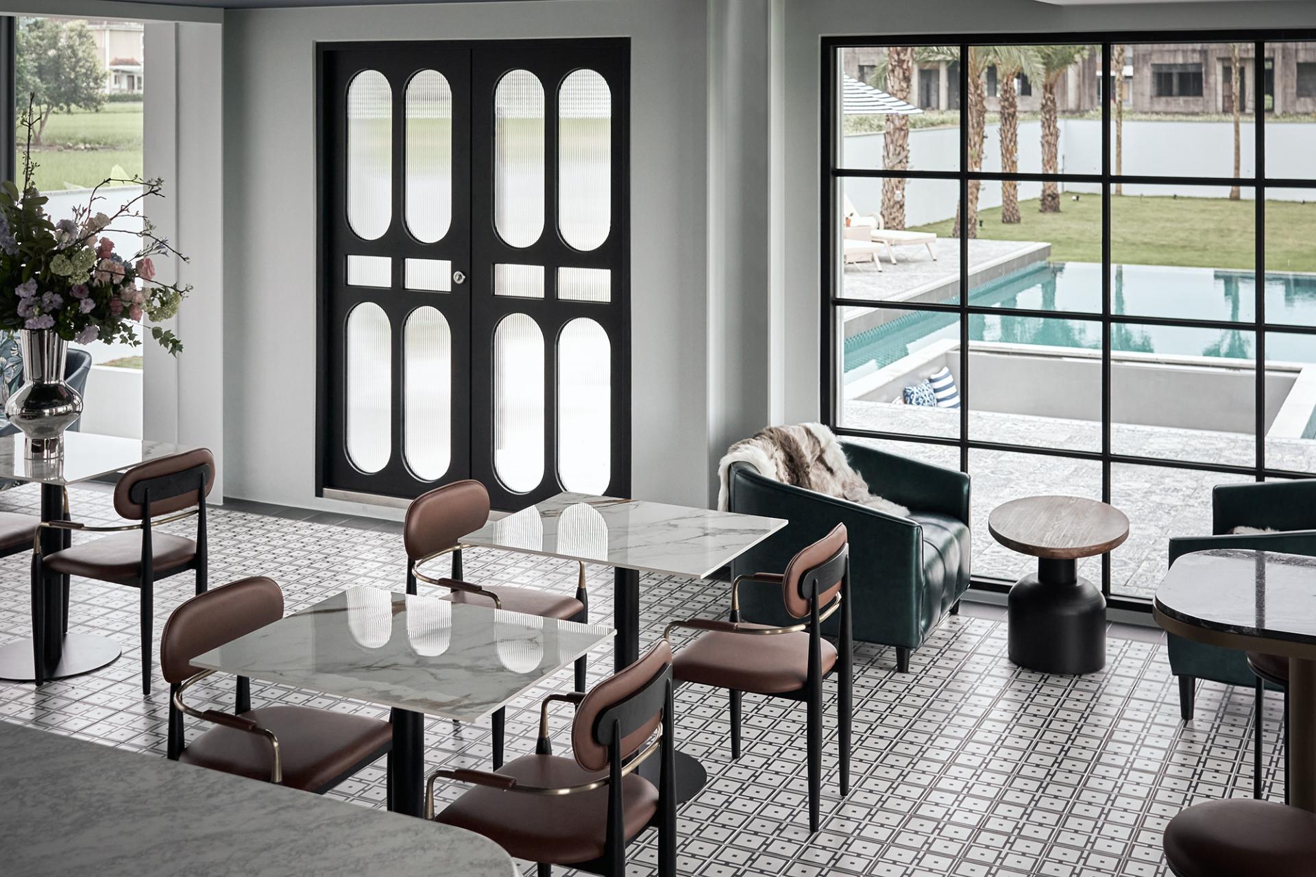 The first-floor space captivates with its retro British design, where Prussian blue elegantly connects the ceiling and columns. This rich hue is beautifully complemented by nostalgic spherical pendant lights, culminating in an inviting atmosphere enhanced by striking black-and-white patterned floor tiles. In the dining area, a stunning marble dining table takes center stage, surrounded by luxurious leather chairs that feature exquisite golden iron accents. Adding to this refined aesthetic, deep green leather-upholstered armchairs harmonize with the unique paint color of the bar area walls, creating a cohesive look throughout the space.