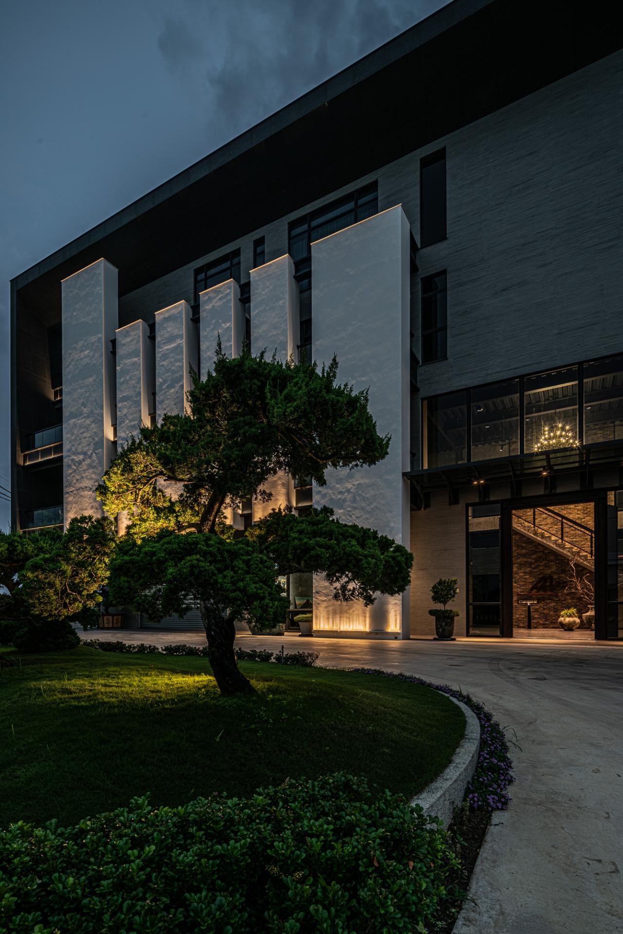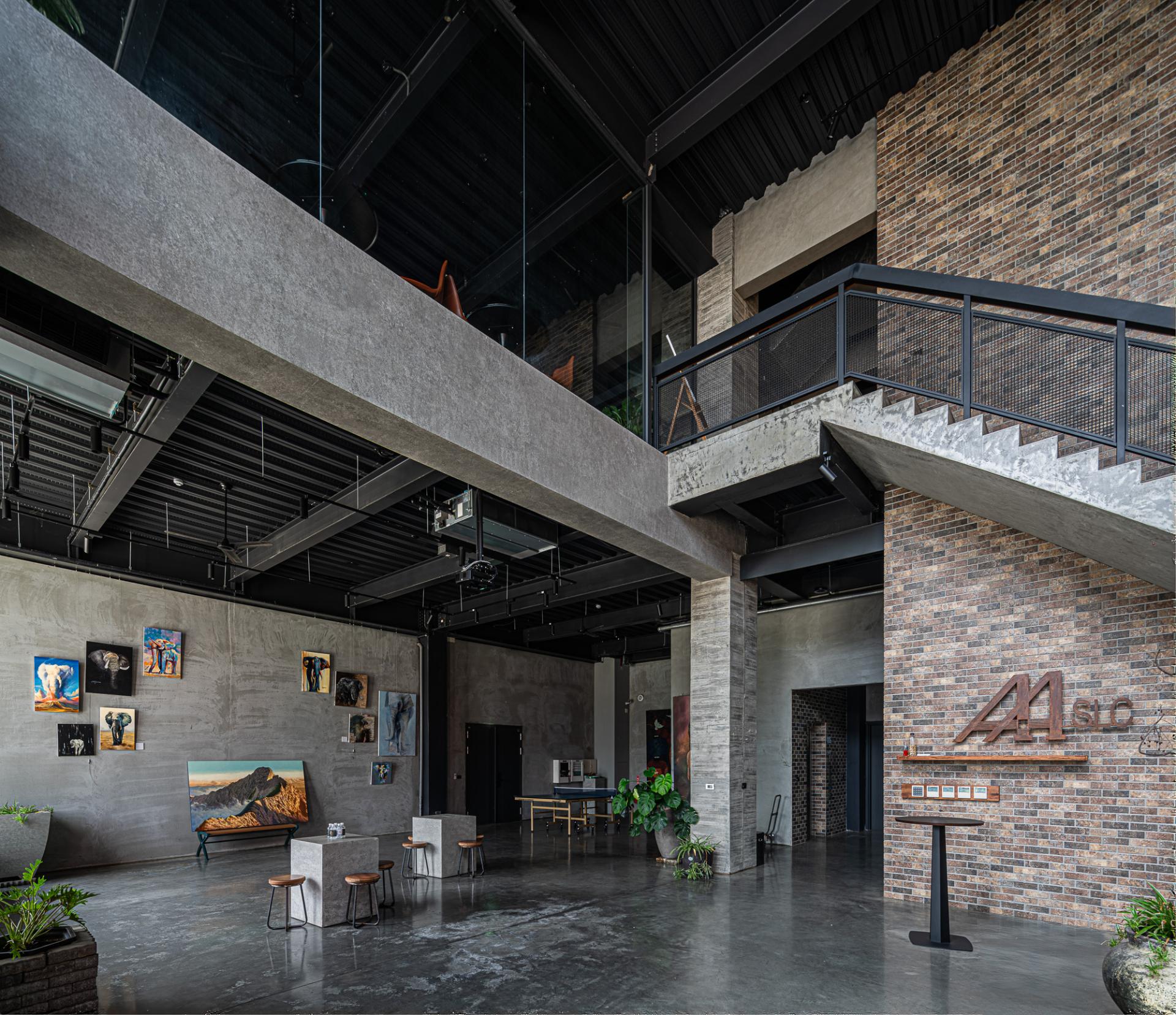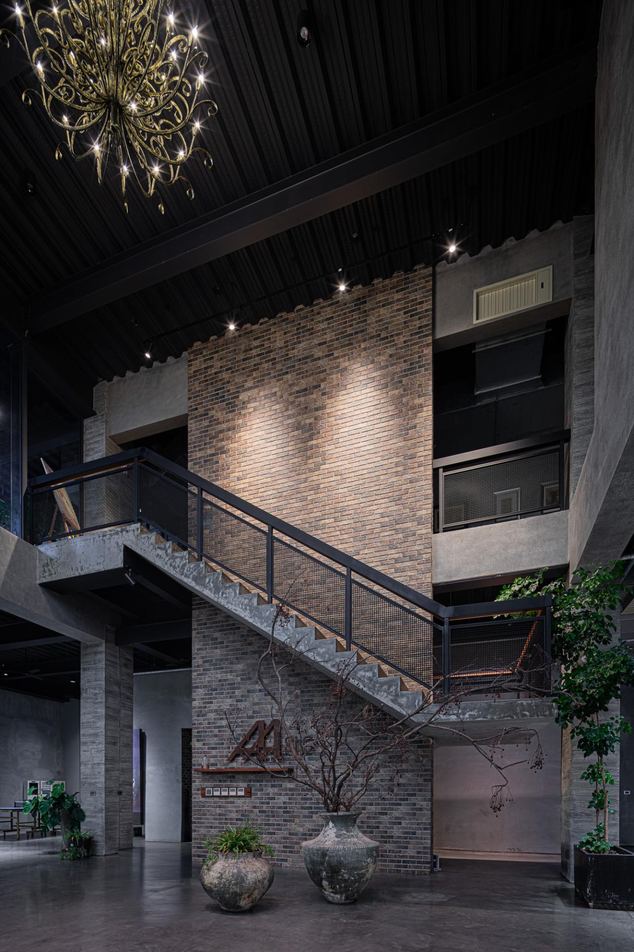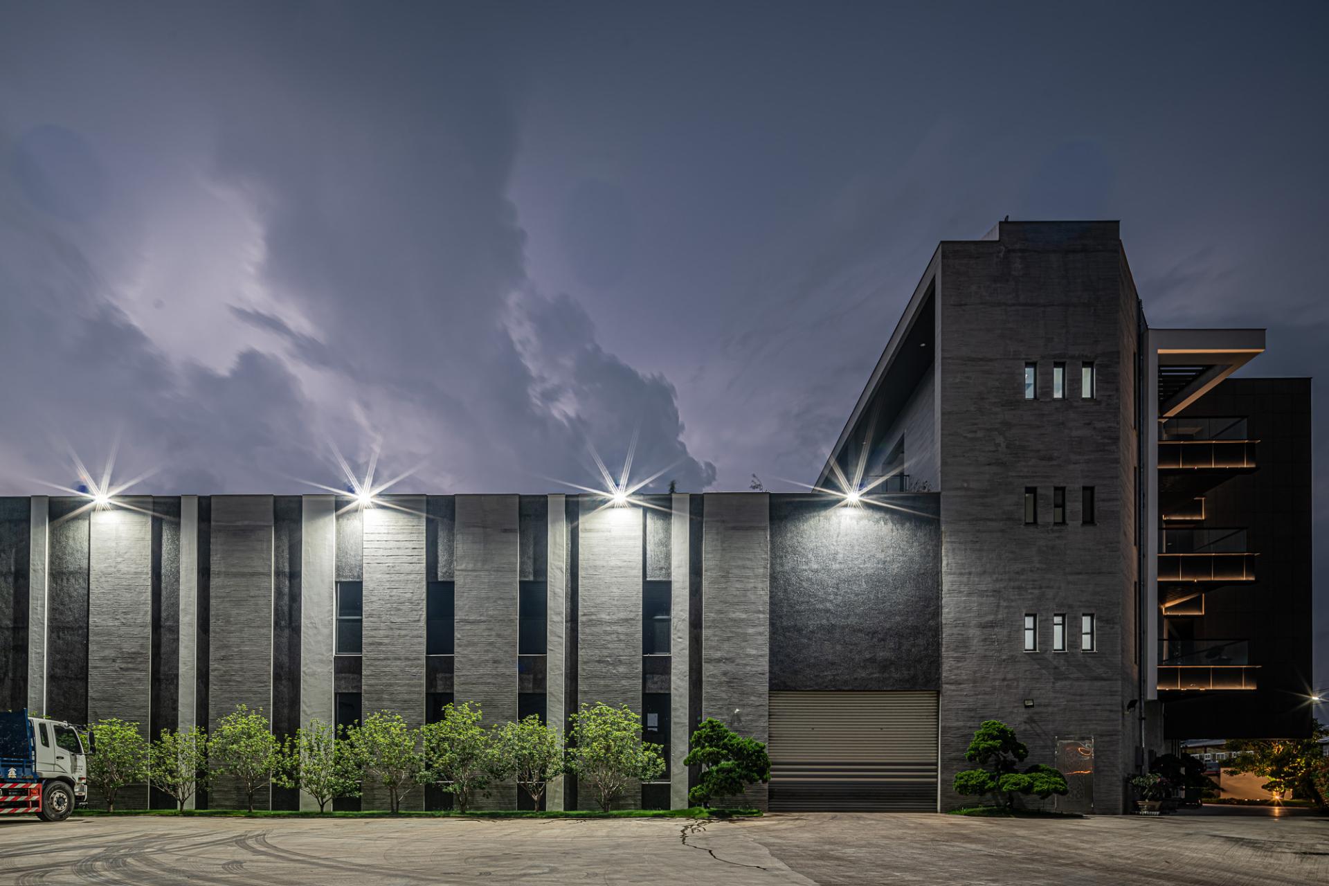 This Factory Office redefines the industrial typology, embodying a client’s vision for a sophisticated corporate identity that harmoniously blends a rich casting heritage with a forward-thinking ethos. Situated on a prominent corner lot, the design leverages its visibility with a dynamic and meticulously composed facade, presenting a refined presence from every approach. The core concept centers on a harmonious interplay of robust materiality, functional clarity, and artistic integration, culminating in a workplace that is both efficient and inspiring.The building is thoughtfully articulated into distinct yet interconnected volumes. The front, a four-story structure, houses the corporate offices, defined by a strong dark grey stone frame contrasted with crisp white, vertically oriented masses, projecting stability and contemporary dynamism. Large glazed openings ensure ample natural light within these workspaces. The rear double-height volume accommodates the primary workshop, featuring rhythmic fenestration that visually coheres with the office block while addressing industrial operational needs. Strategic entrances optimize the separation of administrative and operational flows.Internally, a welcoming and sophisticated atmosphere prevails, particularly within the double-height entrance lobby. A striking hollow steel staircase leads to the upper office levels, complemented by a prominent tile wall adorned with the company logo. This open stair design fosters visual connectivity and a sense of airiness despite the substantial materials.The material palette carefully reflects the client's industry: dark grey stone evokes raw casting materials, while contrasting white surfaces offer a modern counterpoint. Wood-grain fair-faced concrete adds subtle warmth. The cast iron staircase and railings reinforce the industrial context, showcasing intricate craftsmanship. This robust materiality is balanced by spatial transparency and the curated display of the owner’s art collection, transforming the entry into a gallery-like experience. The project incorporates passive design principles, optimizing natural light and minimizing solar heat gain through strategic orientation and deep balconies. The client's subsequent installation of a significant photovoltaic array underscores a commitment to renewable energy. Landscaping, including greenery and a reflecting pond, enhances aesthetics and contributes to microclimate regulation, mitigating the local hot climate. The overall design transcends purely functional considerations, establishing a positive and visually engaging presence within the industrial context.