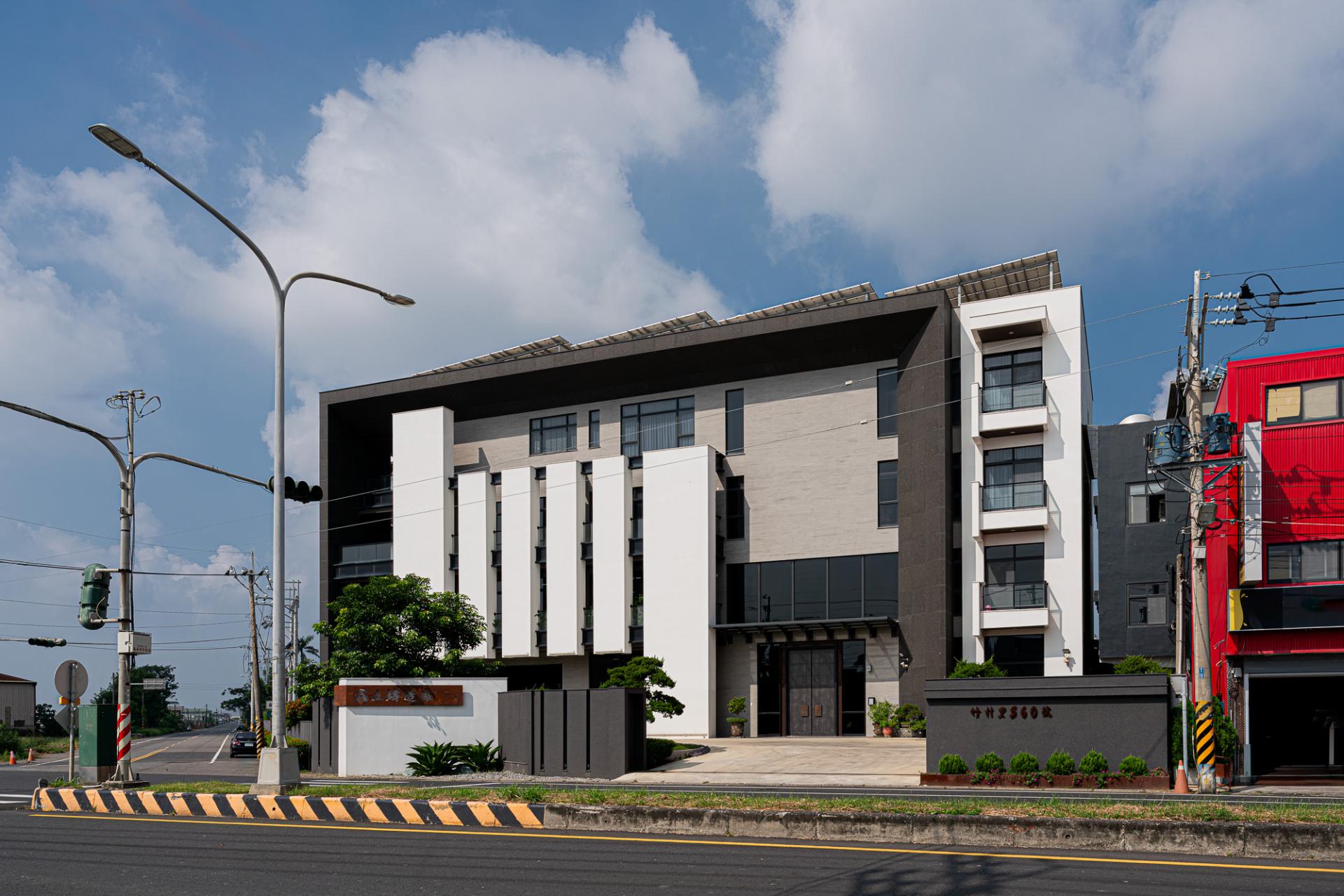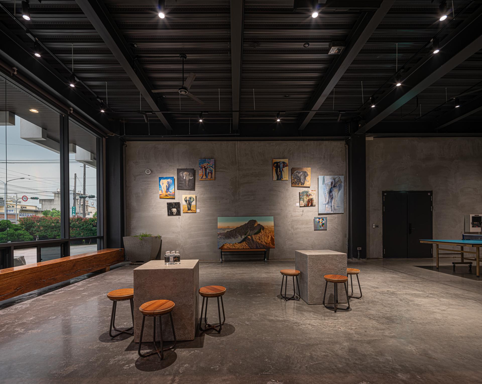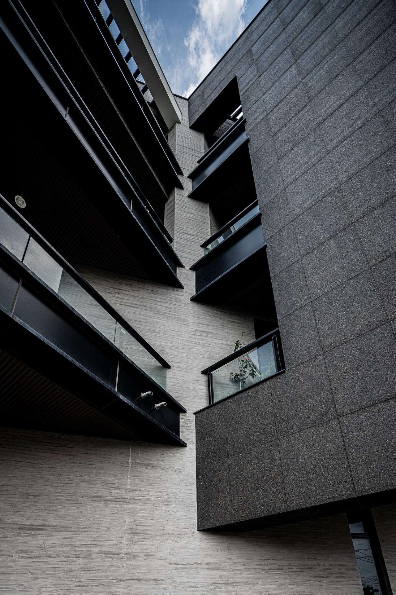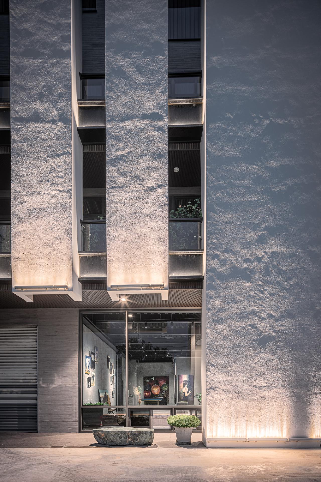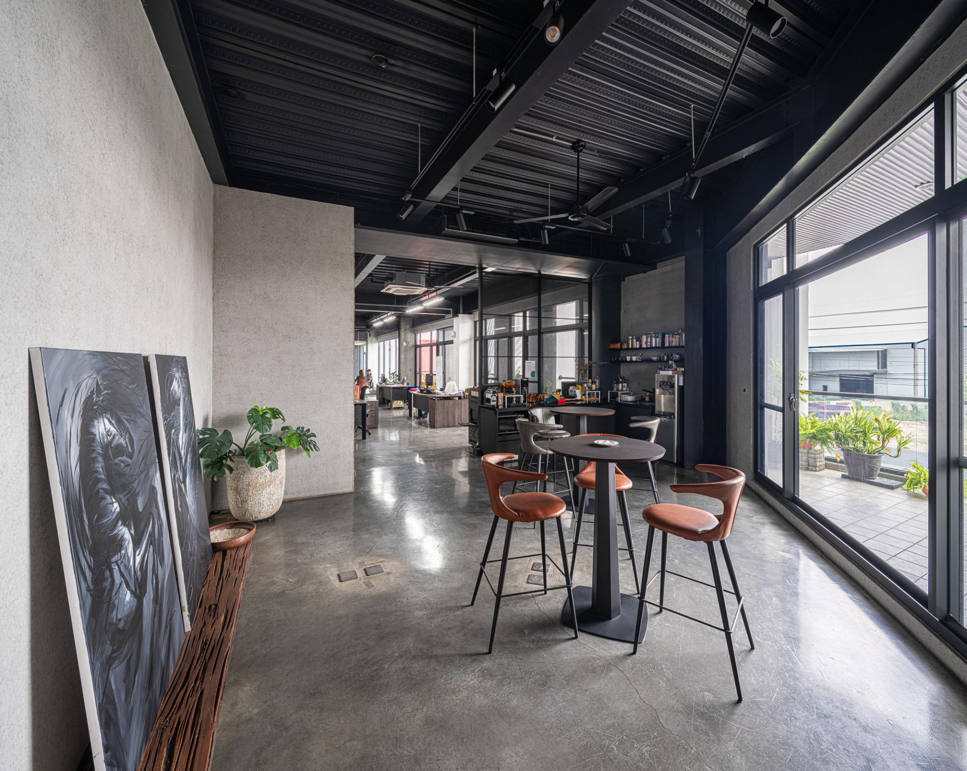 This Factory Office redefines the industrial typology, embodying a client’s vision for a sophisticated corporate identity that harmoniously blends a rich casting heritage with a forward-thinking ethos. Situated on a prominent corner lot, the design leverages its visibility with a dynamic and meticulously composed facade, presenting a refined presence from every approach. The core concept centers on a harmonious interplay of robust materiality, functional clarity, and artistic integration, culminating in a workplace that is both efficient and inspiring.The building is thoughtfully articulated into distinct yet interconnected volumes. The front, a four-story structure, houses the corporate offices, defined by a strong dark grey stone frame contrasted with crisp white, vertically oriented masses, projecting stability and contemporary dynamism. Large glazed openings ensure ample natural light within these workspaces. The rear double-height volume accommodates the primary workshop, featuring rhythmic fenestration that visually coheres with the office block while addressing industrial operational needs. Strategic entrances optimize the separation of administrative and operational flows.Internally, a welcoming and sophisticated atmosphere prevails, particularly within the double-height entrance lobby. A striking hollow steel staircase leads to the upper office levels, complemented by a prominent tile wall adorned with the company logo. This open stair design fosters visual connectivity and a sense of airiness despite the substantial materials.The material palette carefully reflects the client's industry: dark grey stone evokes raw casting materials, while contrasting white surfaces offer a modern counterpoint. Wood-grain fair-faced concrete adds subtle warmth. The cast iron staircase and railings reinforce the industrial context, showcasing intricate craftsmanship. This robust materiality is balanced by spatial transparency and the curated display of the owner’s art collection, transforming the entry into a gallery-like experience. The project incorporates passive design principles, optimizing natural light and minimizing solar heat gain through strategic orientation and deep balconies. The client's subsequent installation of a significant photovoltaic array underscores a commitment to renewable energy. Landscaping, including greenery and a reflecting pond, enhances aesthetics and contributes to microclimate regulation, mitigating the local hot climate. The overall design transcends purely functional considerations, establishing a positive and visually engaging presence within the industrial context.
