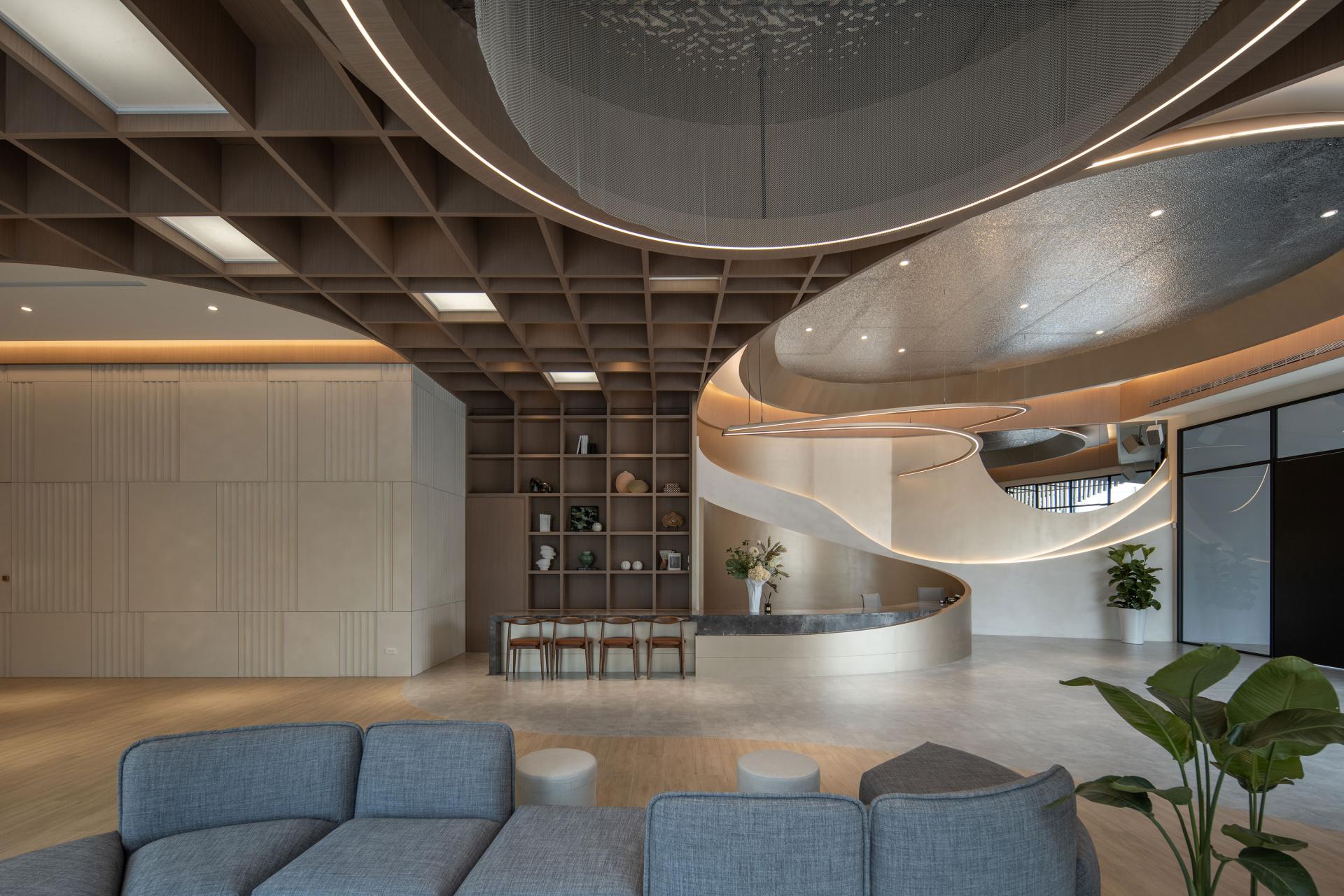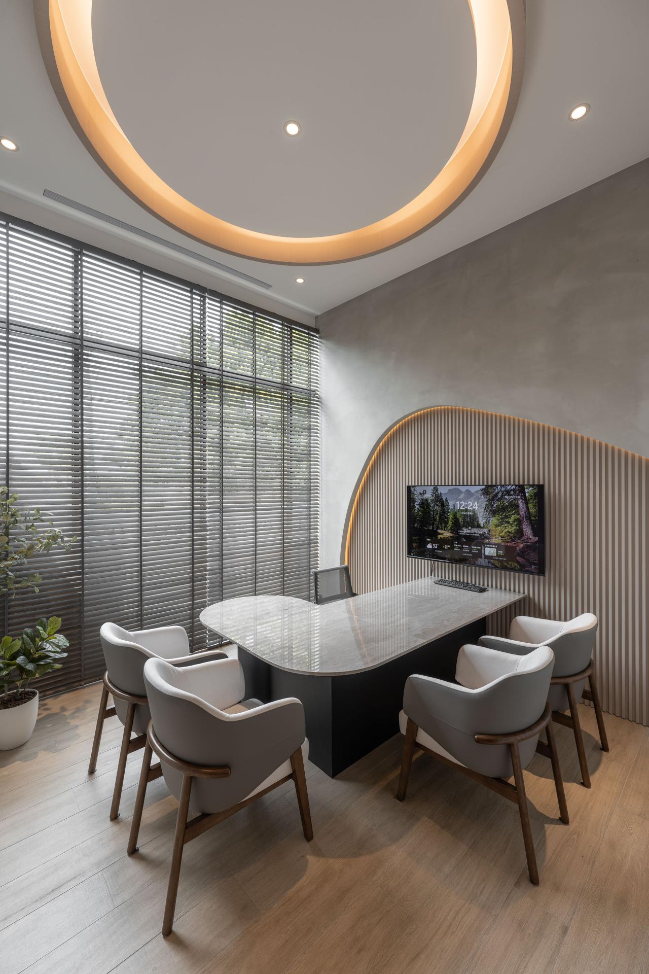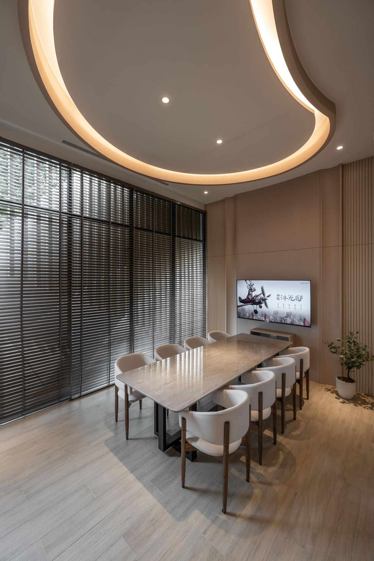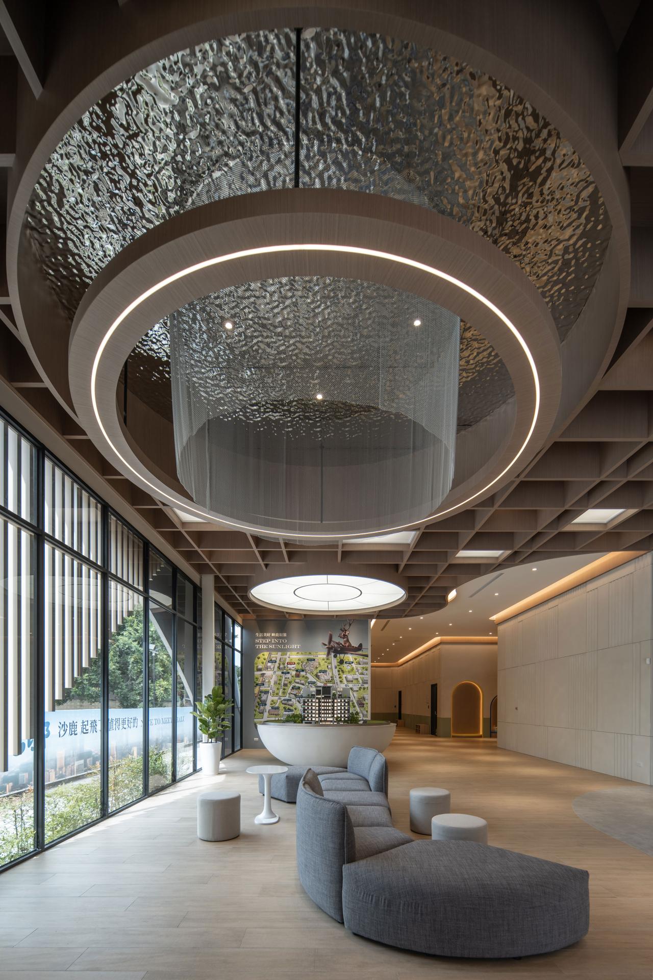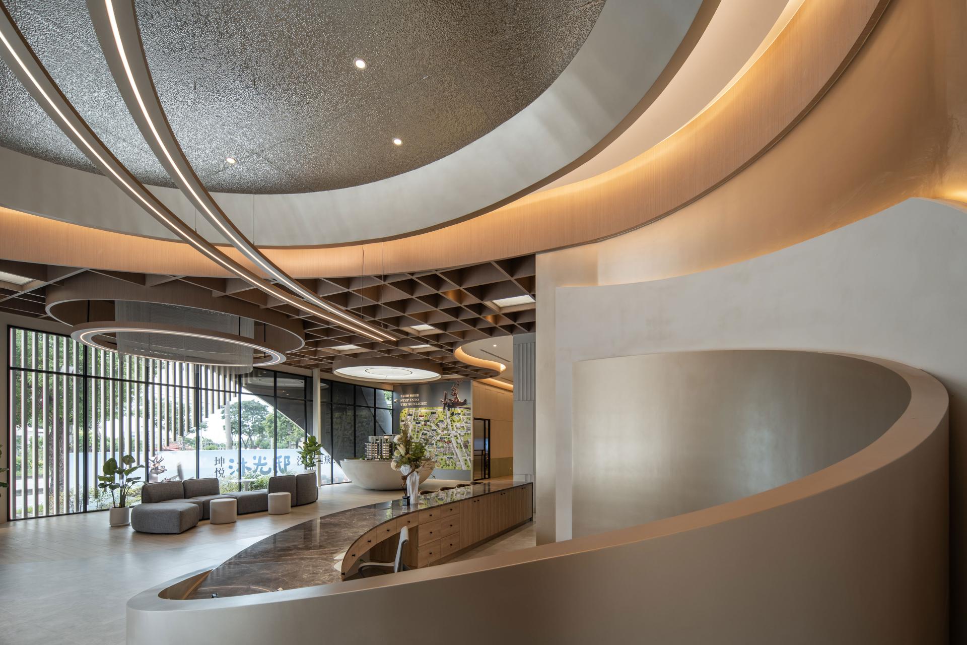 Responding to the elongated, almost constellation-like plot, the building's parallelogram footprint maximizes frontage and visibility. A dramatic, extended driveway culminates in a sculptural screen, illuminated at night to draw attention from the adjacent roadway. This linearity is further echoed in the integration of a pre-existing, large-scale steel dog sculpture by a renowned local artist, whose hollow form and imposing presence become a focal point of the landscape design. This dialogue between the building and the sculpture establishes a cohesive visual language that carries through to the interior. Internally, the design embraces curves and flowing lines to soften the space and create a sense of warmth and movement. The ceiling becomes a canvas for architectural expression, featuring a central, disc-shaped lighting element evocative of a flying saucer, complemented by undulating ripple metal panels and curved lighting matrices. These elements delineate distinct zones within the open-plan layout – reception, negotiation, and model viewing areas – while maintaining visual connectivity and minimizing staffing needs. The futuristic aesthetic subtly nods to Shalun's burgeoning tech industry, particularly the arrival of TSMC, aligning with the aspirations of the target demographic.