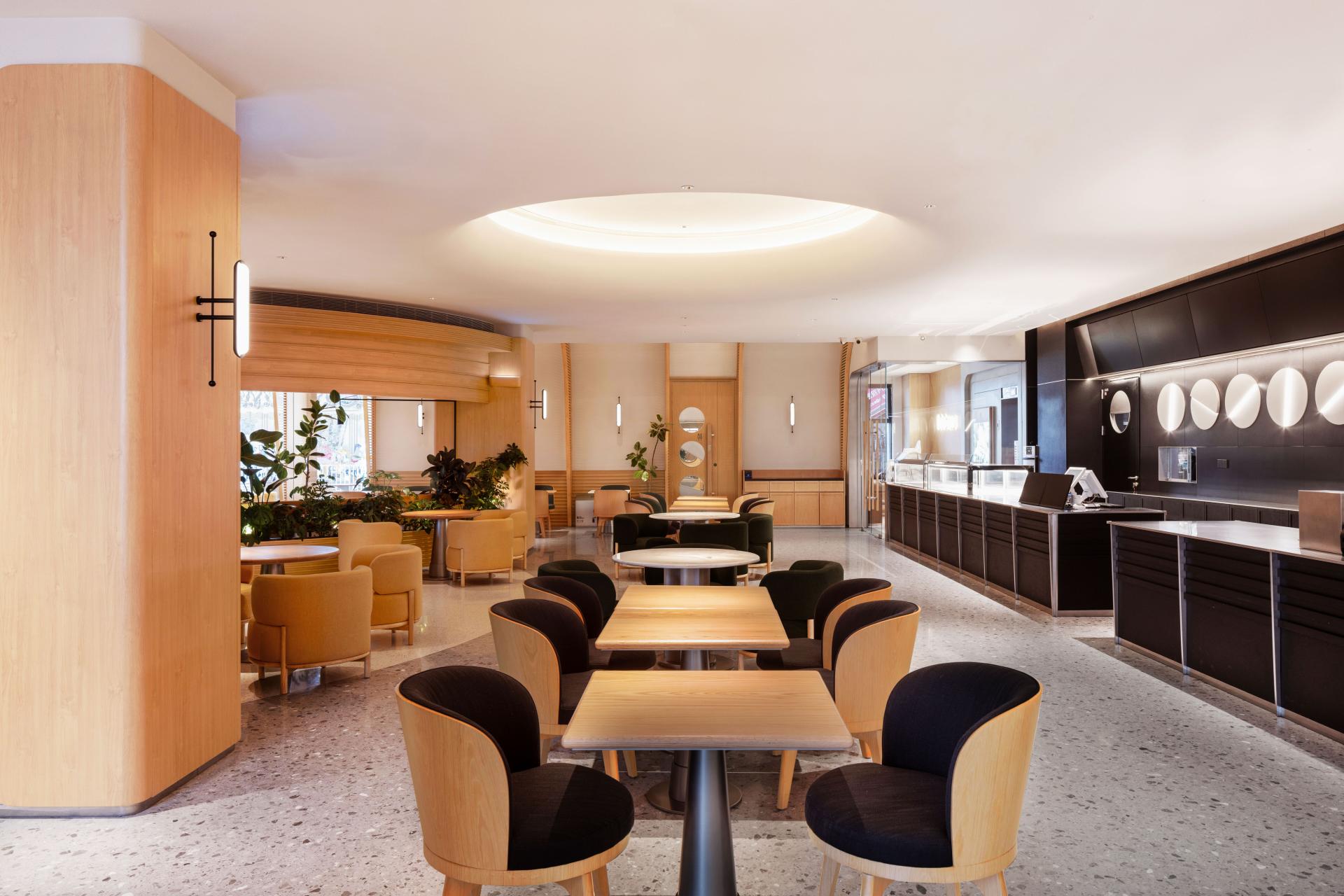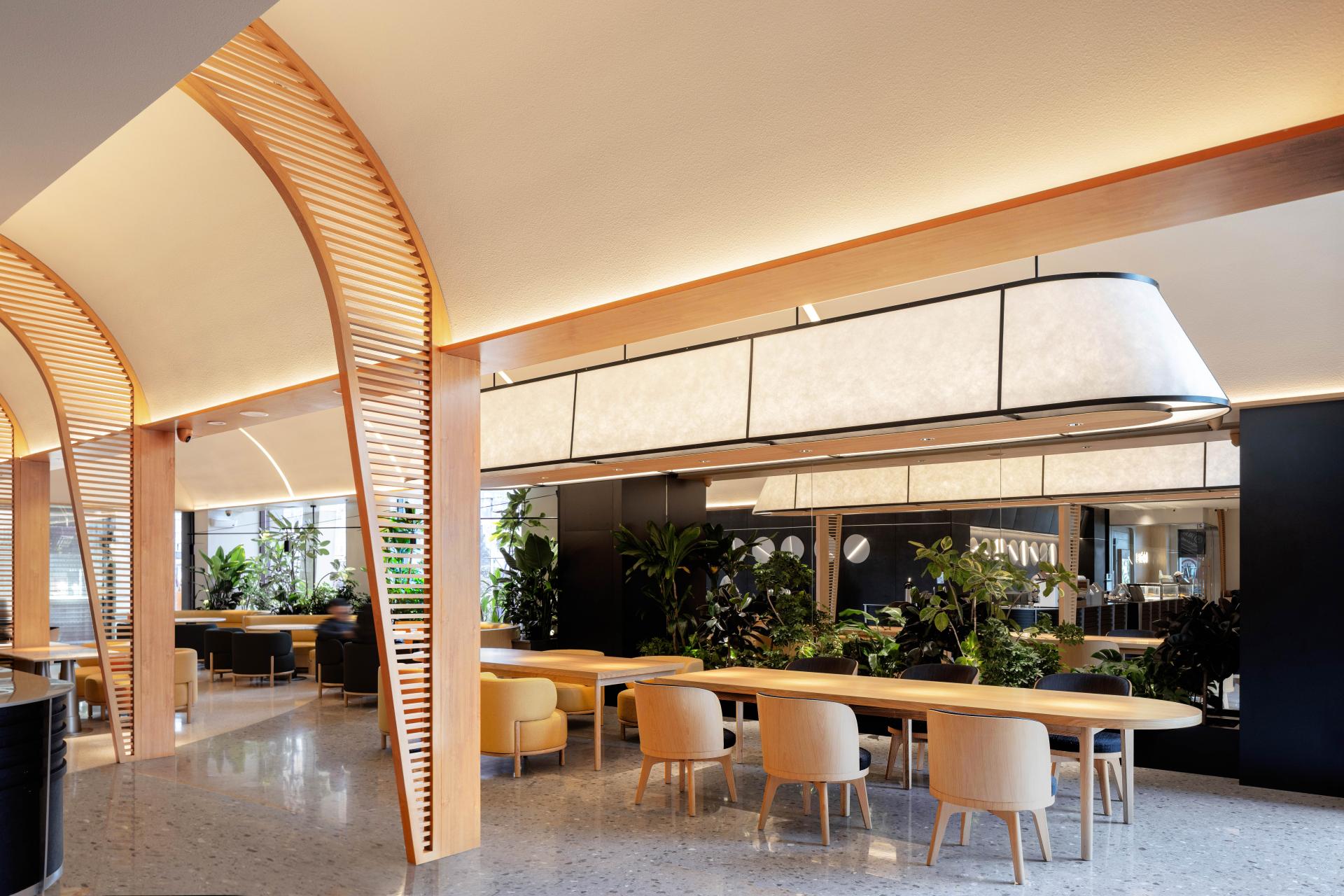 The bar is built like a stage: matte-black track spots pin the barista’s pour-over ritual in a cone of light. Seating unfolds in three movements—window-side stools for solo laptop sessions, a central communal oak table that can split or extend, and a sunken lounge layered with Moroccan rugs and floor lamps ready to turn any evening into a salon. After dark, 2700-Kelvin amber light throws dappled shadows from the greenery, turning the room into a breathing greenhouse hidden inside the city’s concrete heart.