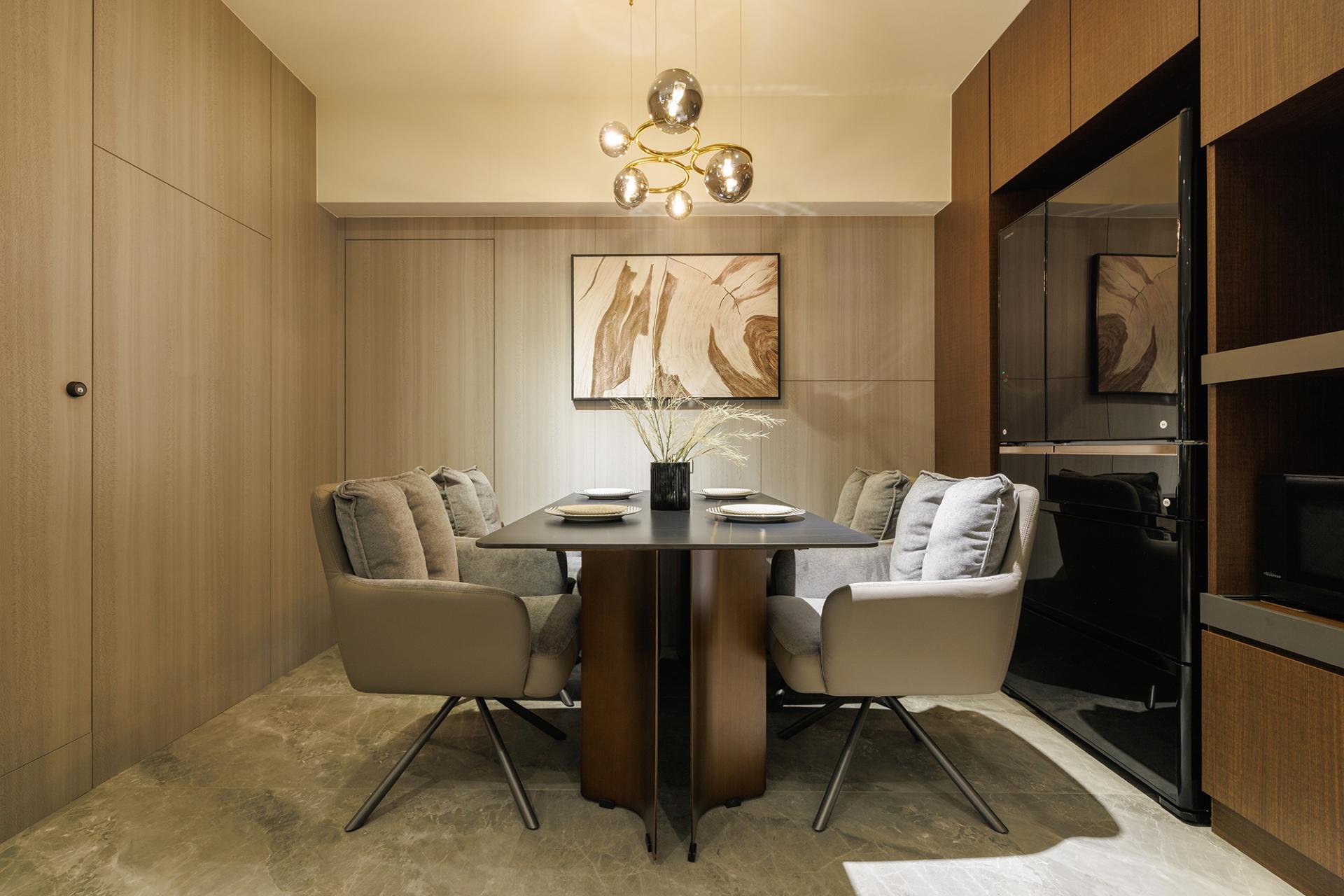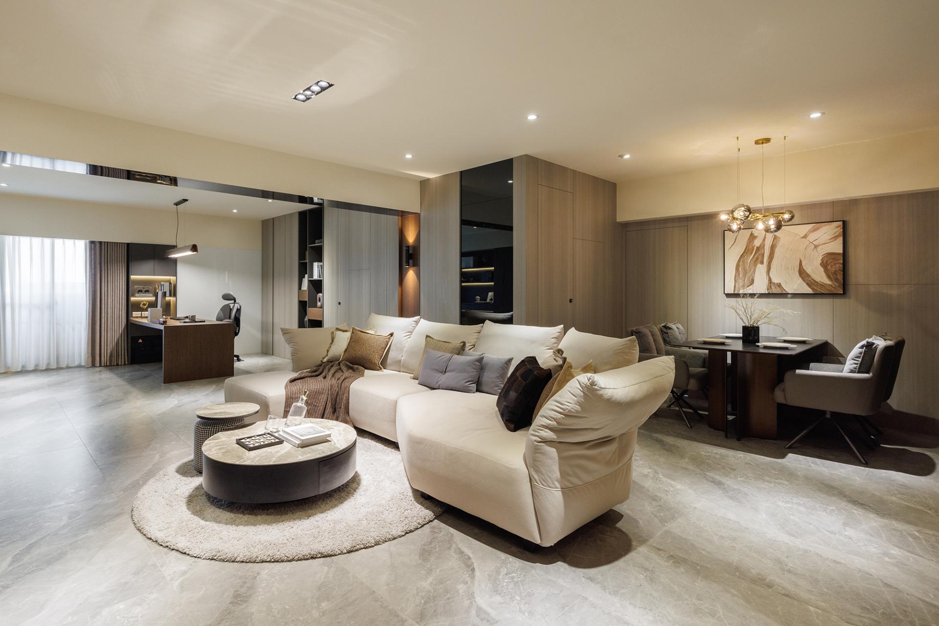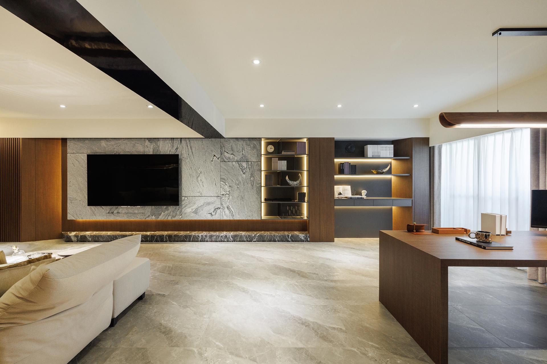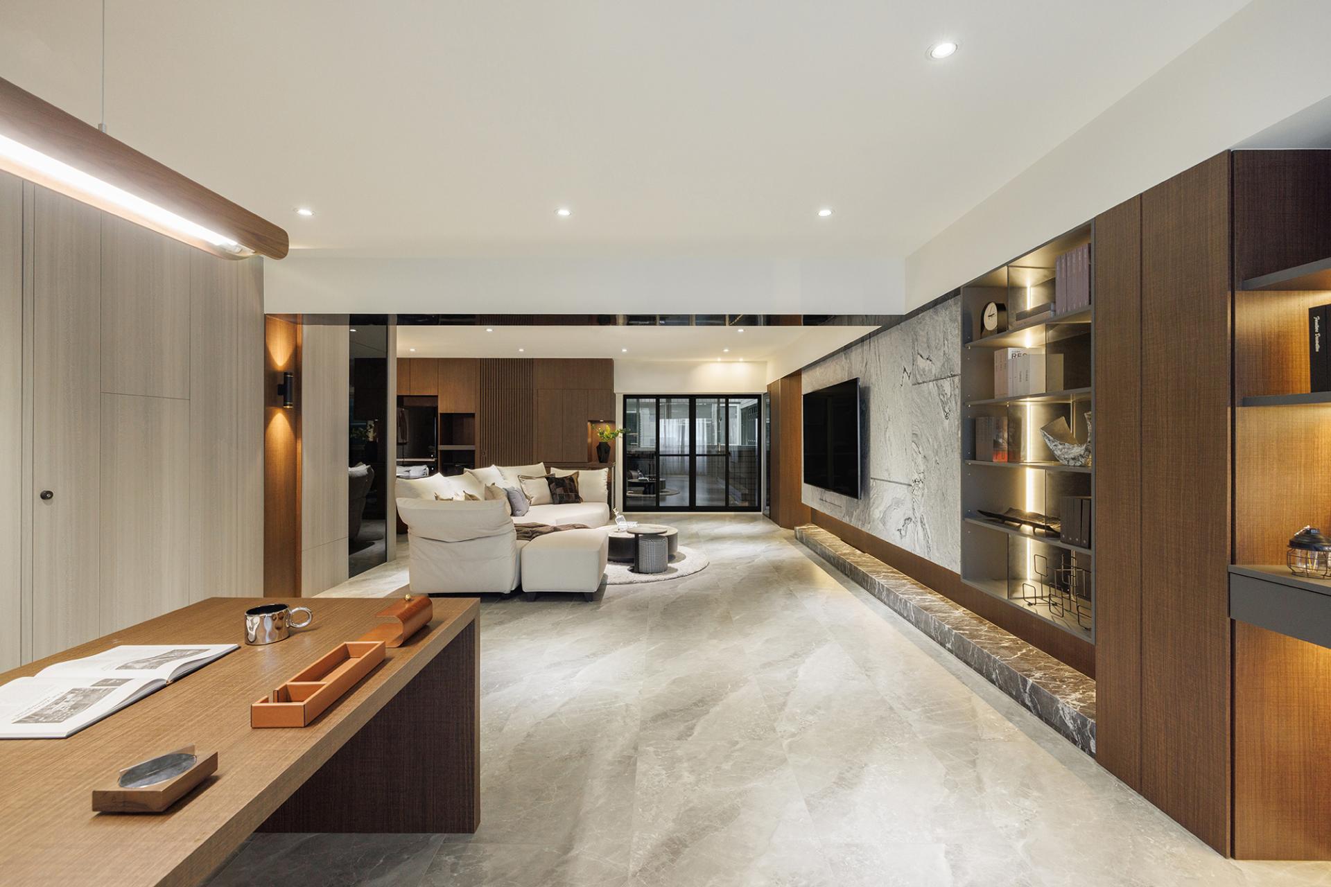 The entrance hall serves as a welcoming gateway, seamlessly integrating storage solutions and facilitating a visual transition through thoughtfully designed hidden cabinets. This design establishes a sense of order while also creating a buffer zone that enhances daily living. Flowing gracefully from the entrance, the open-plan layout in the public area masterfully combines the functionalities of a dining room, study, and living room. Through the strategic placement of furniture and architectural beams, various spaces are defined yet remain interconnected. As a result, light and air circulate freely, illuminating the space and fostering a bright, spacious atmosphere that enhances the overall living experience.