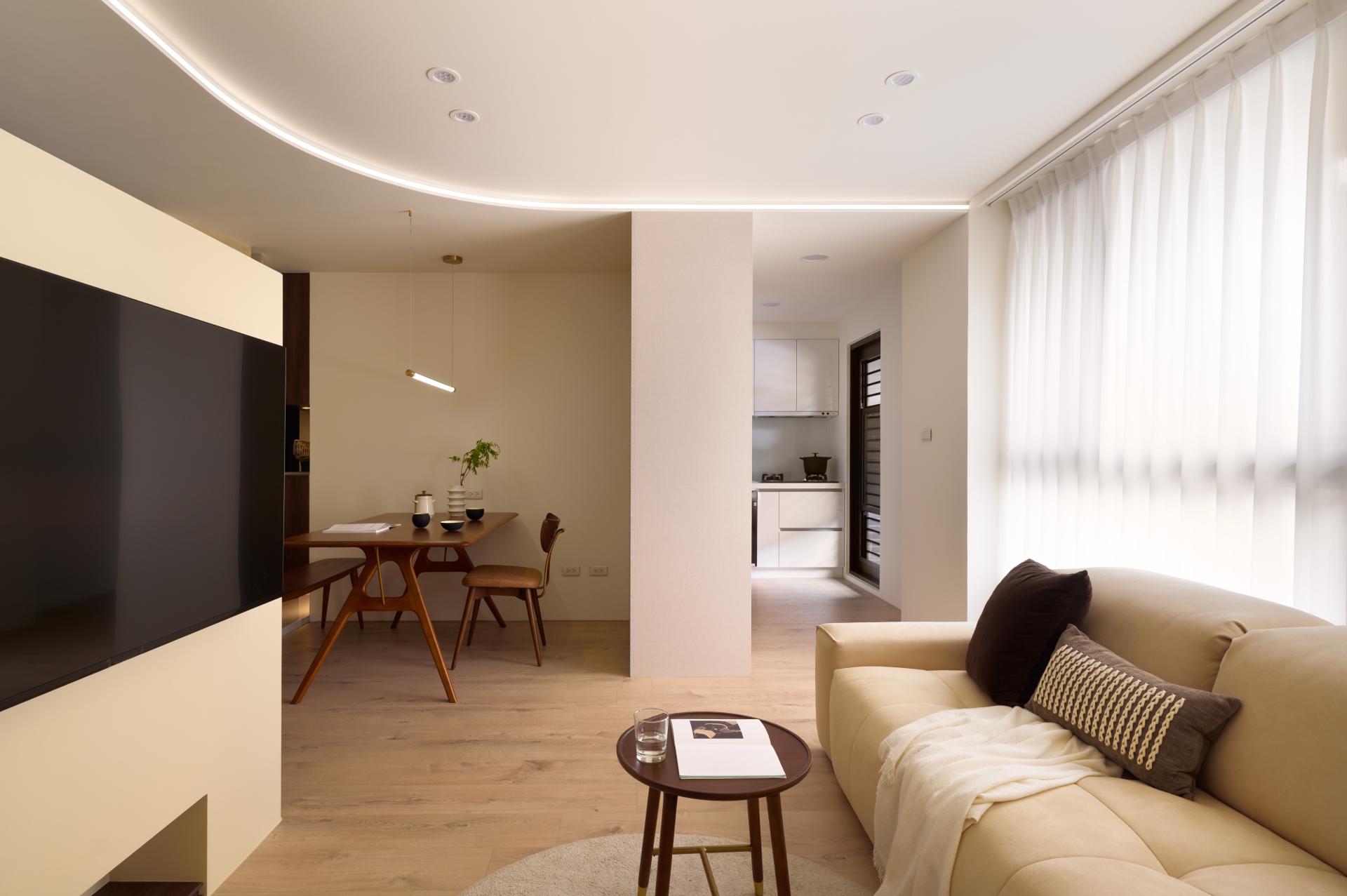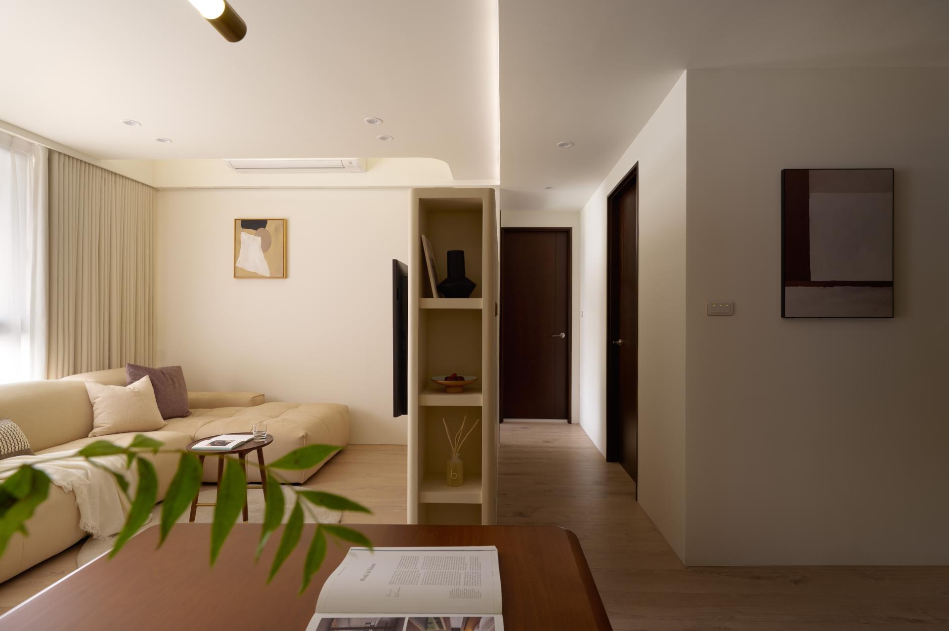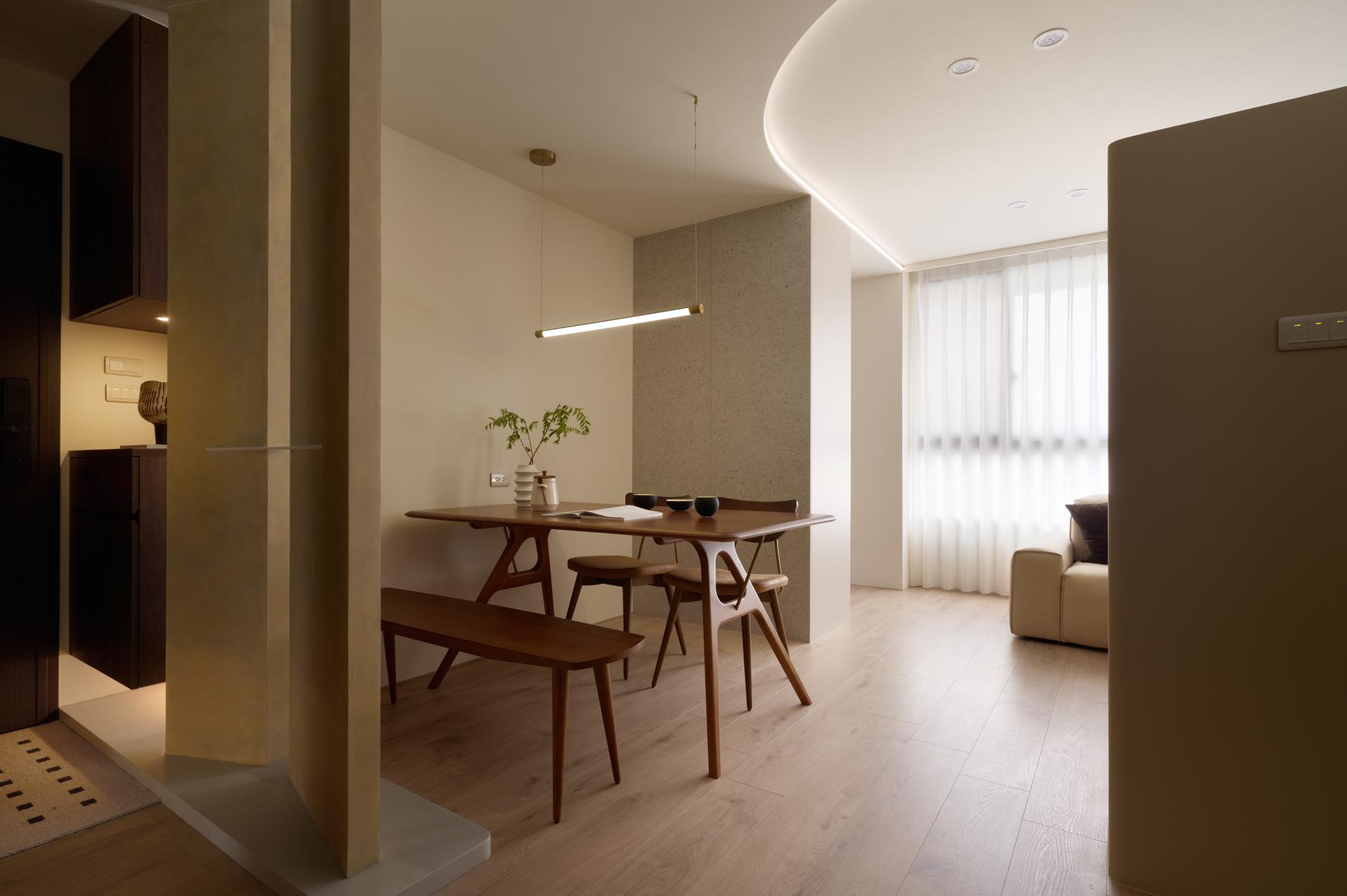 主視覺選用接近日光色溫的柔和跳色與藝術塗料,與自然光產生共鳴,形塑內外光感一致的空間調性,進一步營造溫潤、寧靜且充滿生活質感的氛圍。