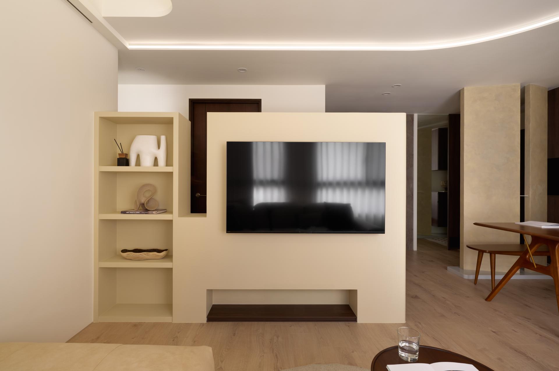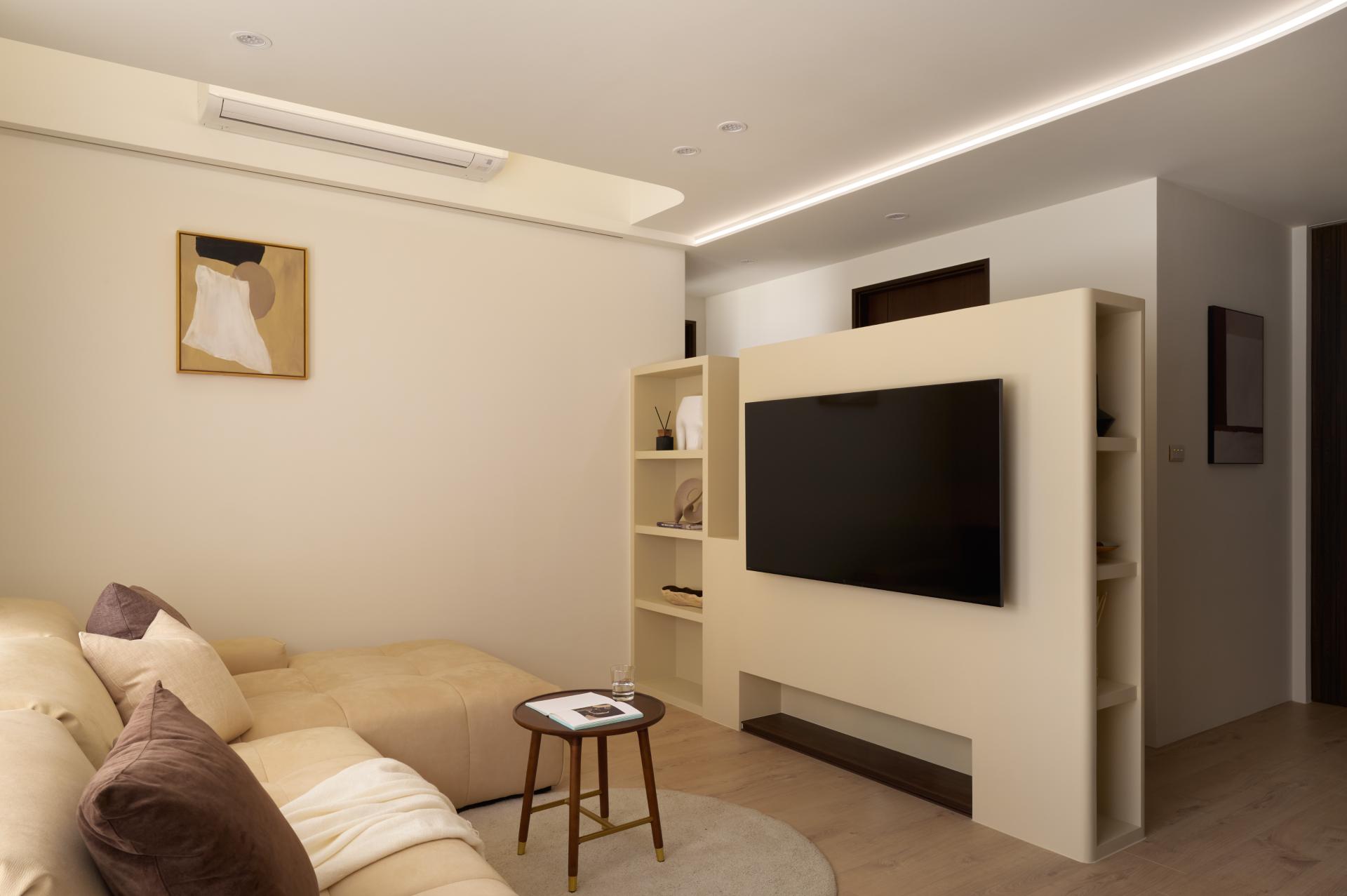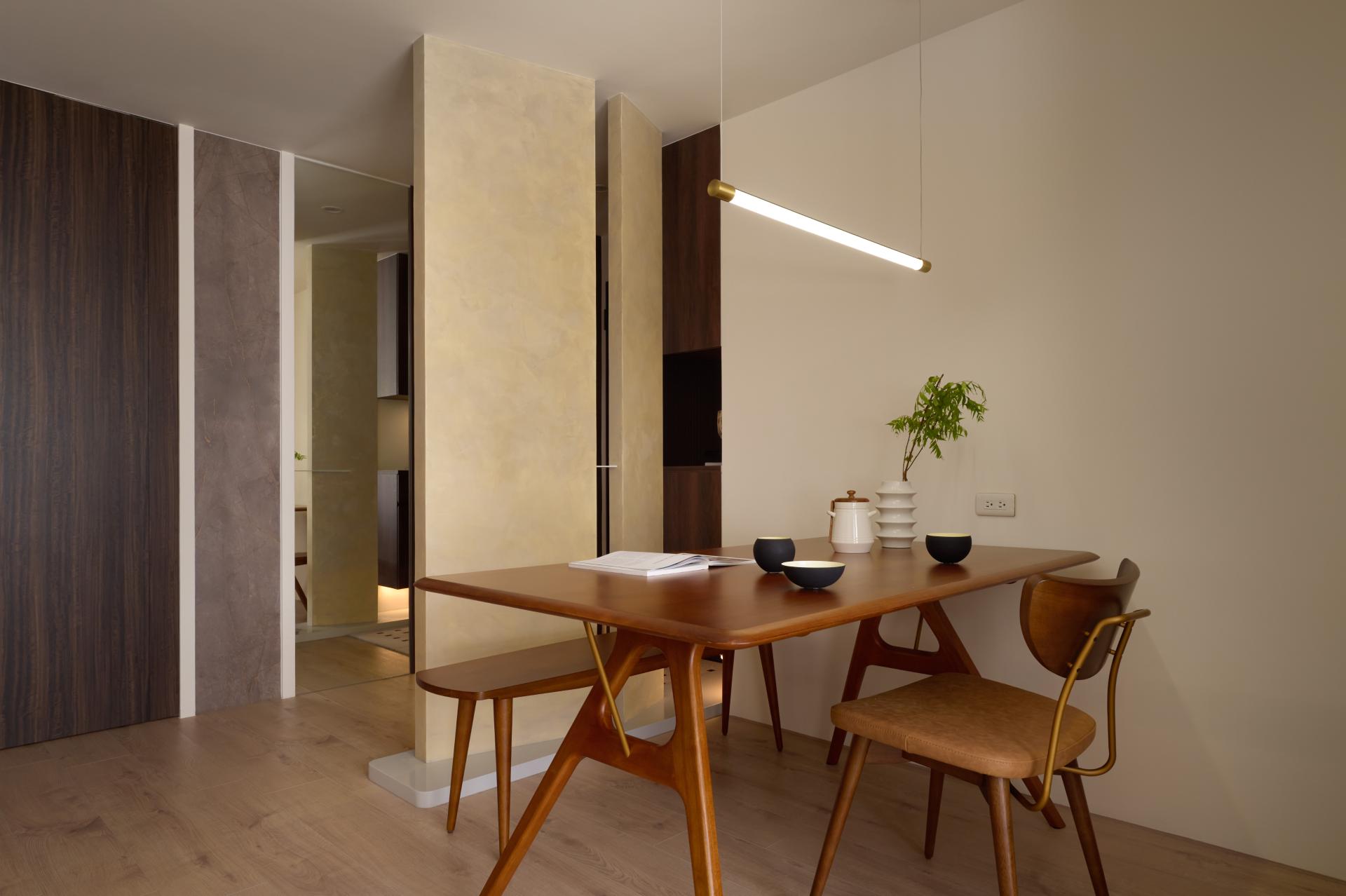 主視覺選用接近日光色溫的柔和跳色與藝術塗料,與自然光產生共鳴,形塑內外光感一致的空間調性,進一步營造溫潤、寧靜且充滿生活質感的氛圍。