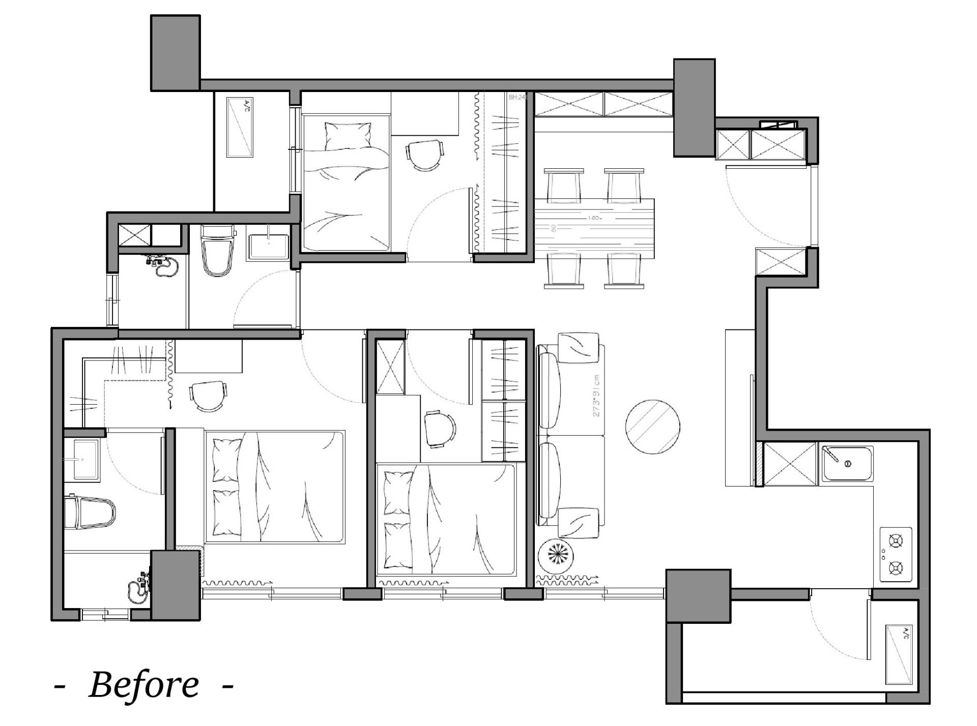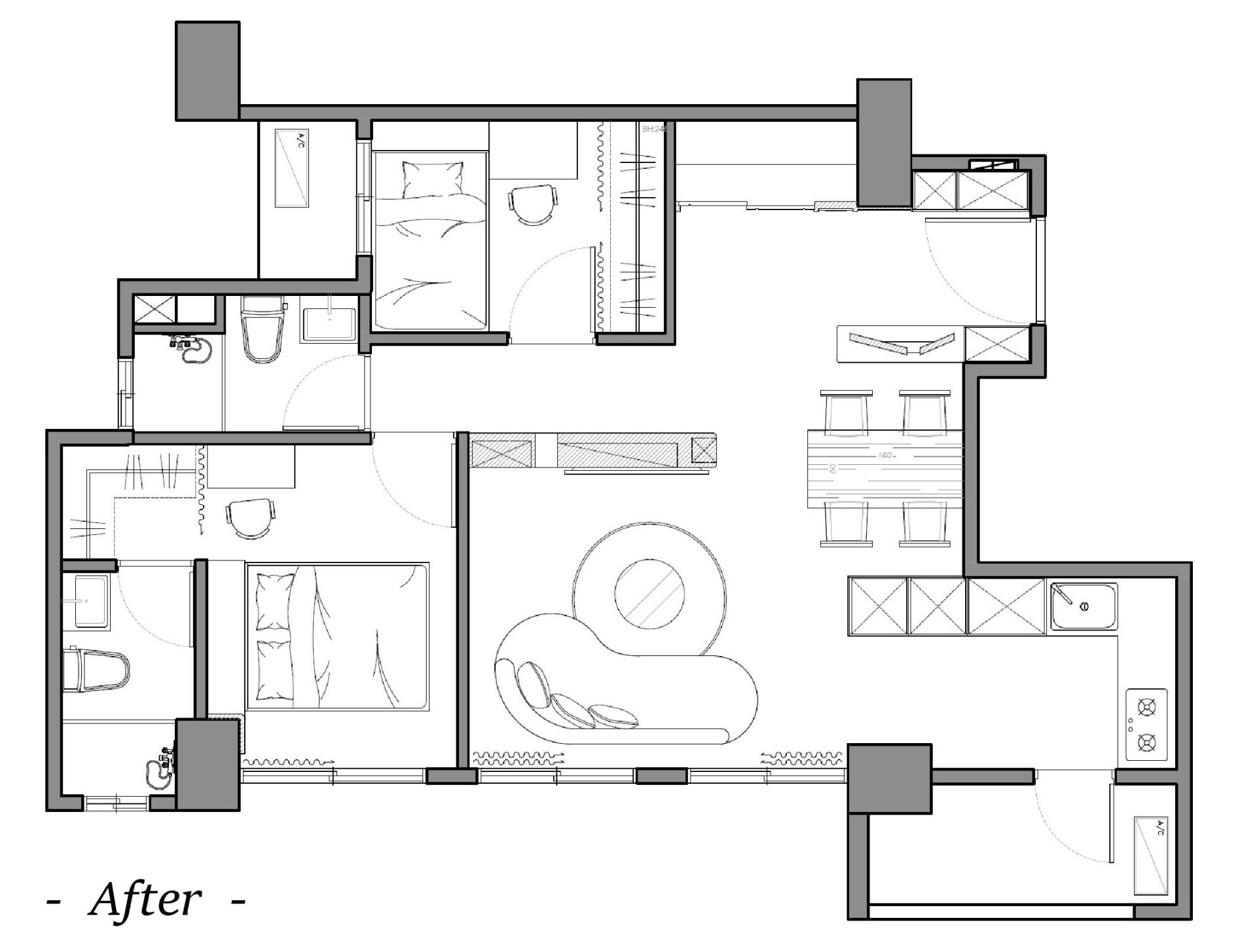 本案重新翻轉原始格局中公領域的配置邏輯,針對既有空間在生活機能上的侷限加以修正,透過清晰的動線規劃與場域界定,打造出既獨立又彼此串聯的空間節奏,使公共區域呈現通透、有層次的開放感。