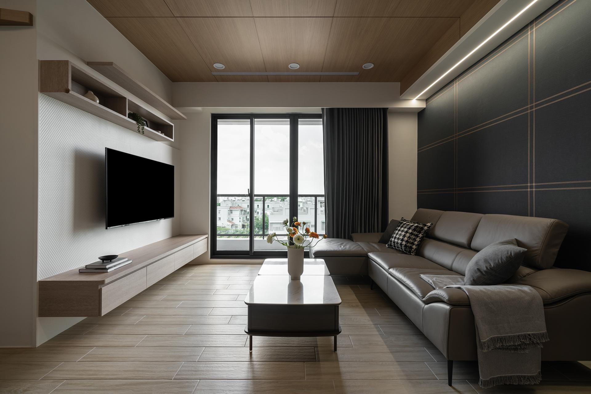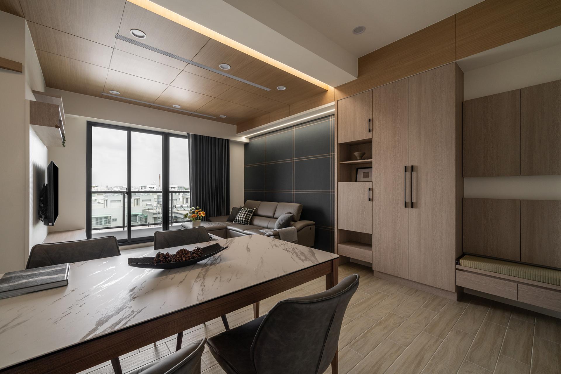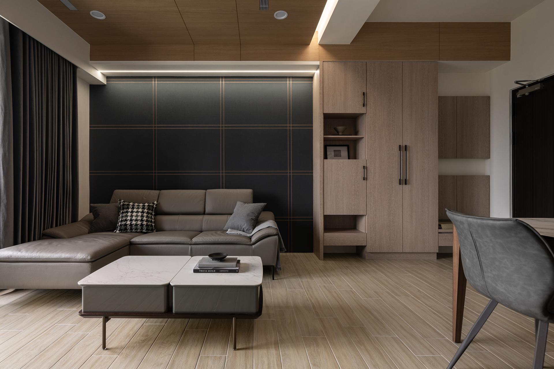 Upon entering the space, visitors will be immediately welcomed by the living room, which exudes an elegance reminiscent of a grand hotel lobby. The ceiling, adorned with rich solid wood veneer, cleverly conceals a hidden air conditioning system that maintains comfort without compromising the overall aesthetic. Additionally, light strips seamlessly embedded in the ceiling beams enhance the perception of depth, skillfully guiding the layout while providing consistent illumination throughout the room.