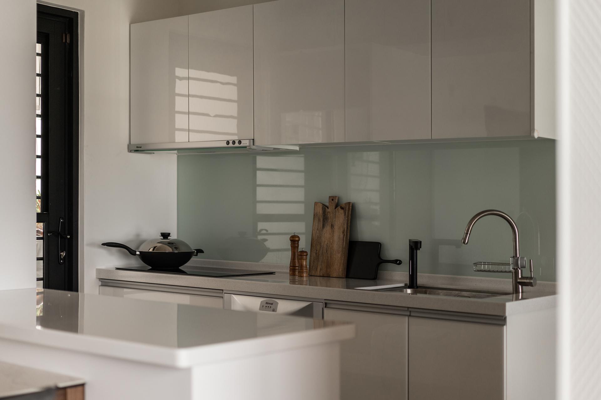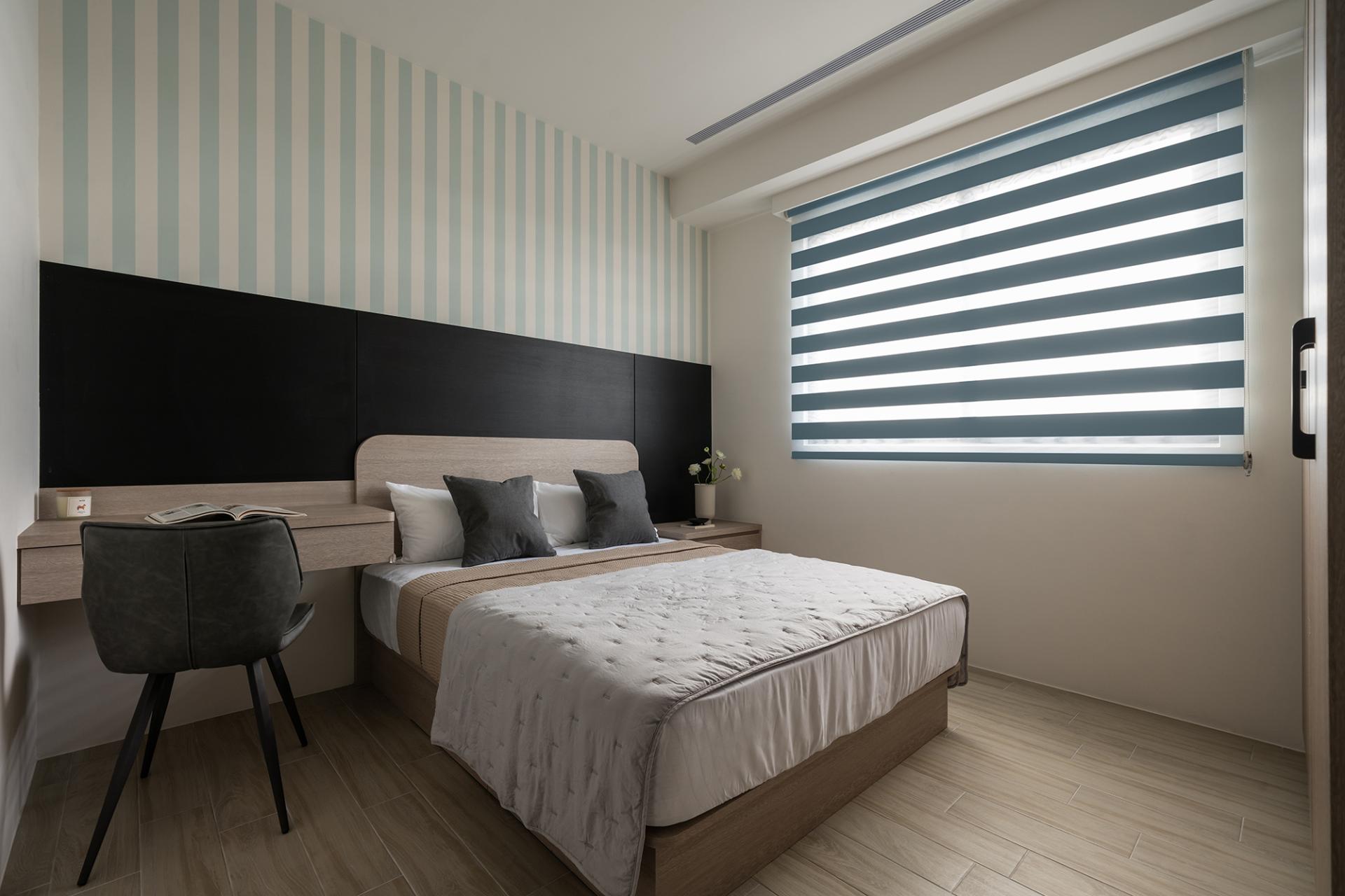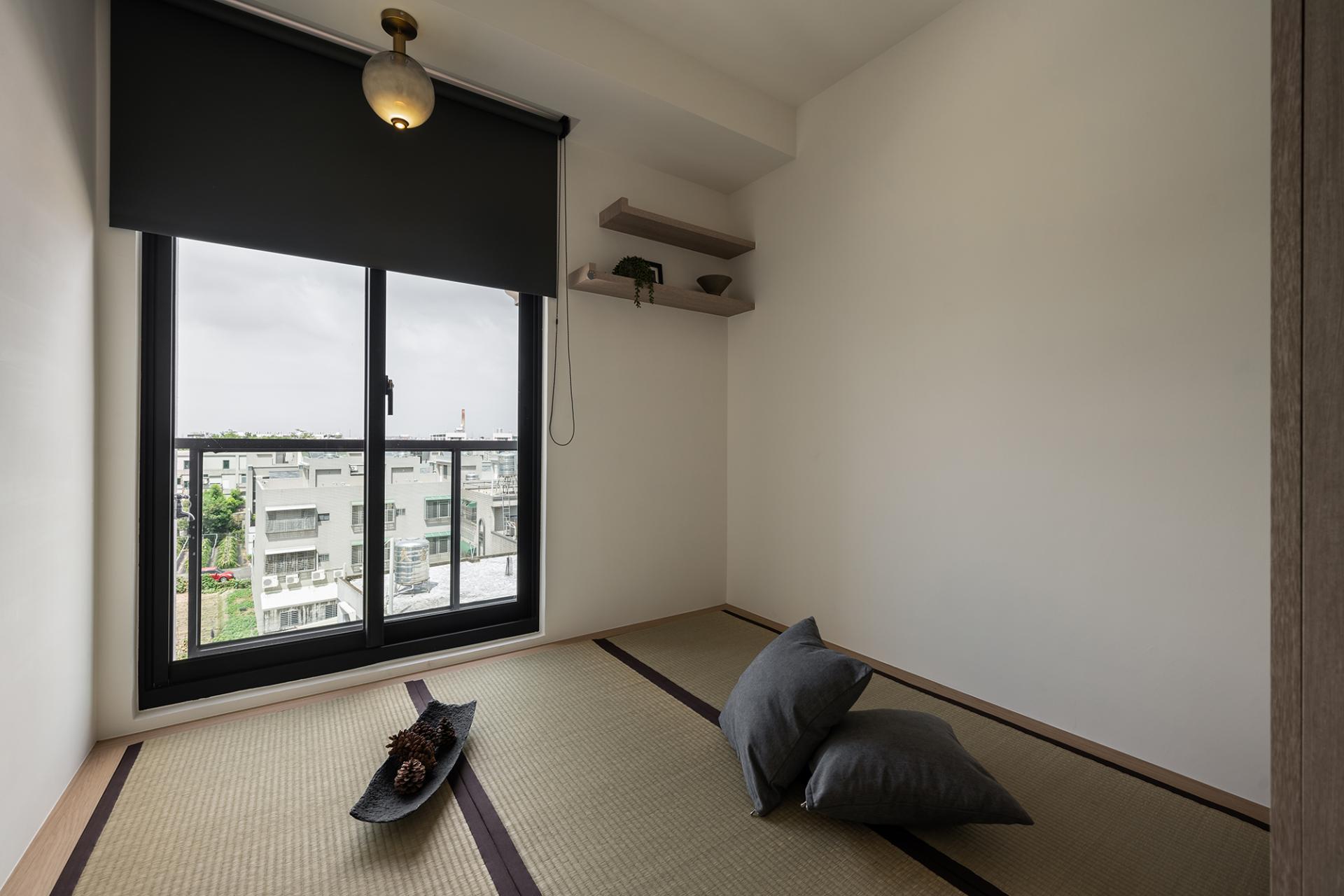 Transitioning to the wall behind the sofa, one will find a striking display of carefully selected wallpaper. Here, intricate gold lines weave through dark colors, adding layers of interest and sophistication that catch the eye. Beyond the living area, the master bedroom and guest bedroom are thoughtfully connected through the use of contrasting materials. This design choice fosters a sense of openness and elevates the overall spatial experience, despite the compact floor plan. Finally, the last bedroom is transformed into a modern Japanese-style tea room. This tranquil retreat features a well-appointed seating area that artfully combines storage functionality with a single-frame tatami mat. As a result, the clever design extends the living space,