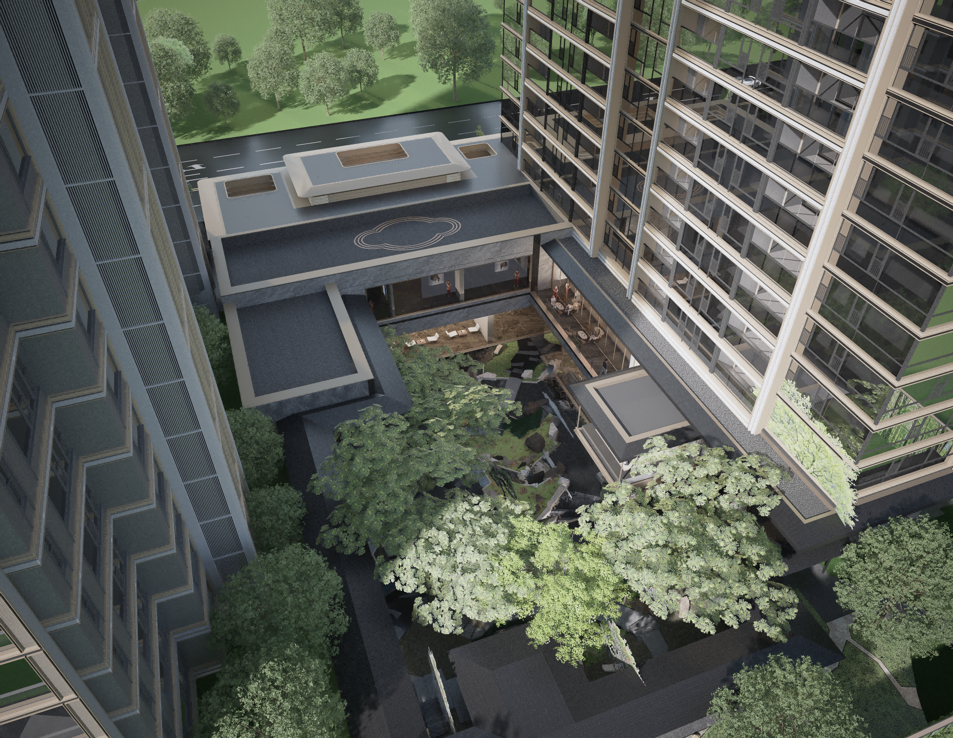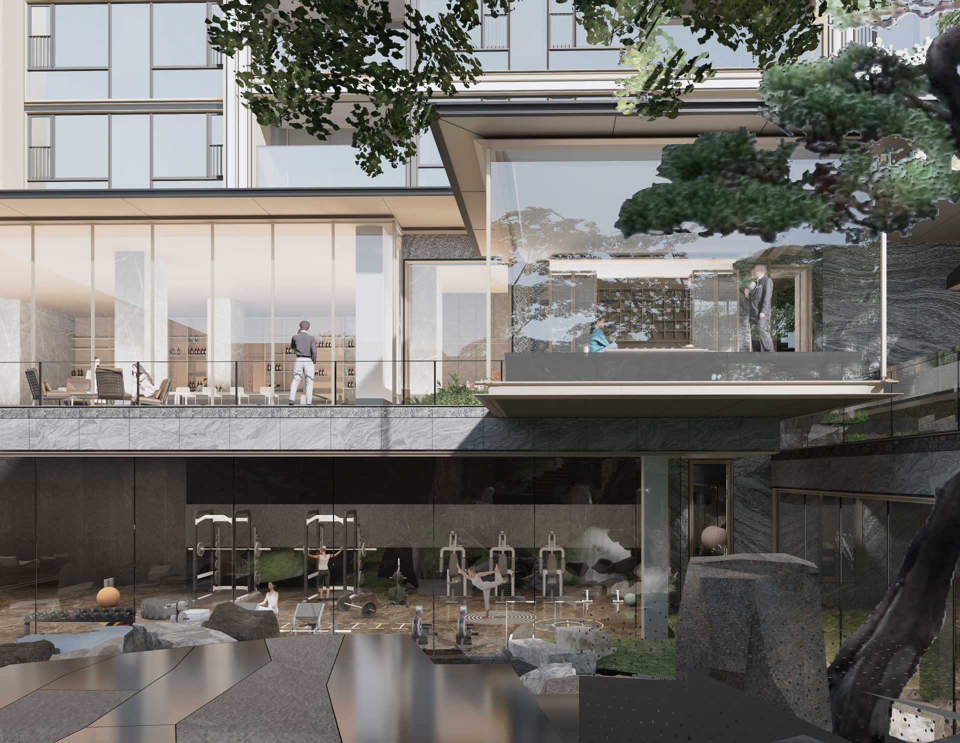 The design of the stacked villas in this project draws inspiration from the century-old landmark on the Bund — No. 23 The Bund, an architectural model that represents Shanghai's dialogue with the world. Yilu skillfully incorporates elements of Oriental roof ridges, perfectly blending the essence of traditional Oriental aesthetics with modern construction techniques. Through stretched and refined horizontal lines, it outlines an architectural silhouette imbued with Oriental charm. In the contemporary context, the project reinterprets Oriental elegance using modern architectural language, enabling the Oriental spatial temperament and charm embodied by the century-old Bund to be inherited and carried forward here, thus setting a new classic benchmark for Shanghai's residential living. For the facade materials, premium Indian sapphire stone, aluminum panels, glass curtain walls, and stone-like coatings are chosen, which not only ensure durability and aesthetics but also take into account the recyclability and environmental friendliness of the materials, practicing the concept of sustainable development.