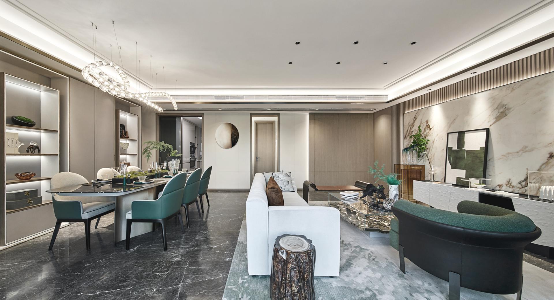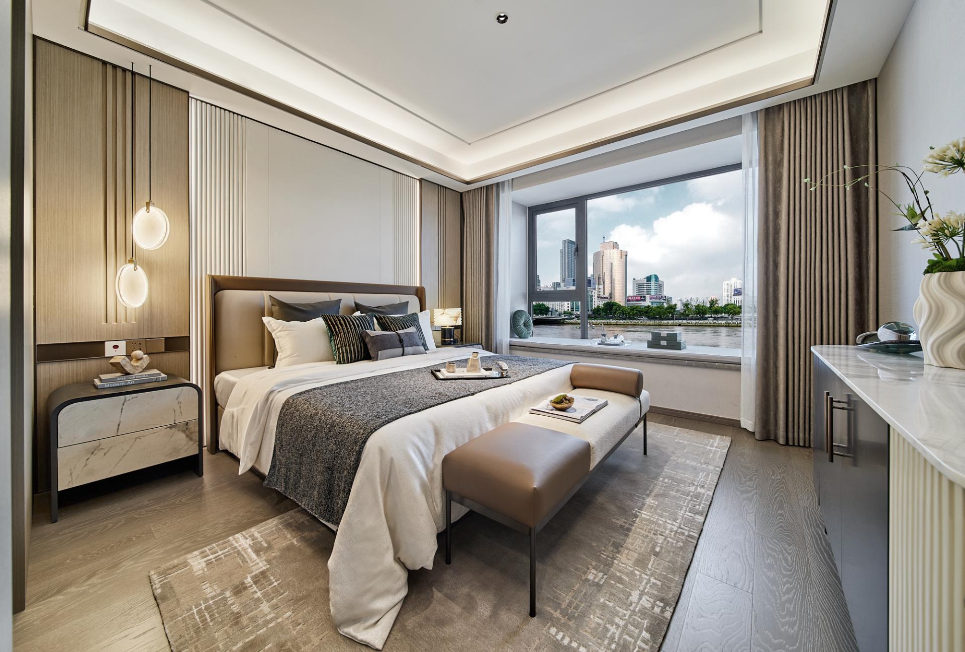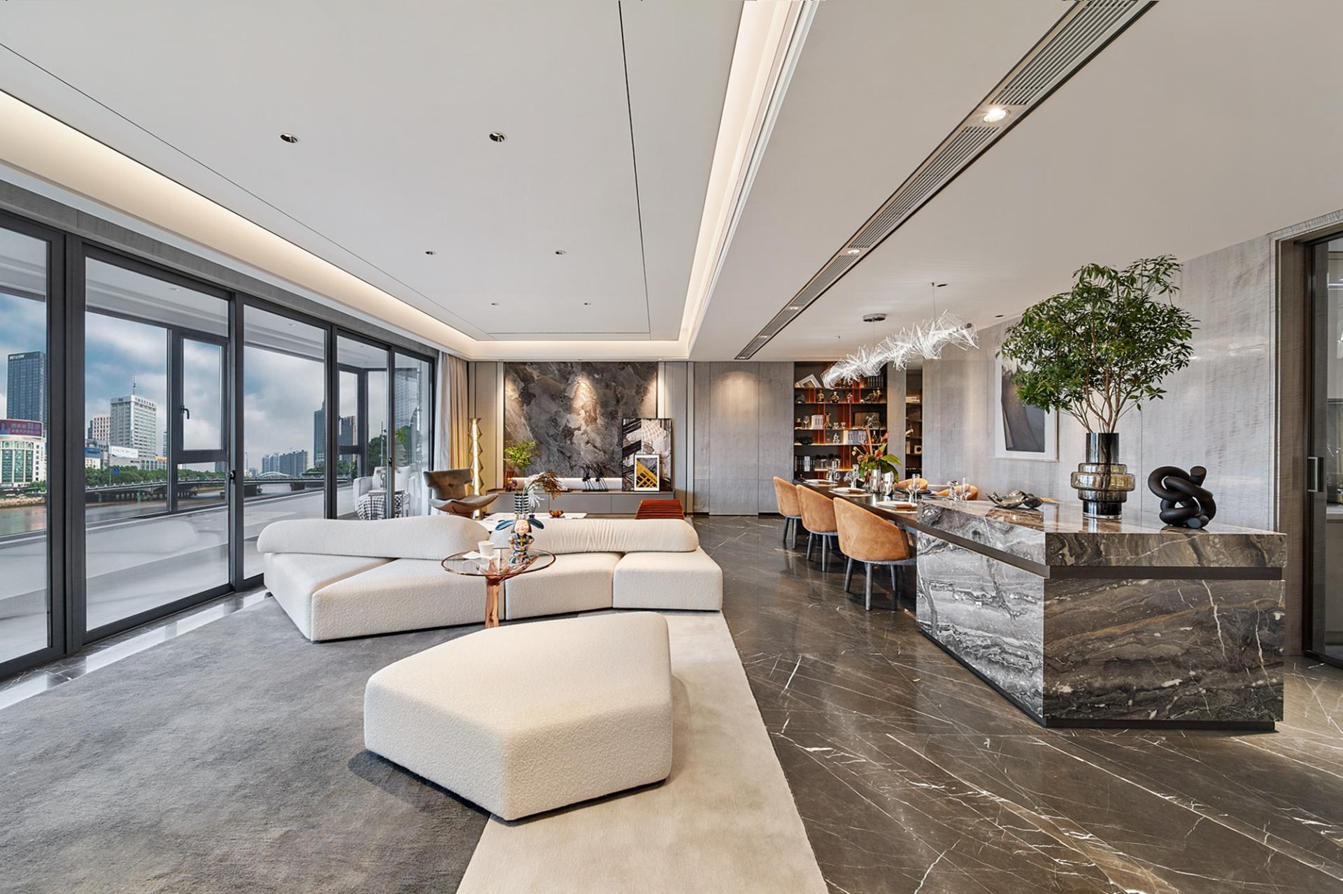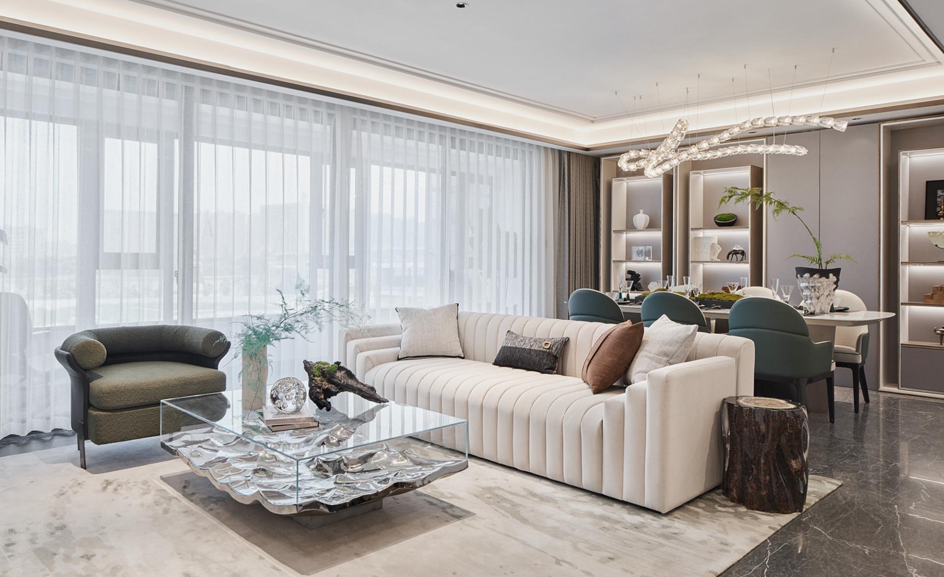 Gangbu Yangju commands prime south-facing views of the Yongjiang River at the Sanjiangkou confluence. It carries the memories of history while redefining Ningbo's riverside lifestyle with exceptional quality and scarce resources. The project features a specially planned six-dimensional riverside spatial layout, ensuring every household enjoys unobstructed, unparalleled river views, as if immersed in a flowing panorama of the river. Designers, with space as the brush and light and shadow as the ink, draw inspiration from world port cities, fusing cross-ocean multiculturalism with exquisite craftsmanship to anchor a flawless modern living haven. Large-area floor-to-ceiling windows invite natural light, casting ever-changing patterns on plain walls and warm flooring; carefully designed circulation, like the veins of time, connects different functional areas. In the living room, the modular sofa offers versatile and comfortable experiences, adaptable to space dimensions in various arrangements, engaging in a gentle dialogue with the elegantly contoured coffee table, seeking harmony amid contrast. The linearly embedded light strips on corridor walls or floors, or the distinctive textures of natural stone, silently narrate the traces of time and the accumulated power. The books scattered throughout the space, the meticulously chosen ceramic vessels, and even the casually placed sketchbooks and brushes serve as highlighting decorations. They are not only a celebration of life but also an ultimate expression of elegance, hinting that the owner, an artist of living, is creating his own masterpiece of time through the intricacies of daily life. The integrated design of the living, dining, and kitchen areas allows life scenes to be independent yet interconnected. The chandelier hanging above the dining table guides people to experience an unprecedented enthusiasm of the era, while the display cabinet, like a cabin for precious collections, showcases impeccable taste. The bedroom, as the ultimate solace upon return, adopts soothing and tranquil tones, accented with warm antique brass or dark walnut hues. The vintage irregular crystal chandelier, brought back by the owner during their ocean voyages, hangs on the headboard wall—its luster, endowed by time, still shines brilliantly.