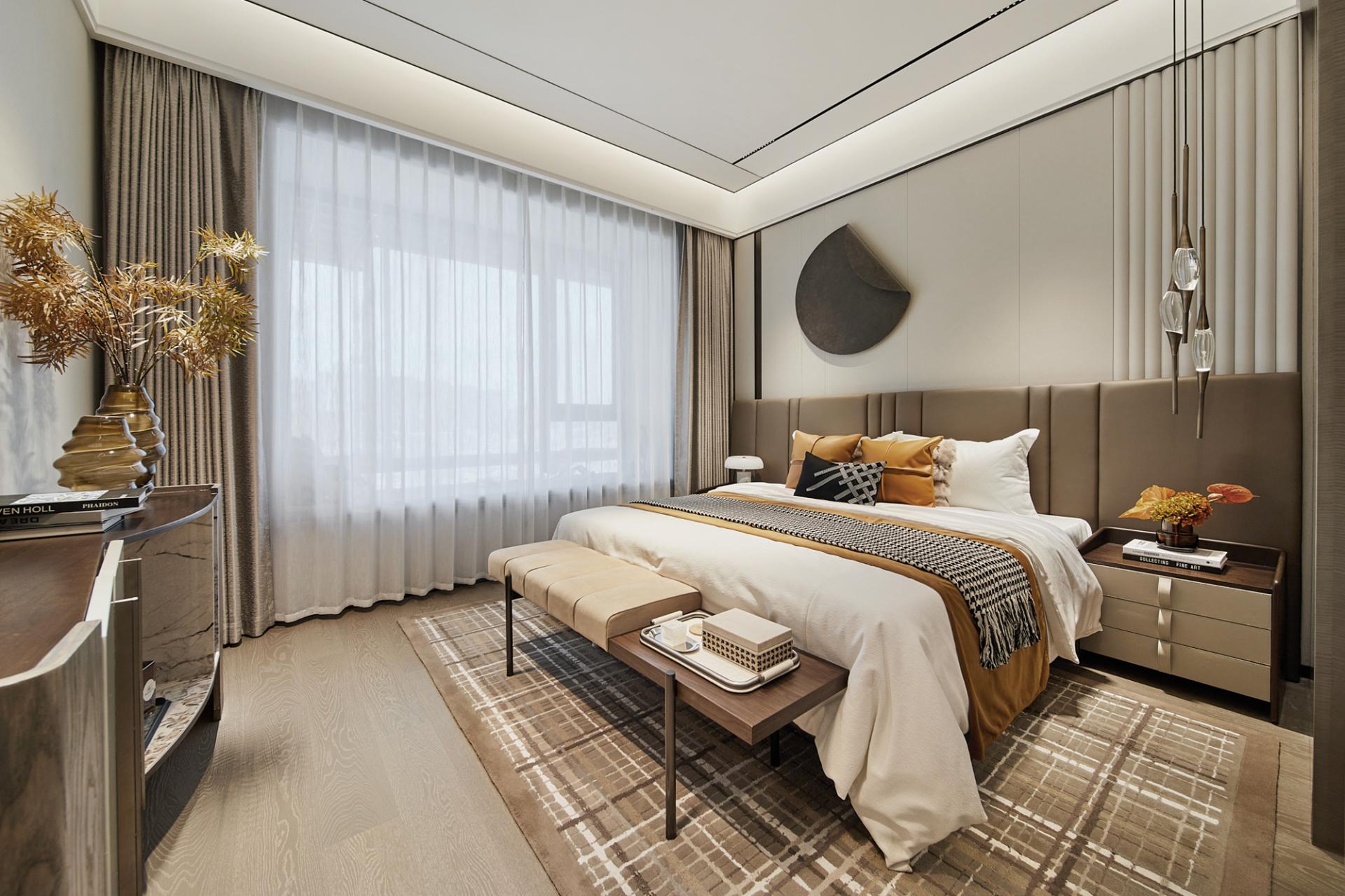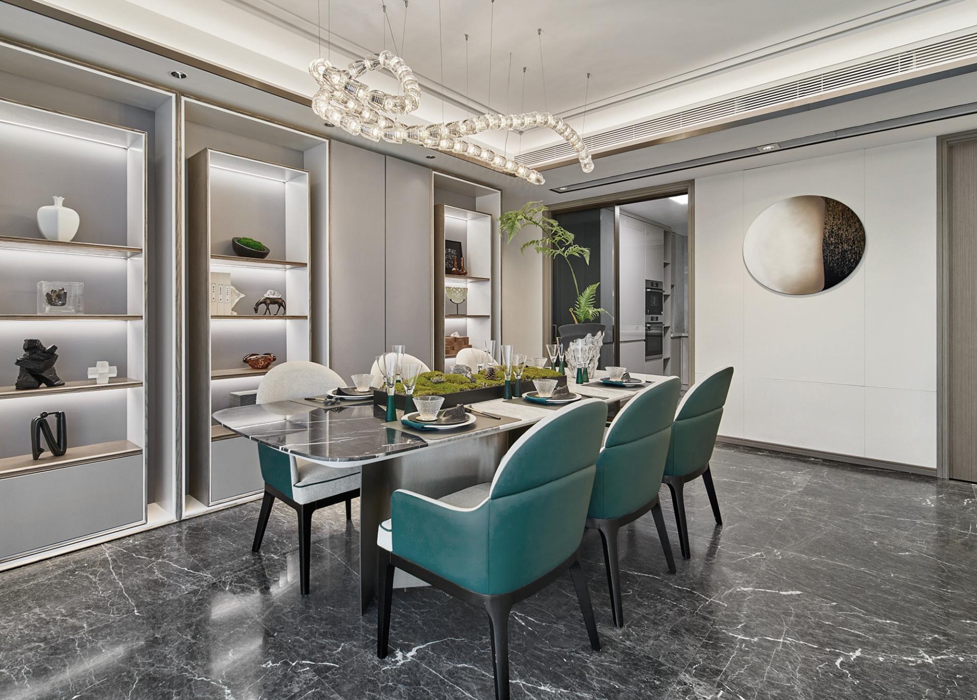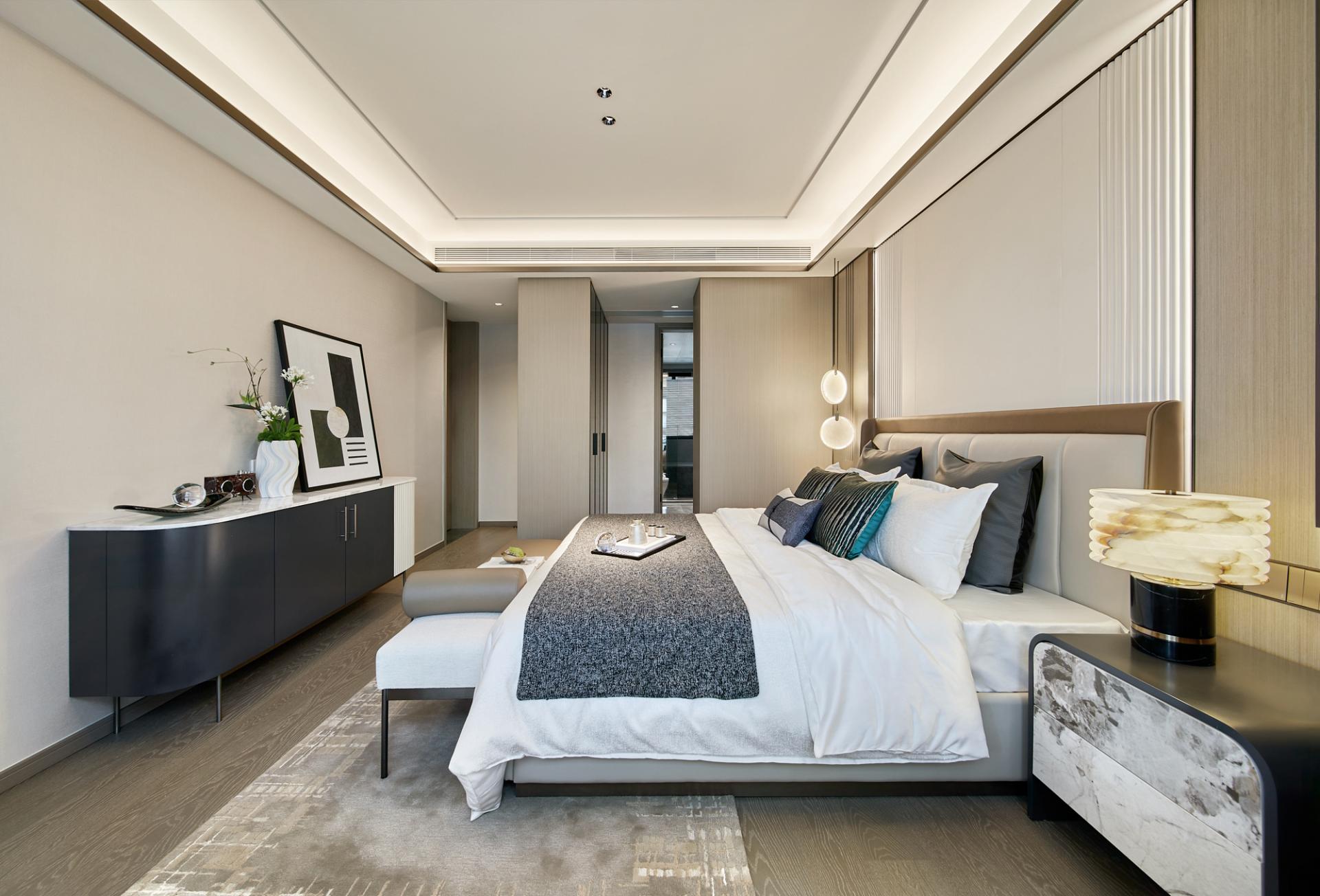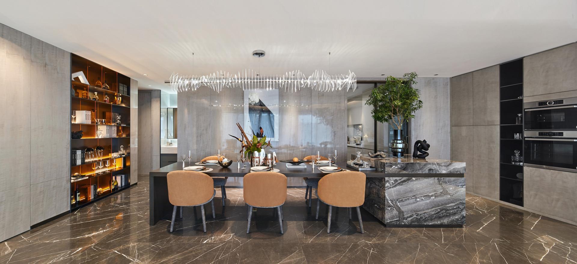 Gangbu Yangju commands prime south-facing views of the Yongjiang River at the Sanjiangkou confluence. It carries the memories of history while redefining Ningbo's riverside lifestyle with exceptional quality and scarce resources. The project features a specially planned six-dimensional riverside spatial layout, ensuring every household enjoys unobstructed, unparalleled river views, as if immersed in a flowing panorama of the river. Designers, with space as the brush and light and shadow as the ink, draw inspiration from world port cities, fusing cross-ocean multiculturalism with exquisite craftsmanship to anchor a flawless modern living haven. Large-area floor-to-ceiling windows invite natural light, casting ever-changing patterns on plain walls and warm flooring; carefully designed circulation, like the veins of time, connects different functional areas. In the living room, the modular sofa offers versatile and comfortable experiences, adaptable to space dimensions in various arrangements, engaging in a gentle dialogue with the elegantly contoured coffee table, seeking harmony amid contrast. The linearly embedded light strips on corridor walls or floors, or the distinctive textures of natural stone, silently narrate the traces of time and the accumulated power. The books scattered throughout the space, the meticulously chosen ceramic vessels, and even the casually placed sketchbooks and brushes serve as highlighting decorations. They are not only a celebration of life but also an ultimate expression of elegance, hinting that the owner, an artist of living, is creating his own masterpiece of time through the intricacies of daily life. The integrated design of the living, dining, and kitchen areas allows life scenes to be independent yet interconnected. The chandelier hanging above the dining table guides people to experience an unprecedented enthusiasm of the era, while the display cabinet, like a cabin for precious collections, showcases impeccable taste. The bedroom, as the ultimate solace upon return, adopts soothing and tranquil tones, accented with warm antique brass or dark walnut hues. The vintage irregular crystal chandelier, brought back by the owner during their ocean voyages, hangs on the headboard wall—its luster, endowed by time, still shines brilliantly.