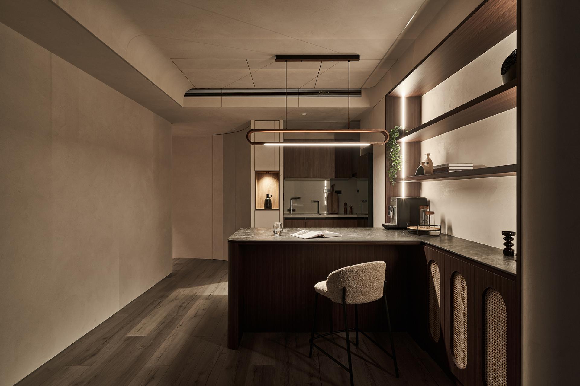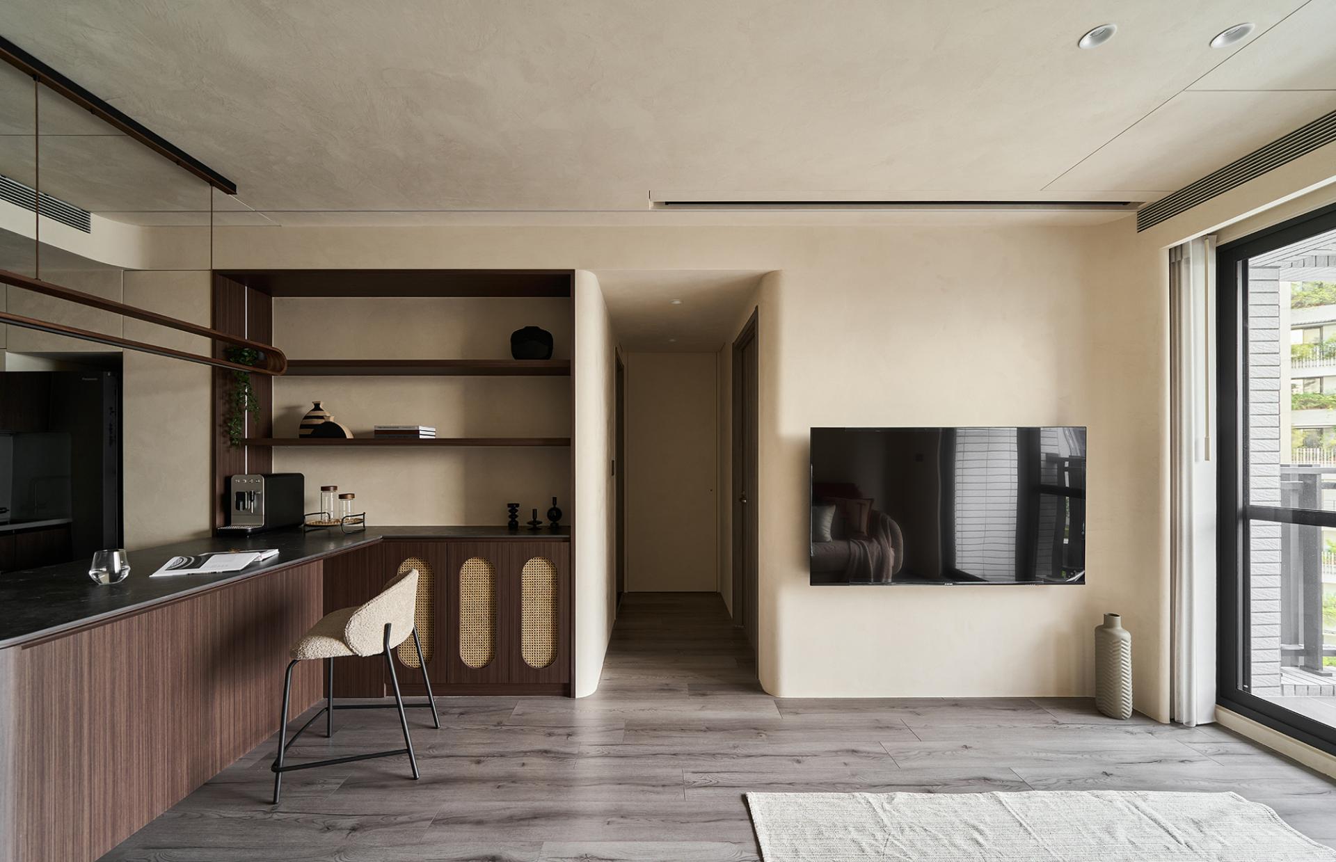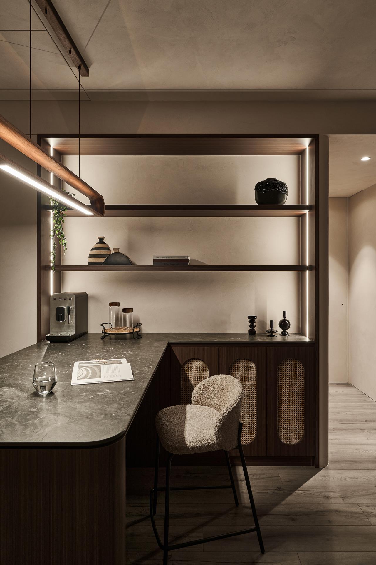 Transitioning seamlessly from the foyer, one enters the open-plan living area, where the kitchen, dining area, and living room are thoughtfully integrated for both functionality and aesthetics. At the heart of this space is a striking unit that artfully combines an island bar counter with a sideboard, elegantly replacing the traditional dining table. The burnished stone countertop not only enhances the visual appeal but also adds a tactile richness, while the cleverly designed rattan-woven wooden doors discreetly conceal the audio-visual equipment, striking a perfect balance between style and the practical need for heat dissipation.