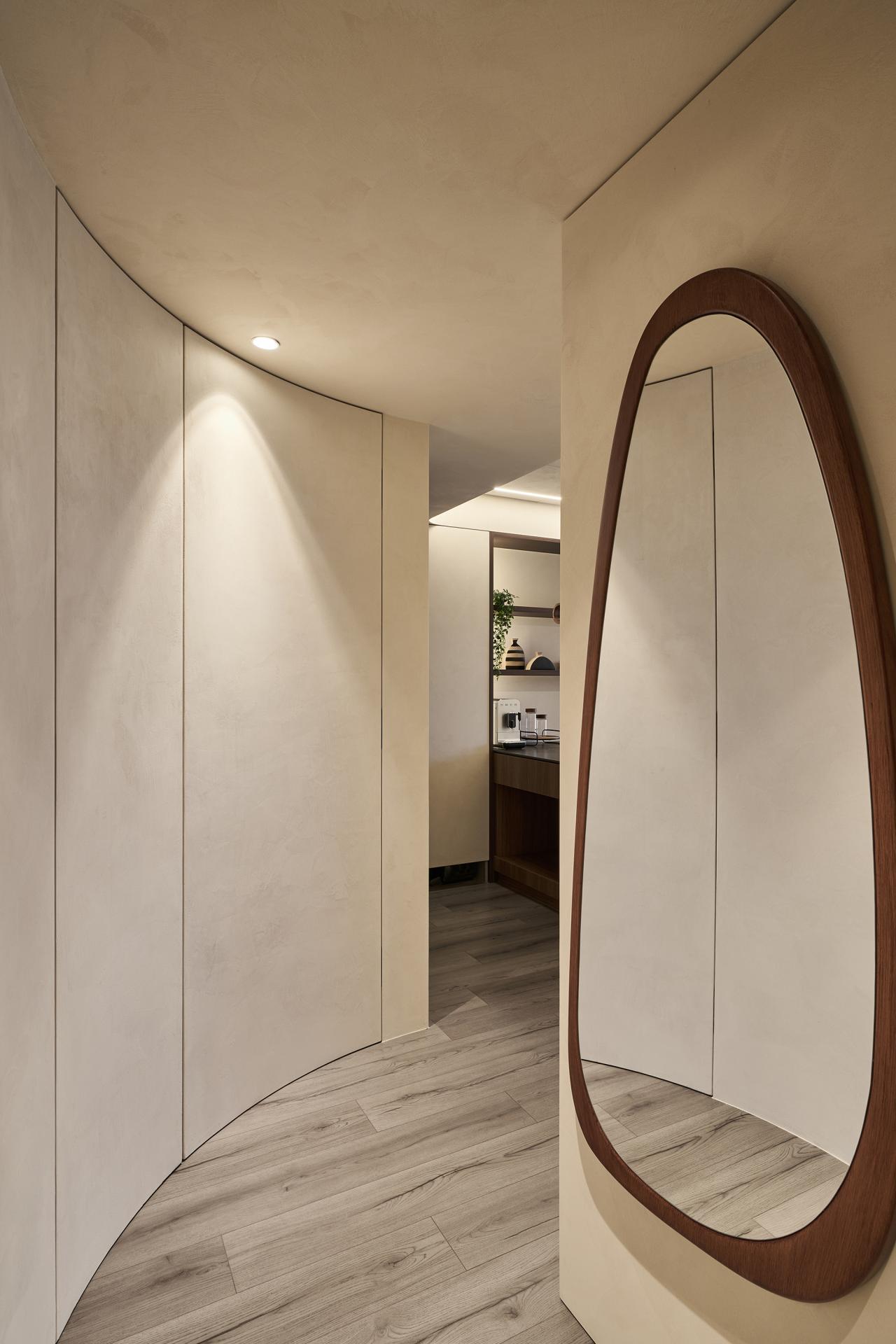 As one steps into the foyer, the first impression is undeniably captivating, with an elegantly curved storage room that artfully delineates the entrance from the kitchen. This thoughtful design not only addresses feng shui considerations but also maximizes coat storage within the confines of a compact layout. Furthermore, the smooth curves of the storage room serve to soften the rigid spatial boundaries of the original space, thereby creating a harmonious flow that invites exploration.