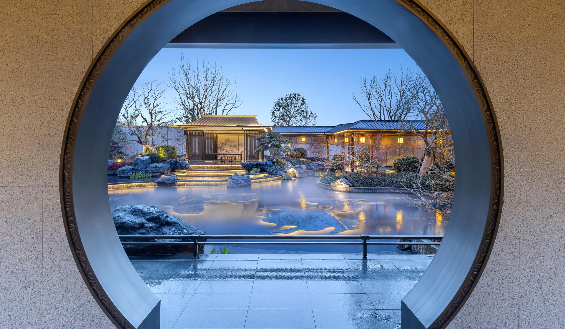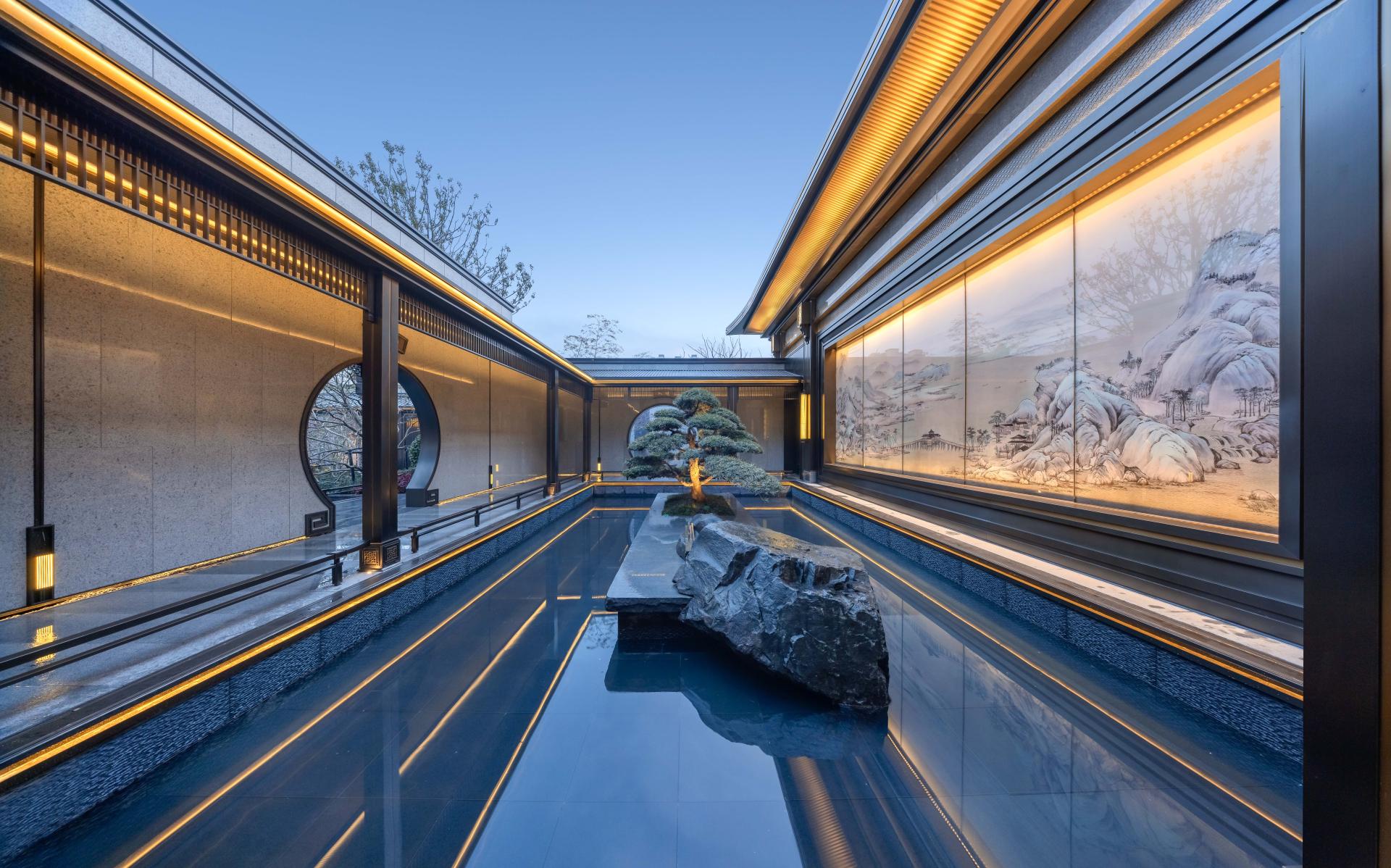 穿过影影绰绰的游廊,步入精神空间禅院,心境瞬转明亮,映入眼帘的是一个似亭非亭的 “亭子”,雾里探花,留有悬念。带给人一种“不识庐山真面目,只缘身在此山中”的场景感。穿过漫步行过丘坡起伏、松林莽莽的林海,怡然自得,寻到禅房——售楼处,心境自然而然地豁然开朗起来。