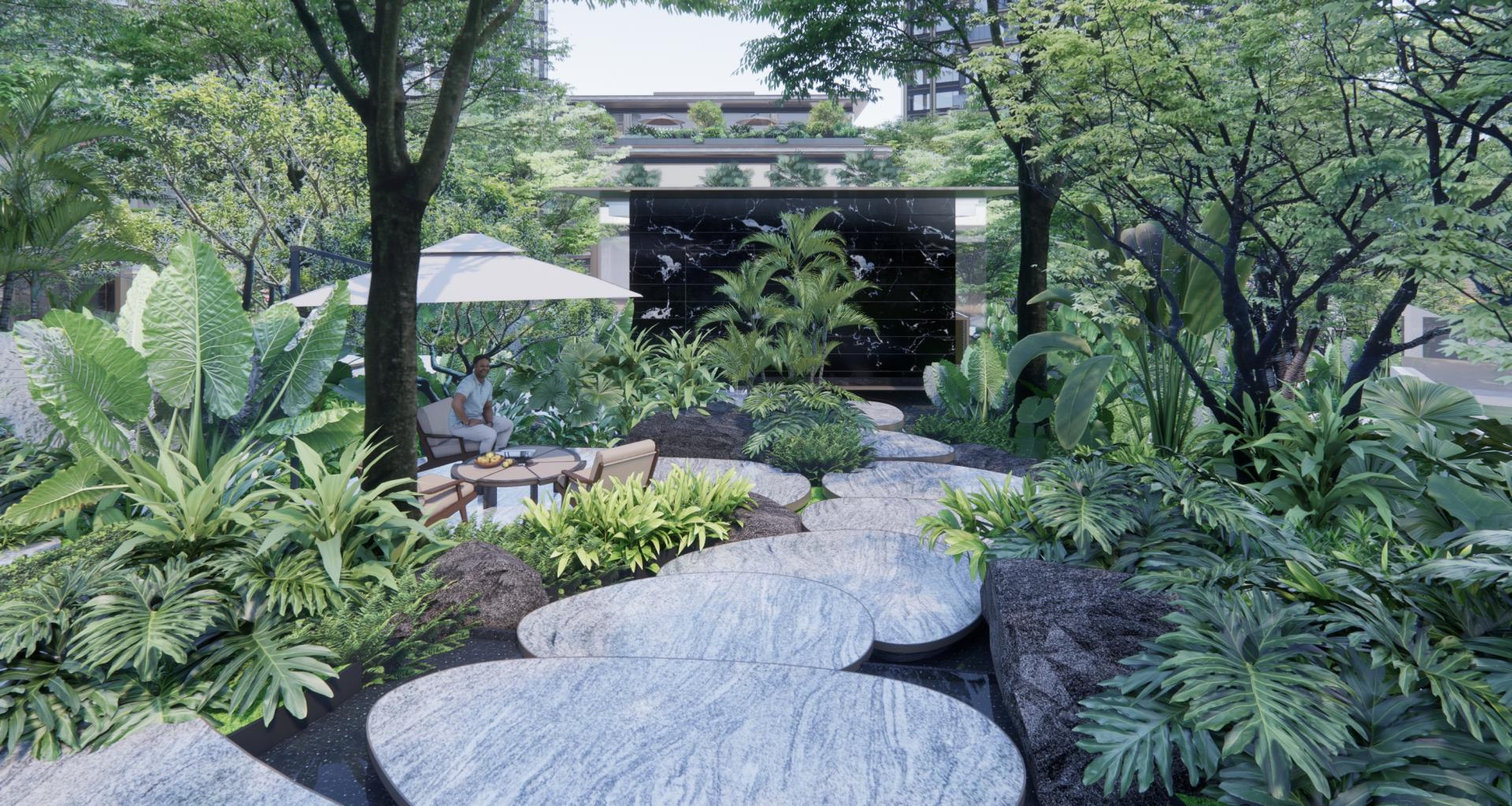 The design elevates the residential blocks on stilts, integrating commercial spaces, ancillary facilities, and elevated parking to create a comprehensive "super life platform." By channeling the surrounding mountain and water landscapes into the site, the project centers around the theme of "Forest Isle Residence," forming a central ecological oasis. The natural topographic variations are leveraged to craft rich, three-dimensional tiered gardens.