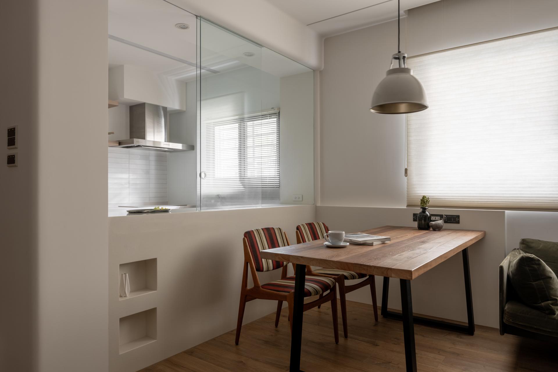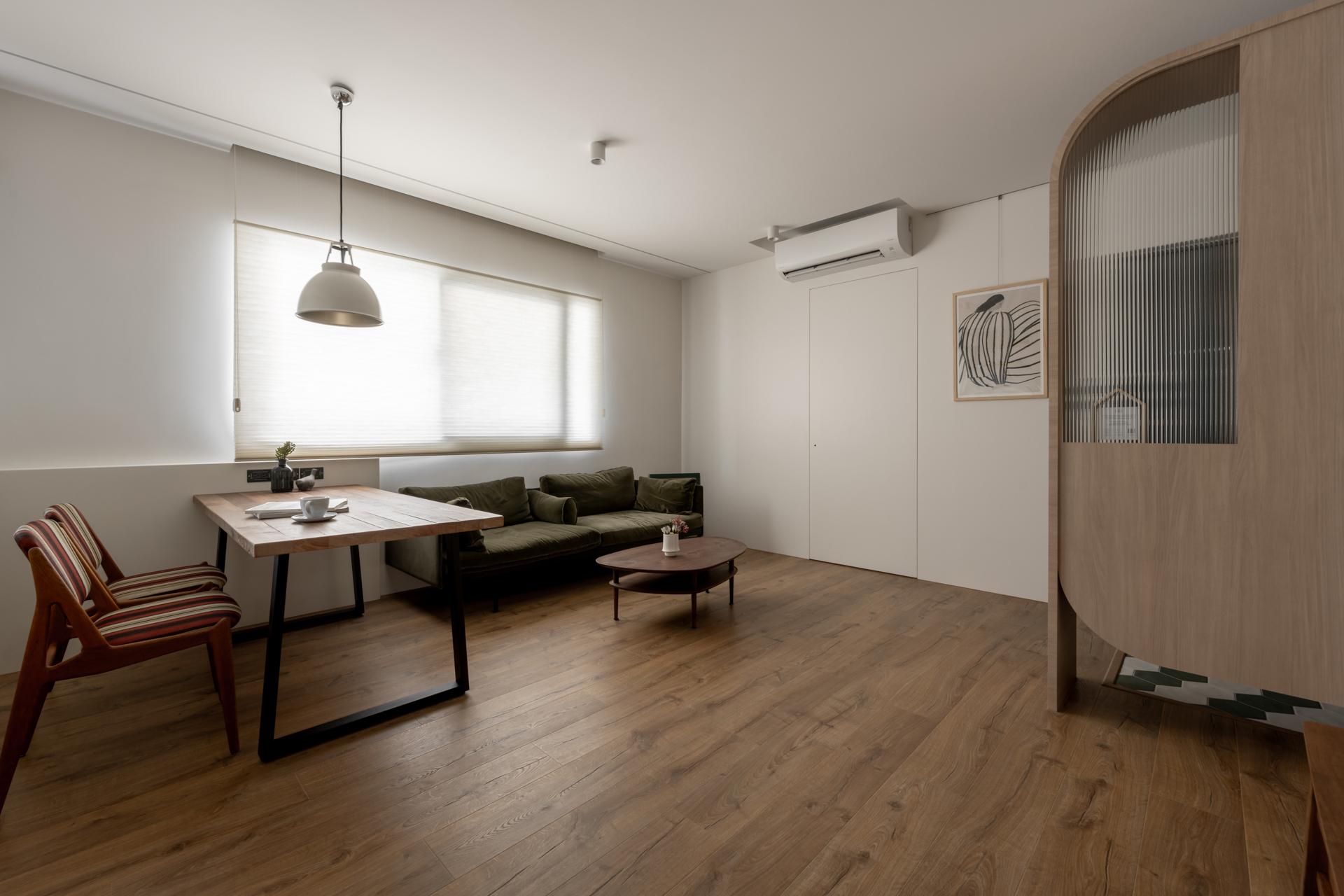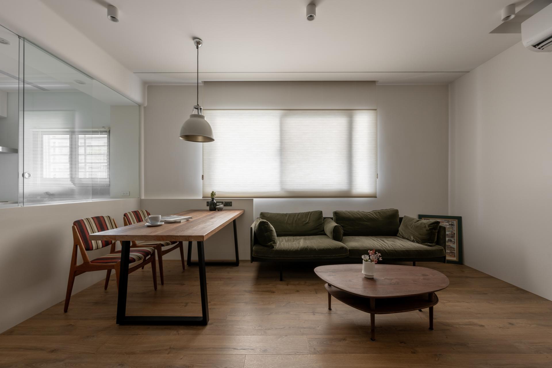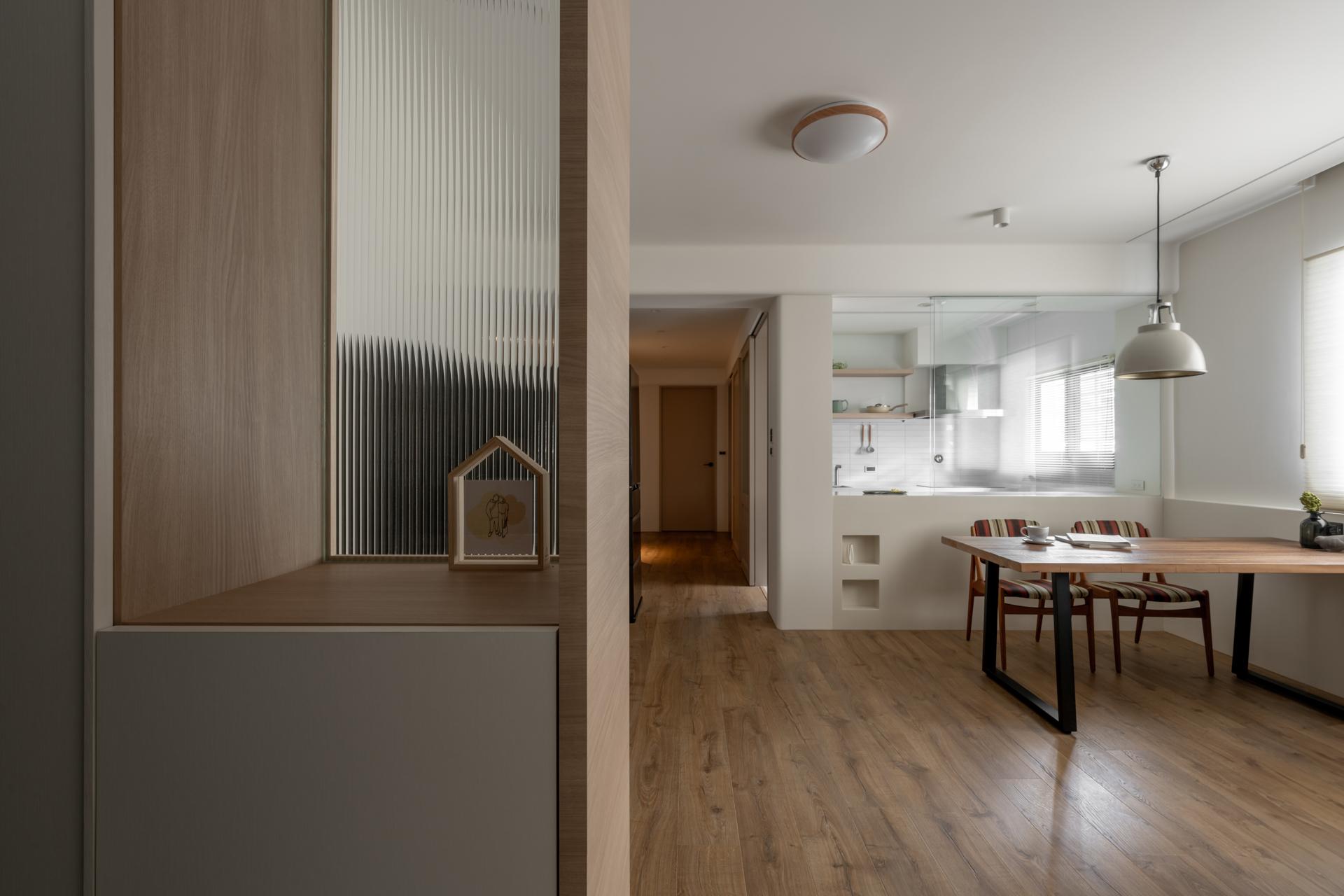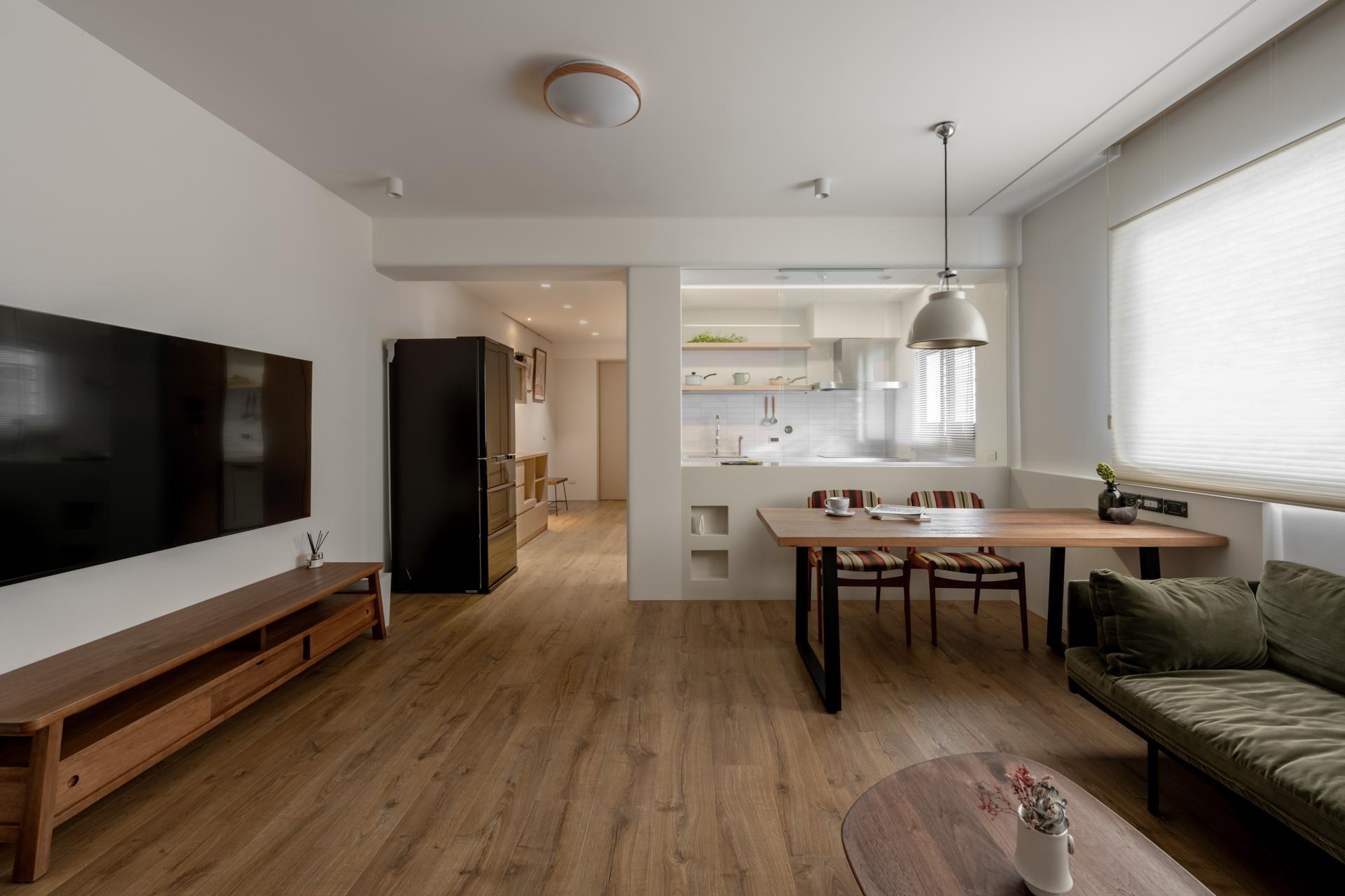 The project is located on the second floor of a 40-year-old apartment in Shilin, covering 99.1 square meters, including front and rear balconies. The layout was originally narrow and elongated. The owner’s requirements focused on two bedrooms, a semi-open dining and kitchen, and ample storage. The desired style blended natural Japanese aesthetics with vintage European touches, with colors restrained to wood grains and ivory white.