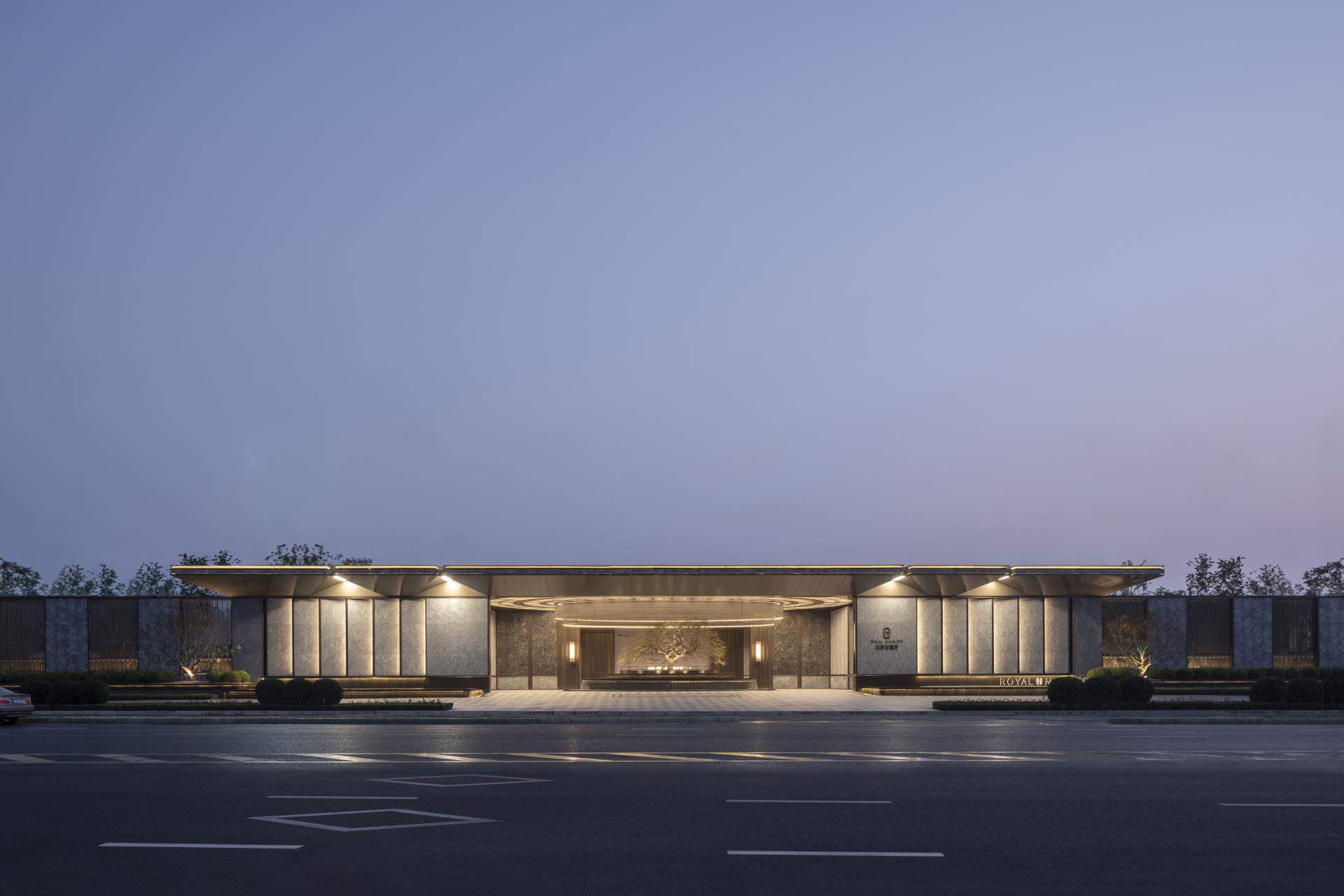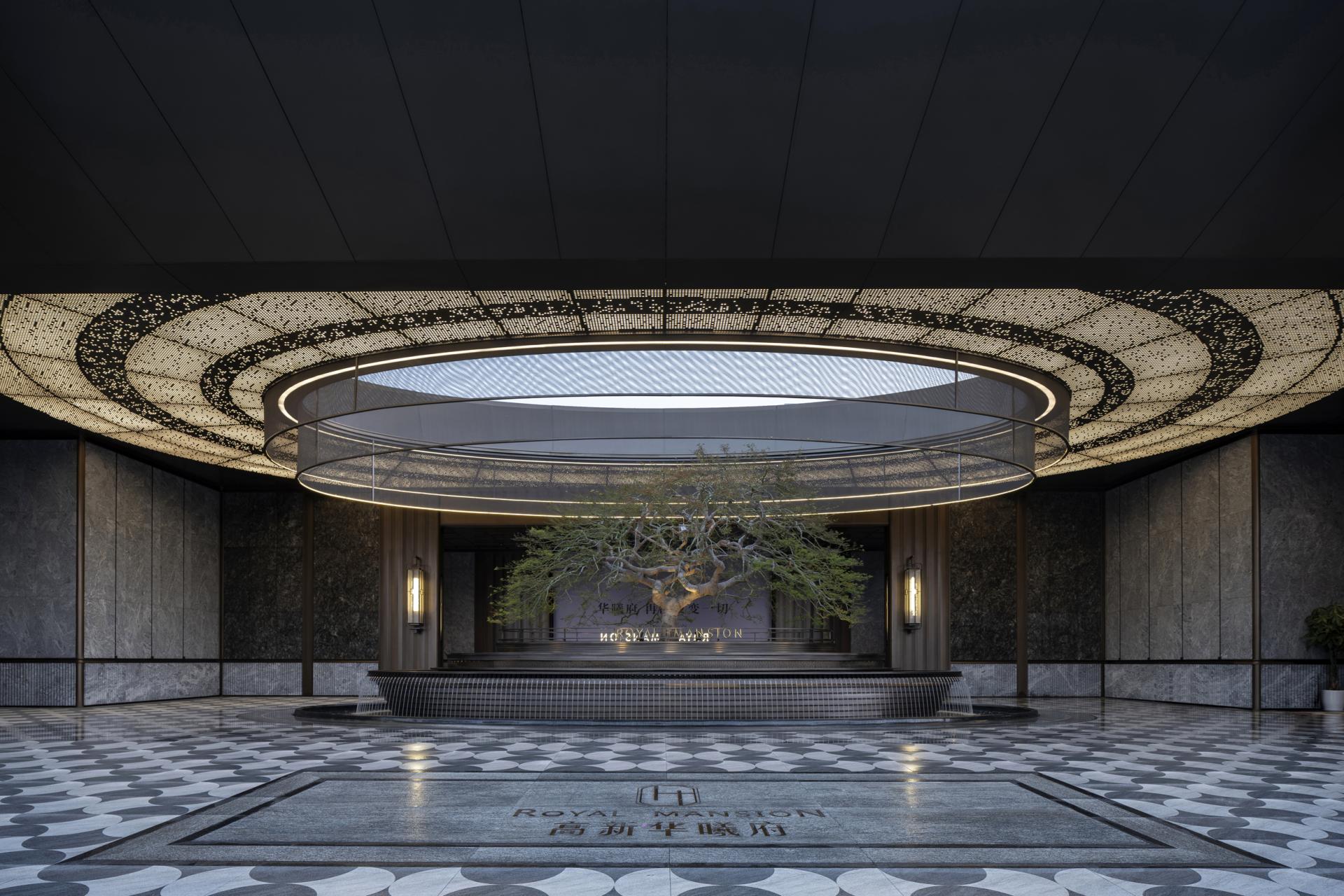 Situated within a verdant high-tech district and embraced on three sides by lakes and waterways, the design synthesizes cultural memory with contemporary, high-end materiality and human-centered spatial sequencing. The entrance is anchored by a large-span oval hollow dome that references the traditional "round heaven, square earth" cosmology to establish a ceremonial approach and a sense of communal harmony. A suspended circular metal curtain—woven from bent metal strips—abstracts regional bamboo-weaving craftsmanship, filtering light and creating a tactile threshold. Beneath it, a terraced oval water feature and a carefully placed feather maple provide a rhythmic transition from built form to landscape.