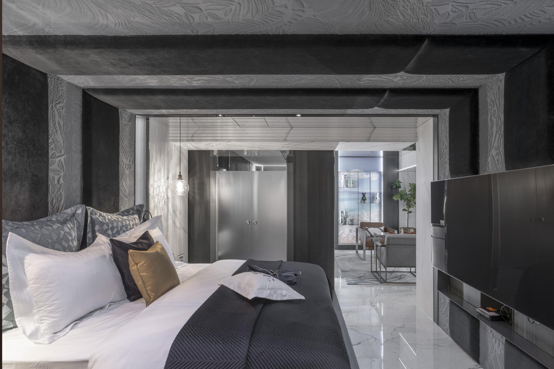 Incorporating smart technology, the design transforms the space into a fashionable and artistically charming residence tailored for a female entrepreneur.