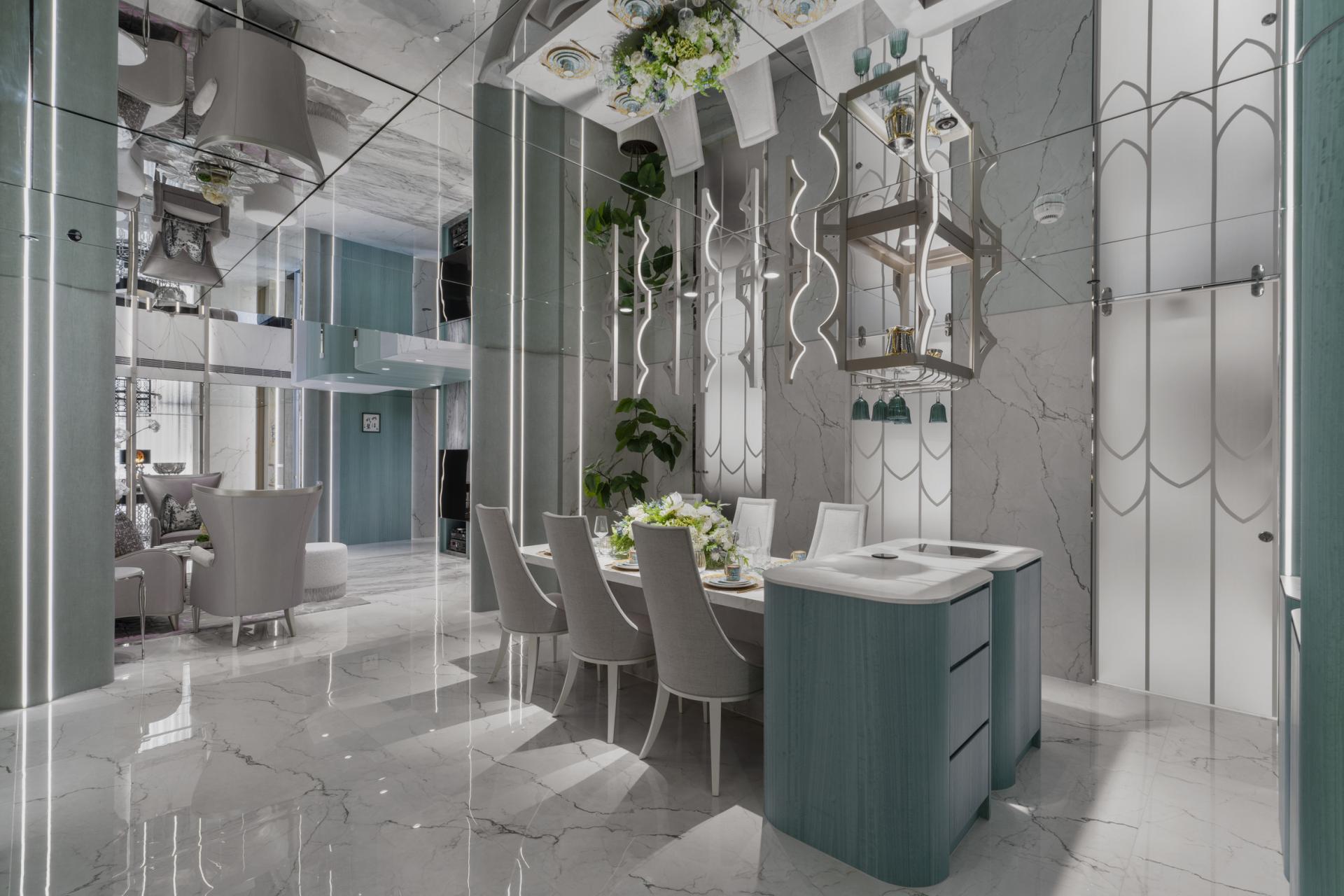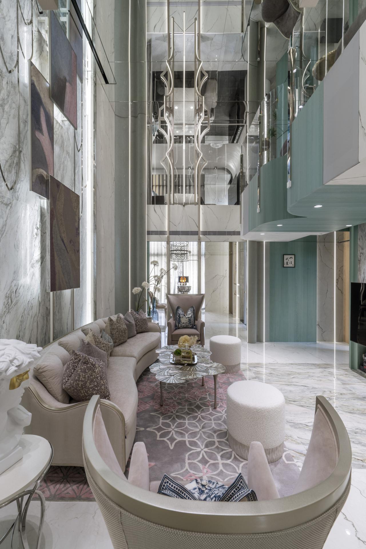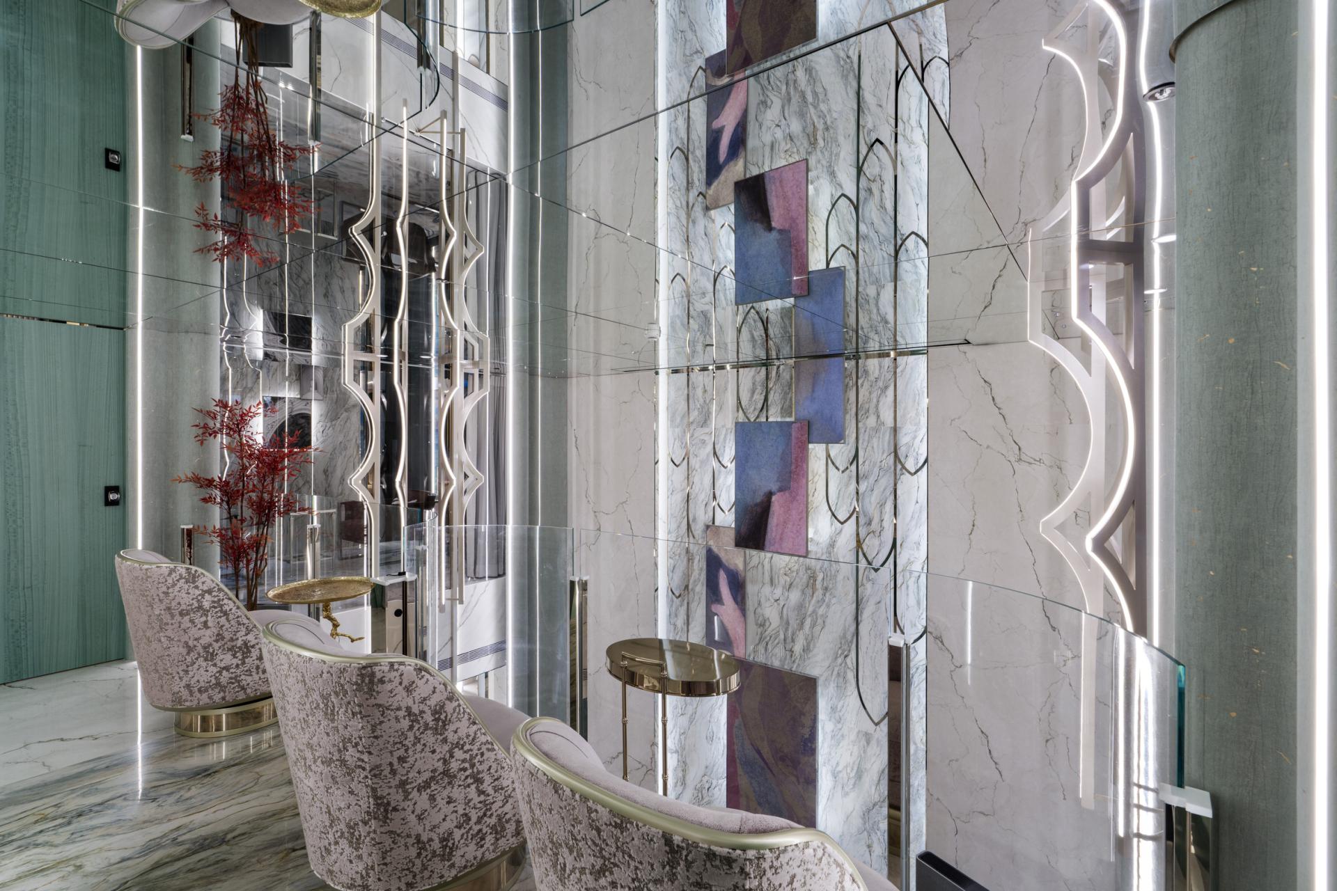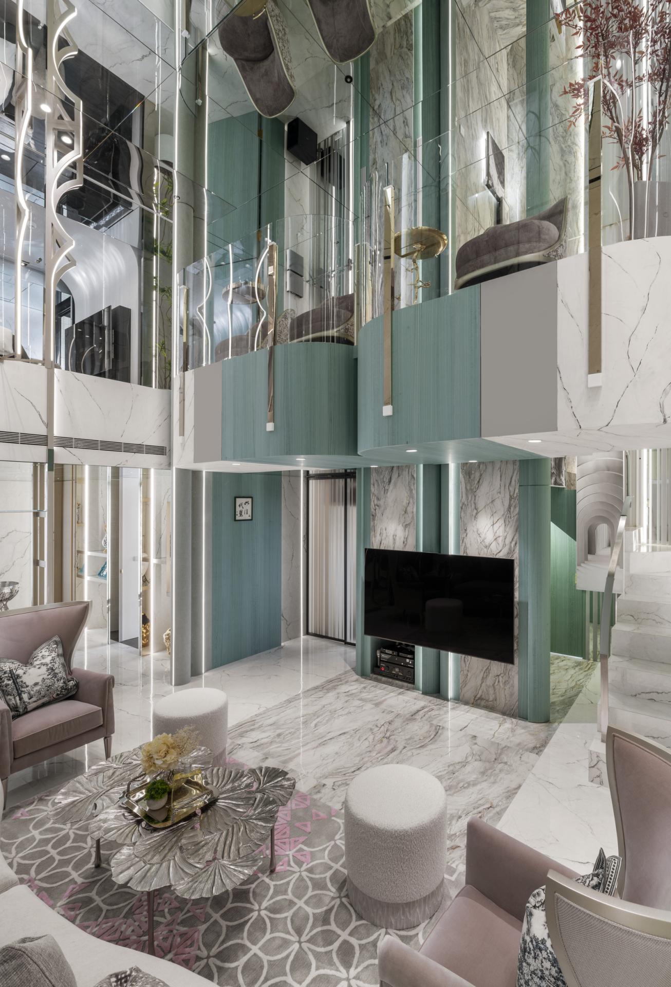 The open public spaces, partial open areas, mirror ceiling, and extended decorative lines reflect the aesthetic influences of Italian and French architecture. The mirror effect creates a sense of height and luxury reminiscent of a palace, breaking through physical limitations to foster an opulent atmosphere. The design also addresses challenges such as a long, narrow layout, limited lighting surfaces, and low ceiling heights.