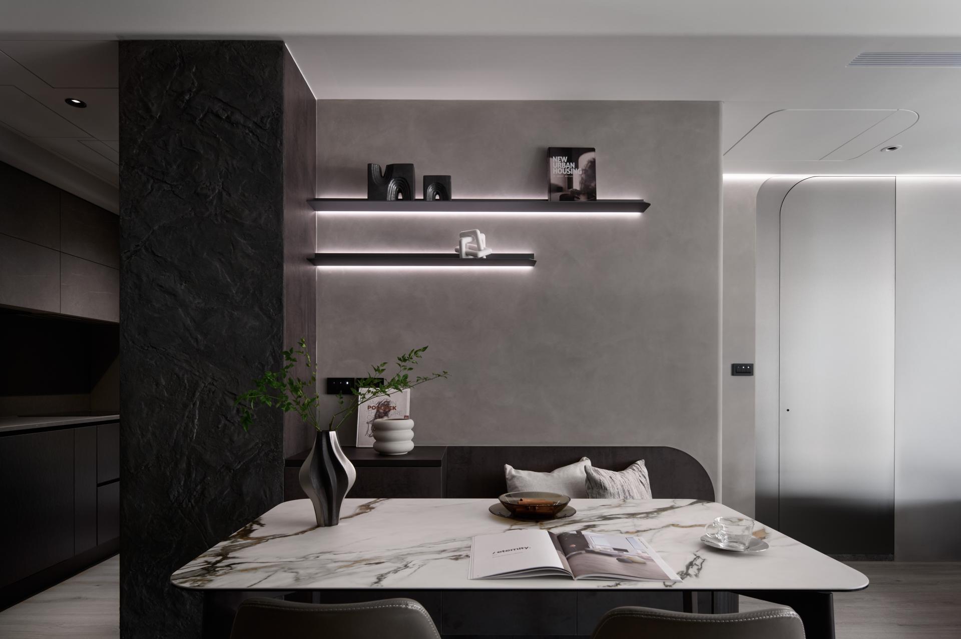 The interior breaks from popular light-toned palettes, embracing darker hues to create a serene and contemplative atmosphere. The expanded public area allows the child to play freely, while semi-open zones for dining and study enable the parents to work or host without separation. Every detail enhances family interaction and everyday ease.