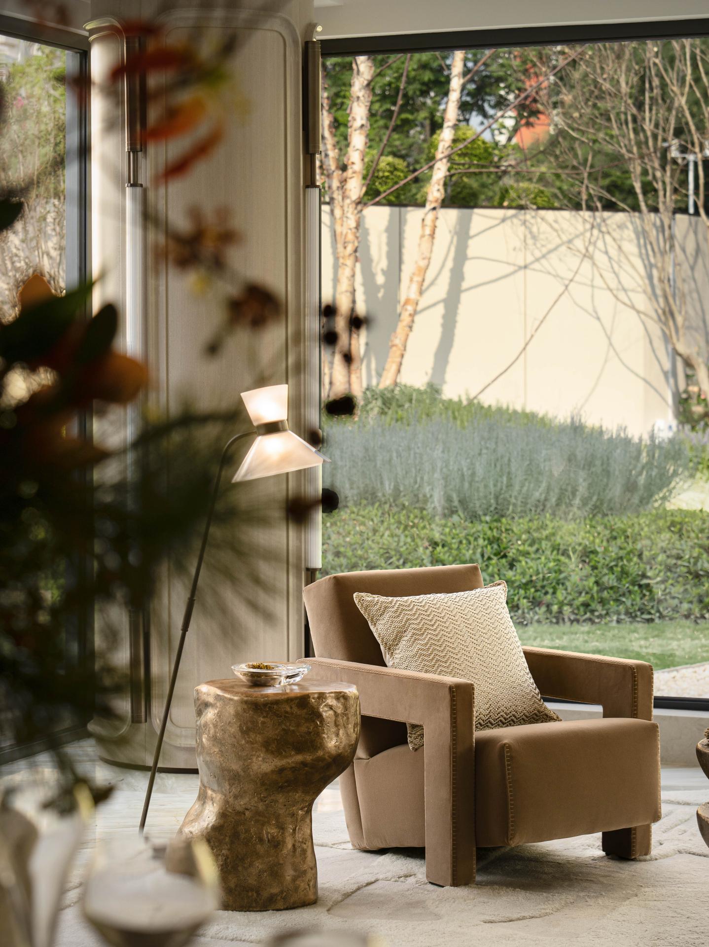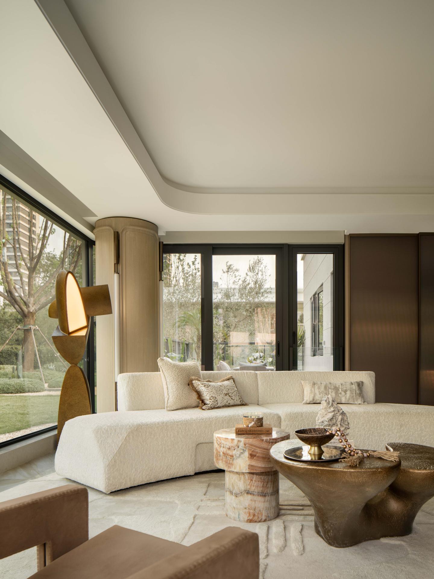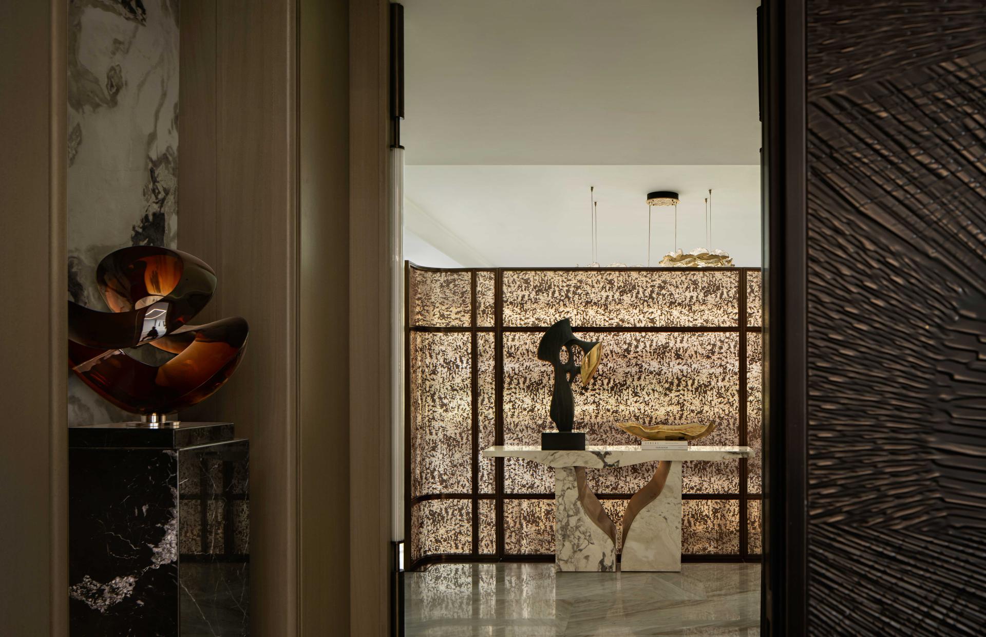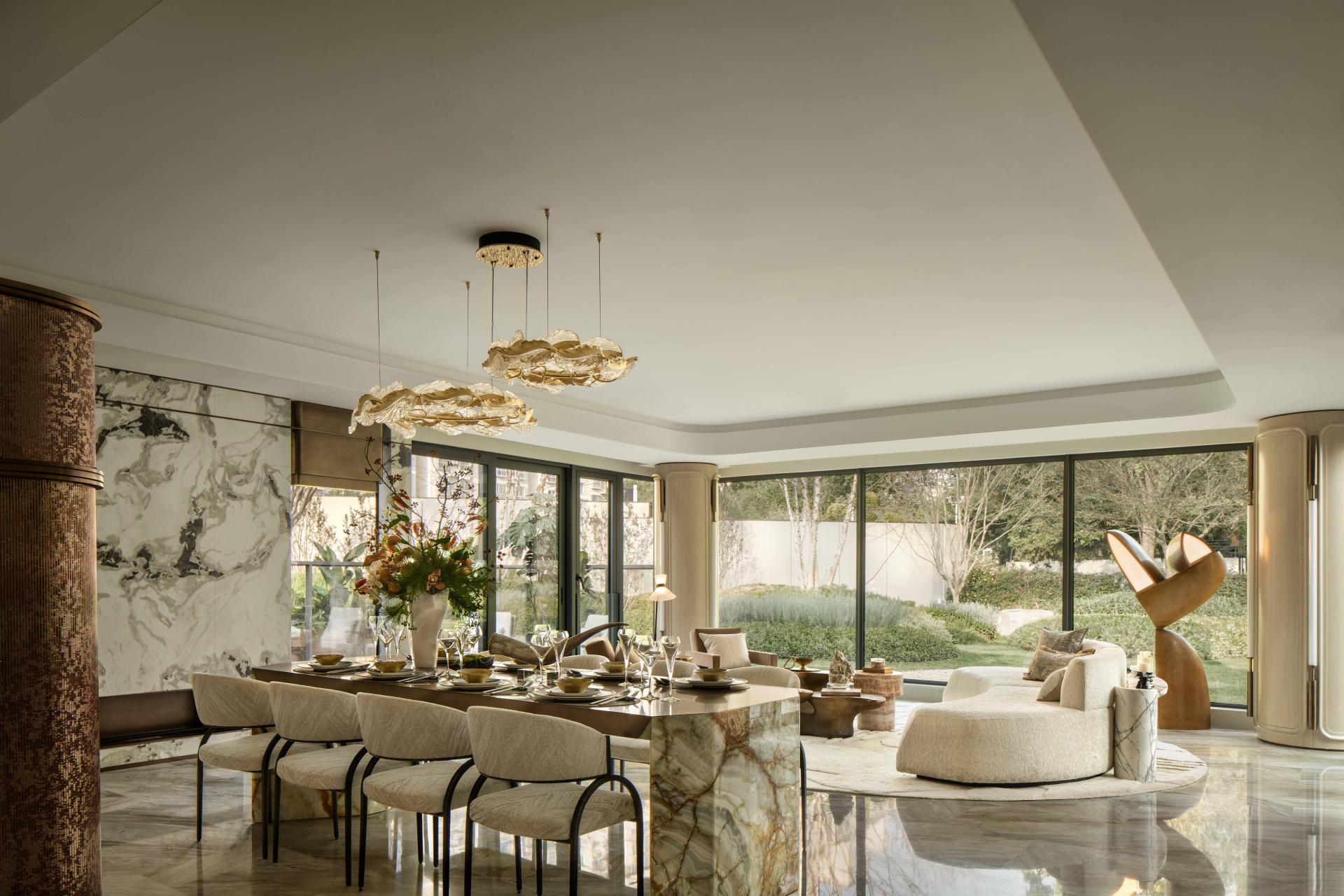 Metal screens define the tangible and intangible boundaries of the open-plan dining area. The stone dining table, with its clean cuts, appears as a lightweight floating volume, its translucent texture catching the natural light. Pendant lights hanging from above extend the metallic and marble elements to the living room, creating a coherent echo that embodies refined style and quality.
