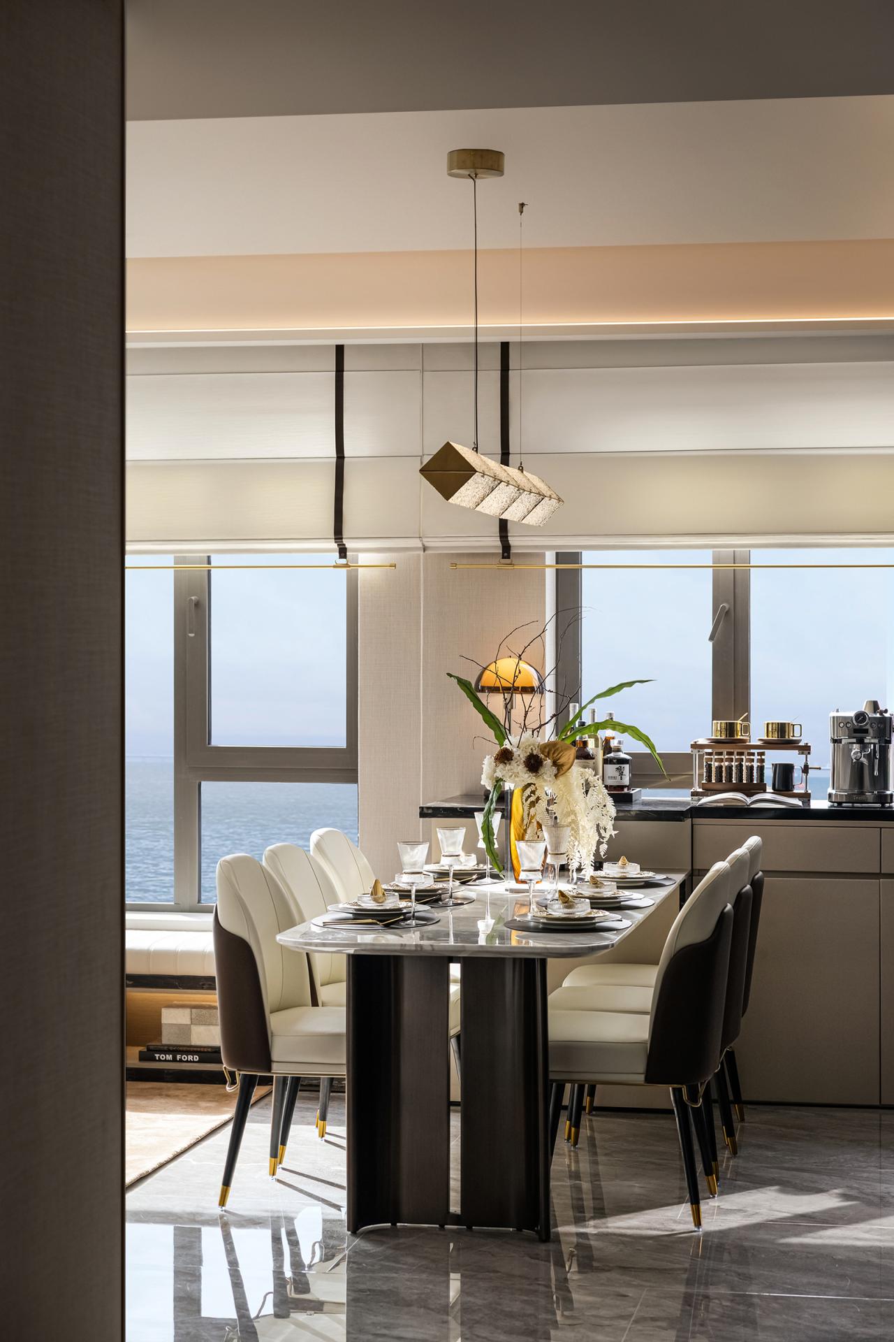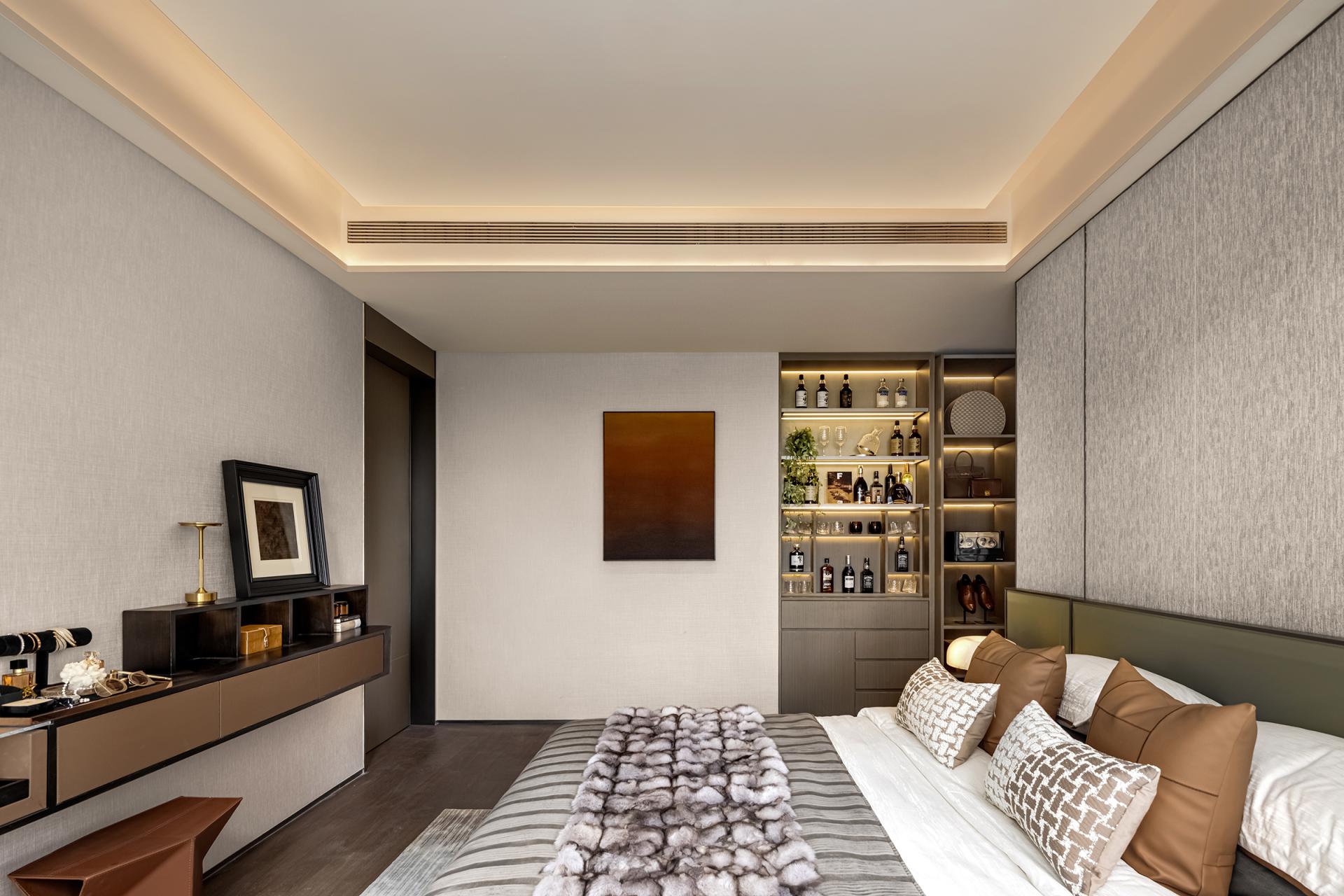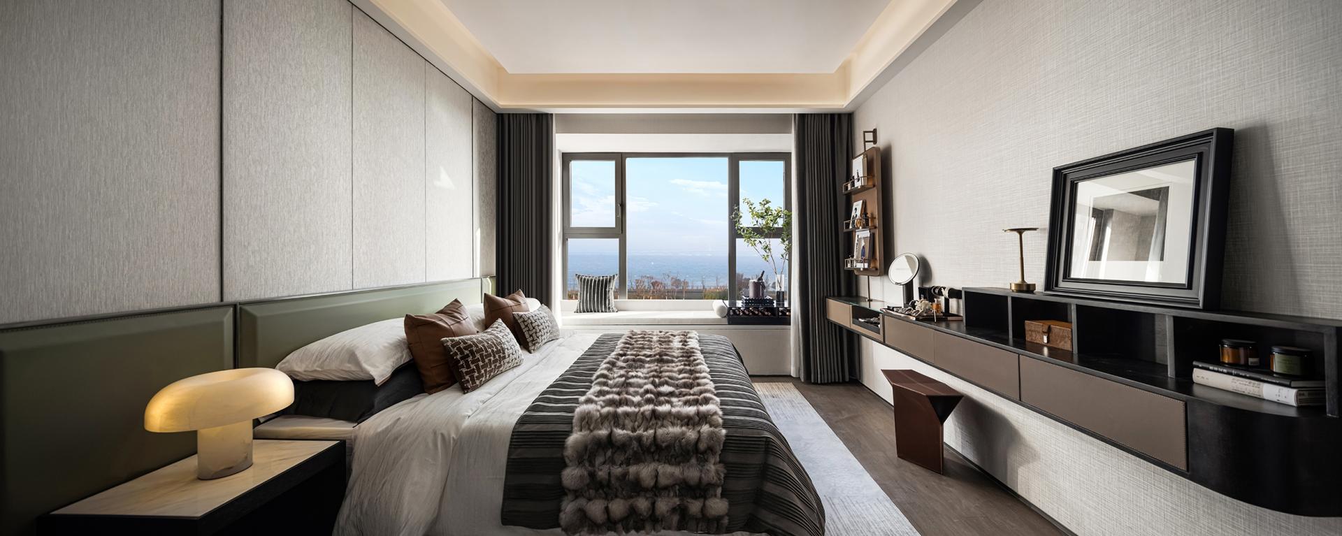 The design style is defined as Maritime Modern. The hard finishes adopt a light beige palette, incorporating sintered stone, textured wall coverings, and brown-toned wood flooring. Building on this foundation, the soft furnishings echo the city’s cultural heritage and coastal setting. Guided by the concept of “Oceanic Imprint, Holiday Sanctuary,” the interiors draw from the layered hues of sedimentary rock, the winding lines of the coastline, and the organic shapes of coral fossils. These elements are translated into lighting, furniture, artworks, and decorative accessories, using a coffee-brown base accented with champagne gold to create an elegant, luxurious, yet relaxing atmosphere.