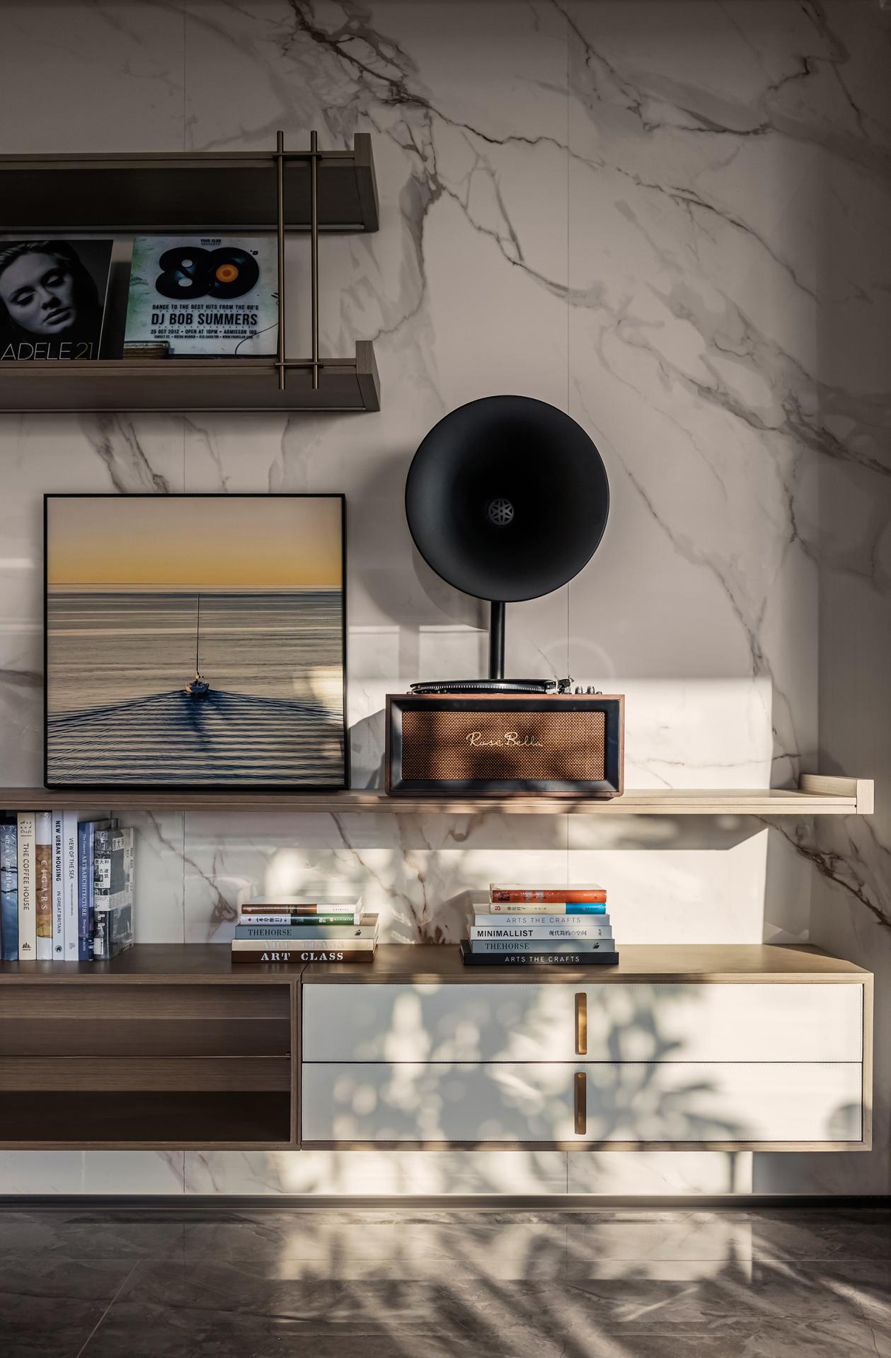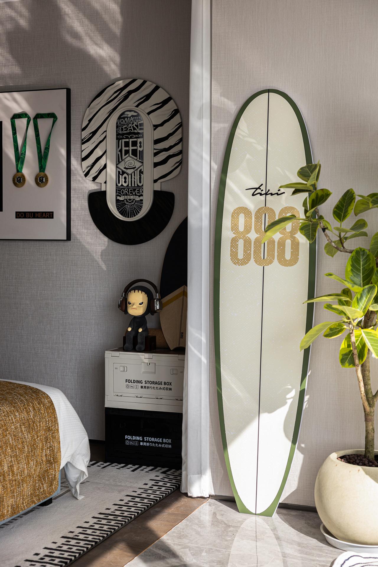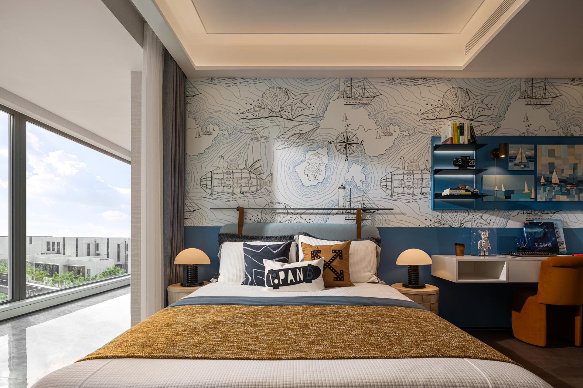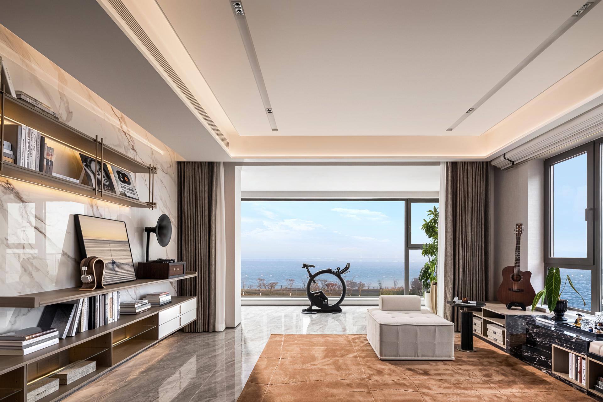 The soft furnishings design responds to the target demographic by crafting lifestyle-oriented settings across all unit types to drive sales. The living area adopts a “de-living-room” approach, moving away from the traditional “sofa–tea table–TV wall” arrangement. Instead, a more flexible and decentralized layout allows freer circulation and multifunctional usage. The living room, dining area, and balcony are designed as an integrated LDK zone, while the balcony incorporates fitness functions and frames the surrounding bay through its panoramic design, embodying the idea of “ocean contemplation.”