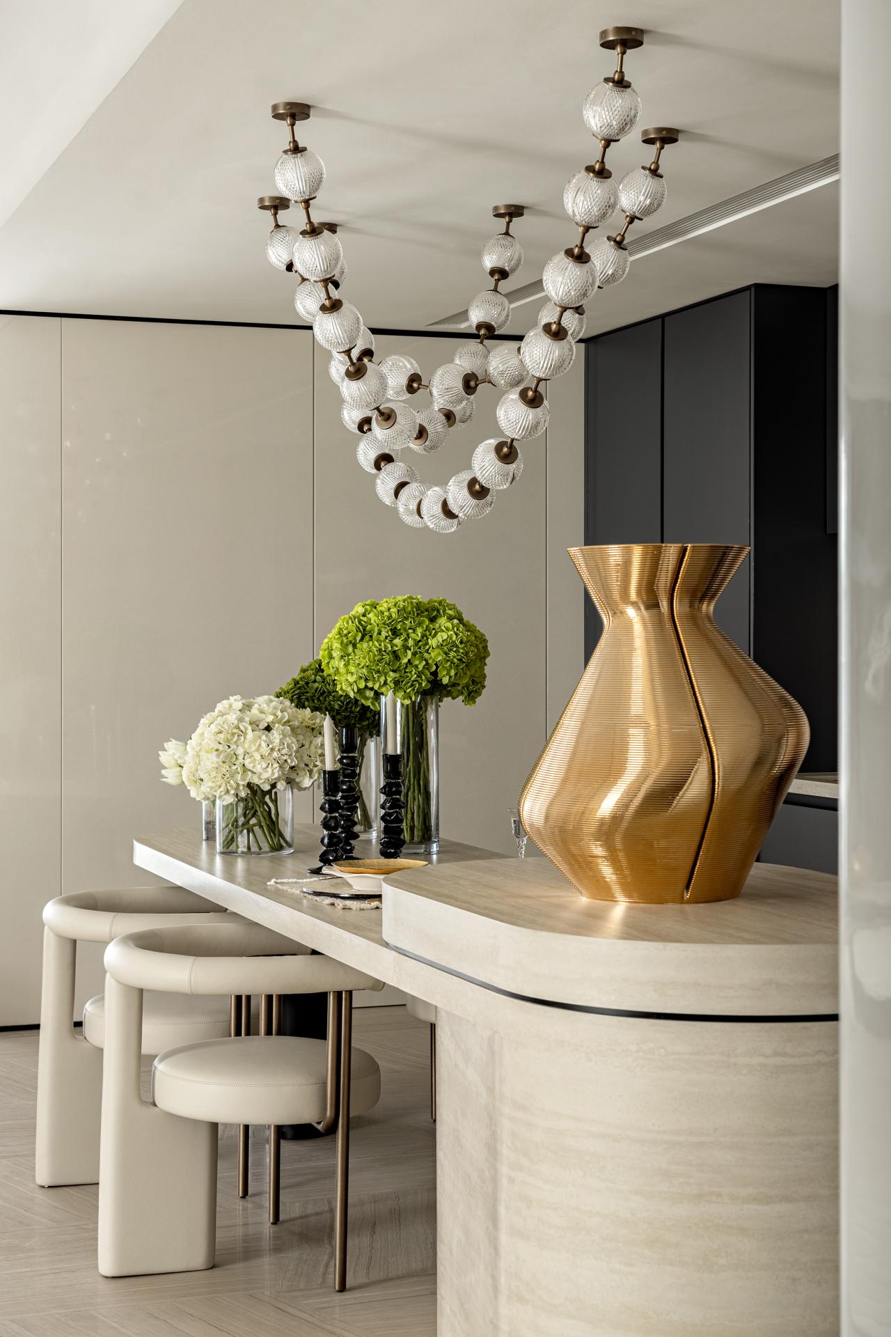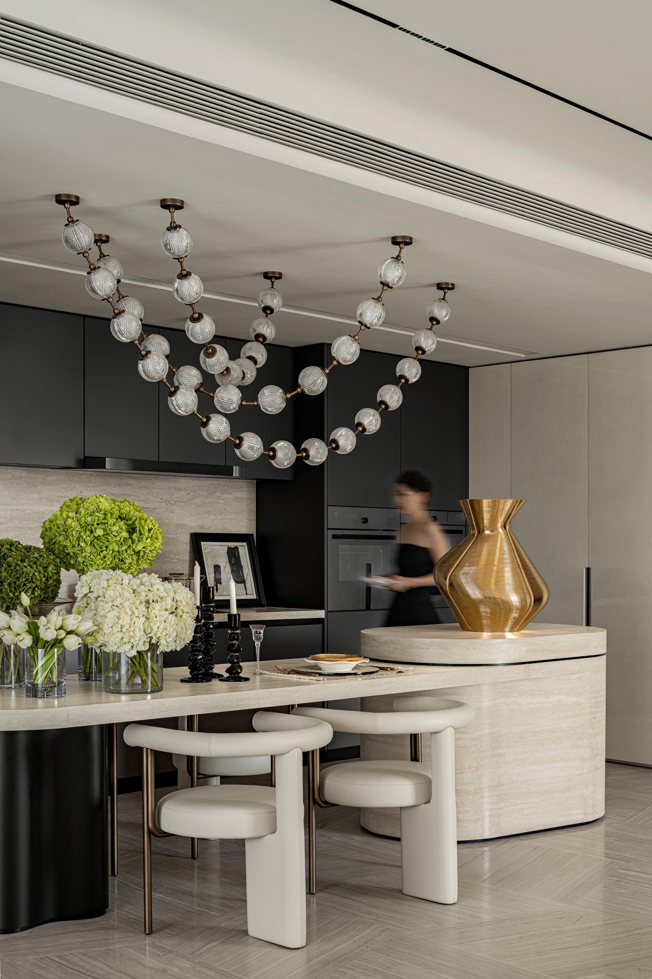 In a corner of the living-dining room, slim metal shelves hover like piano keys above the bar; a soft glow backlights the spines, every book waiting for a fingertip to wake it. Over the dining table a chandelier falls in clear, jewel-like drops, releasing ripples of light that become the poem’s brightest line.