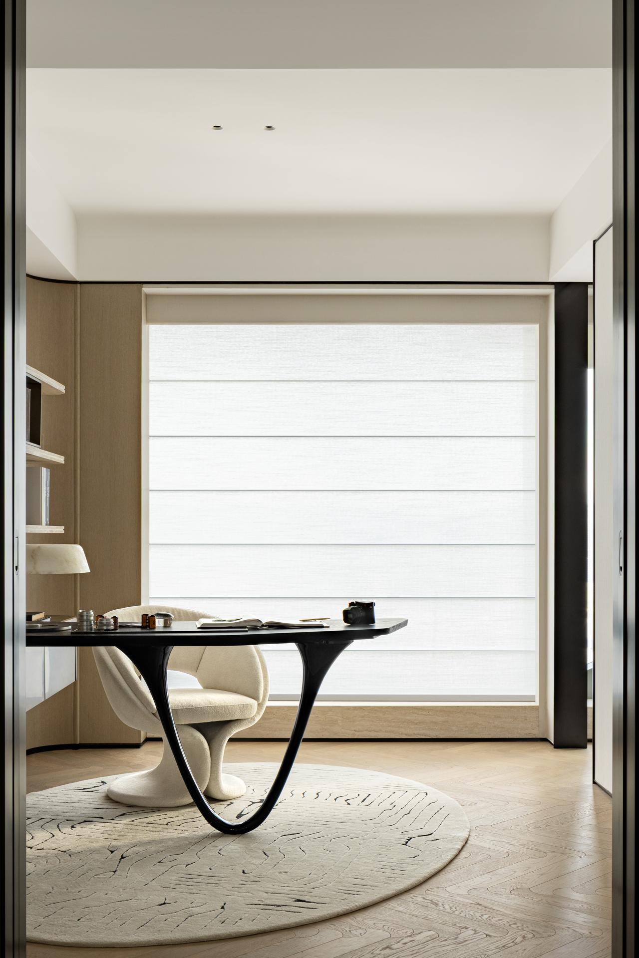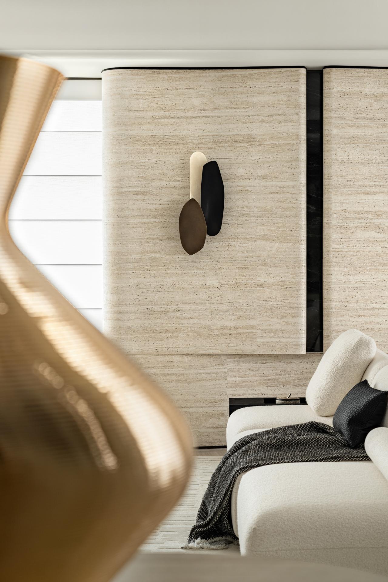 The space is washed in a milky-white base; travertine layers ripple across the walls, and light glides along gentle curves the way moonlight skims the sea, blurring into a hush of luminous verse.
