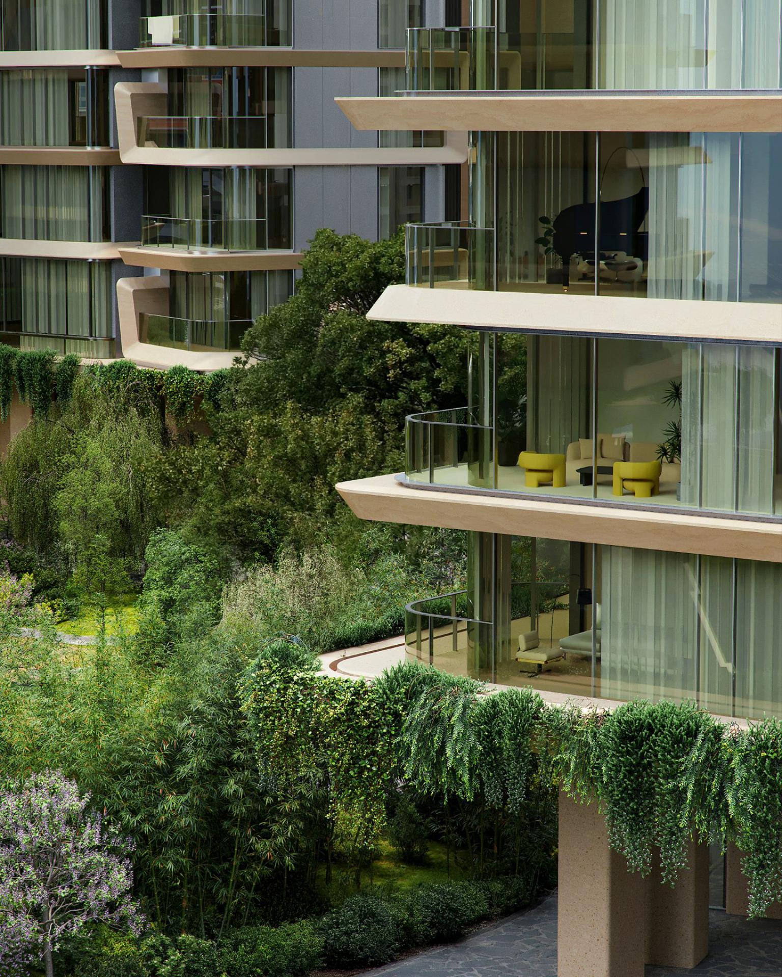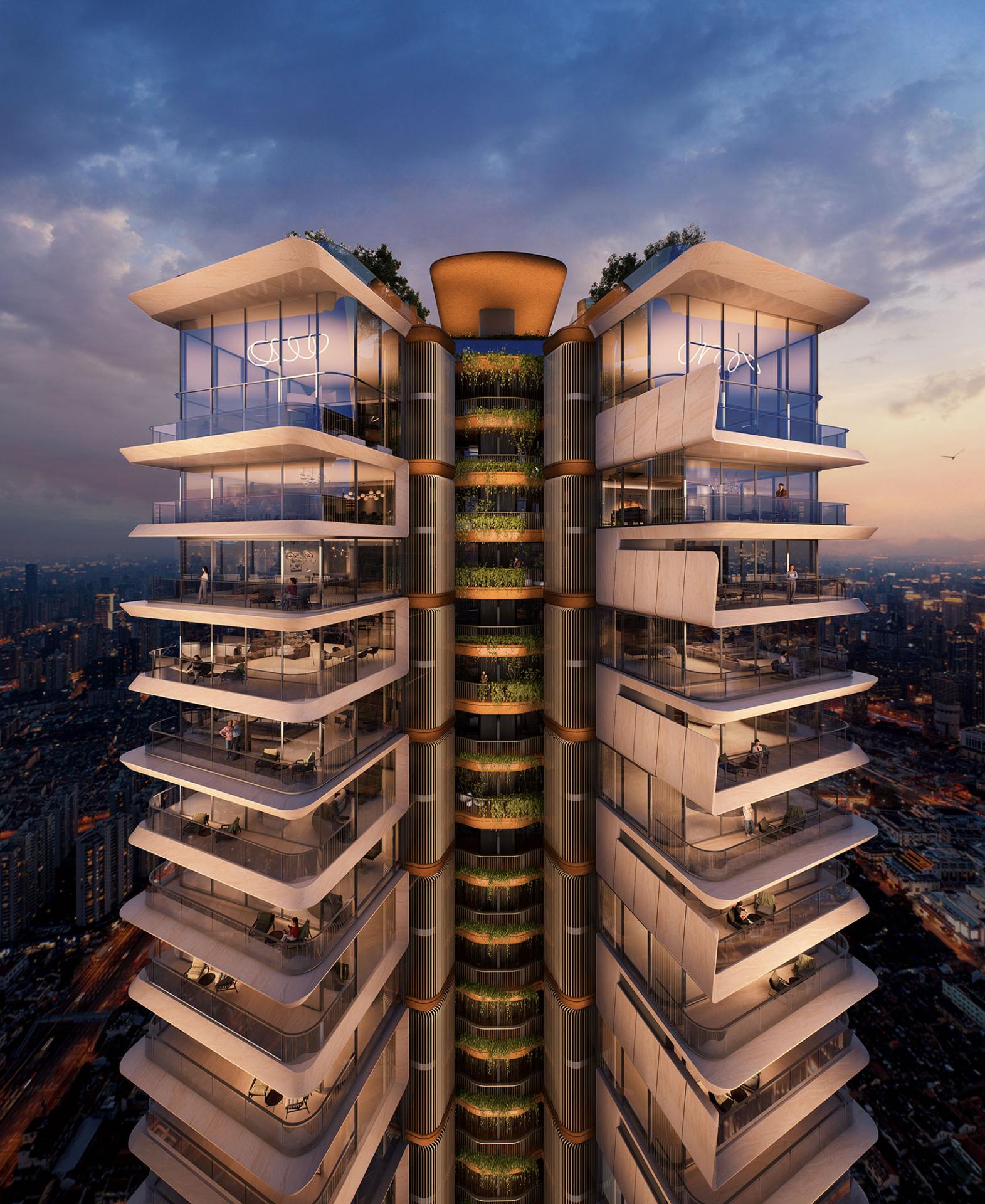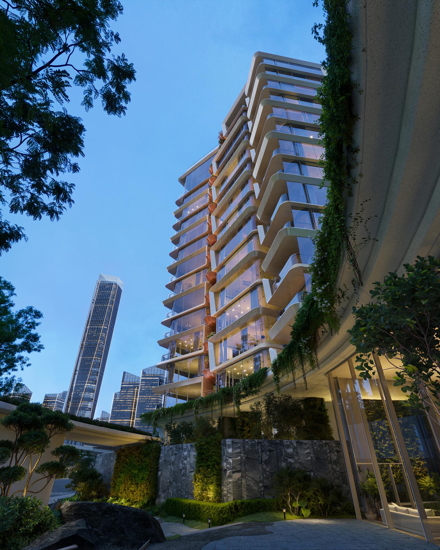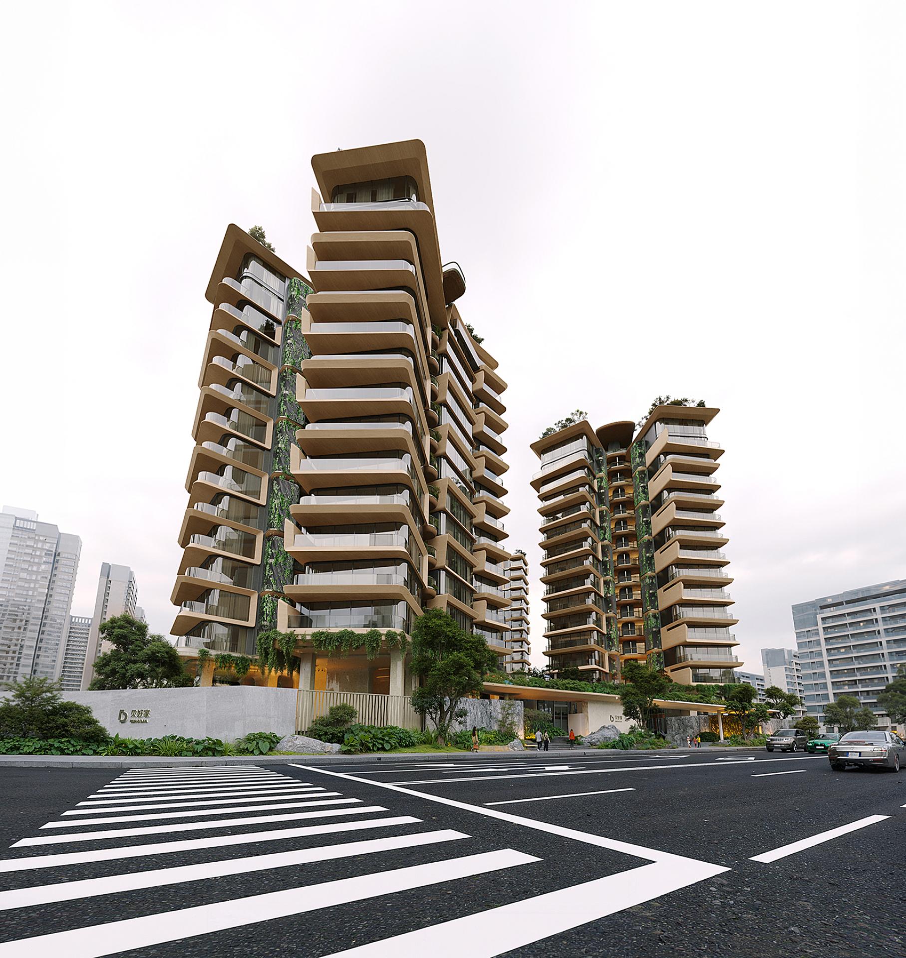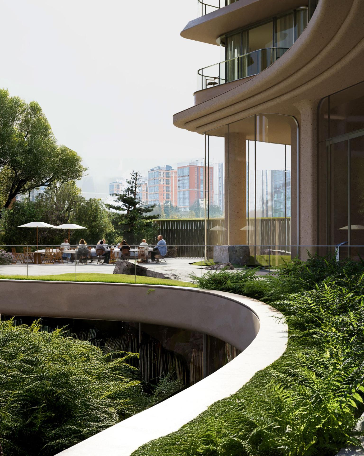 The façade, informed by the X-shaped floor plan, features a biomorphic, flowing form with staggered layers, establishing an ecological rhythm. Cantilevered slabs, modulated at 450mm and 850mm, enhance sculptural tension while maintaining unobstructed sightlines. The design is carefully refined to optimize views: primary vistas remain unblocked, and recessed cantilevers on lower floors maximize garden views. A warm, low-saturation color palette reinforces the building’s integration with its surroundings. Sky gardens, inspired by seashell forms, employ stone-textured aluminum panels and perforated metal railings to support greenery and create a semi-enclosed, intimate environment. The elevated floors and sunken courtyards facilitate seamless integration of greenery, modulating microclimate conditions and generating a relaxed, natural ambiance.