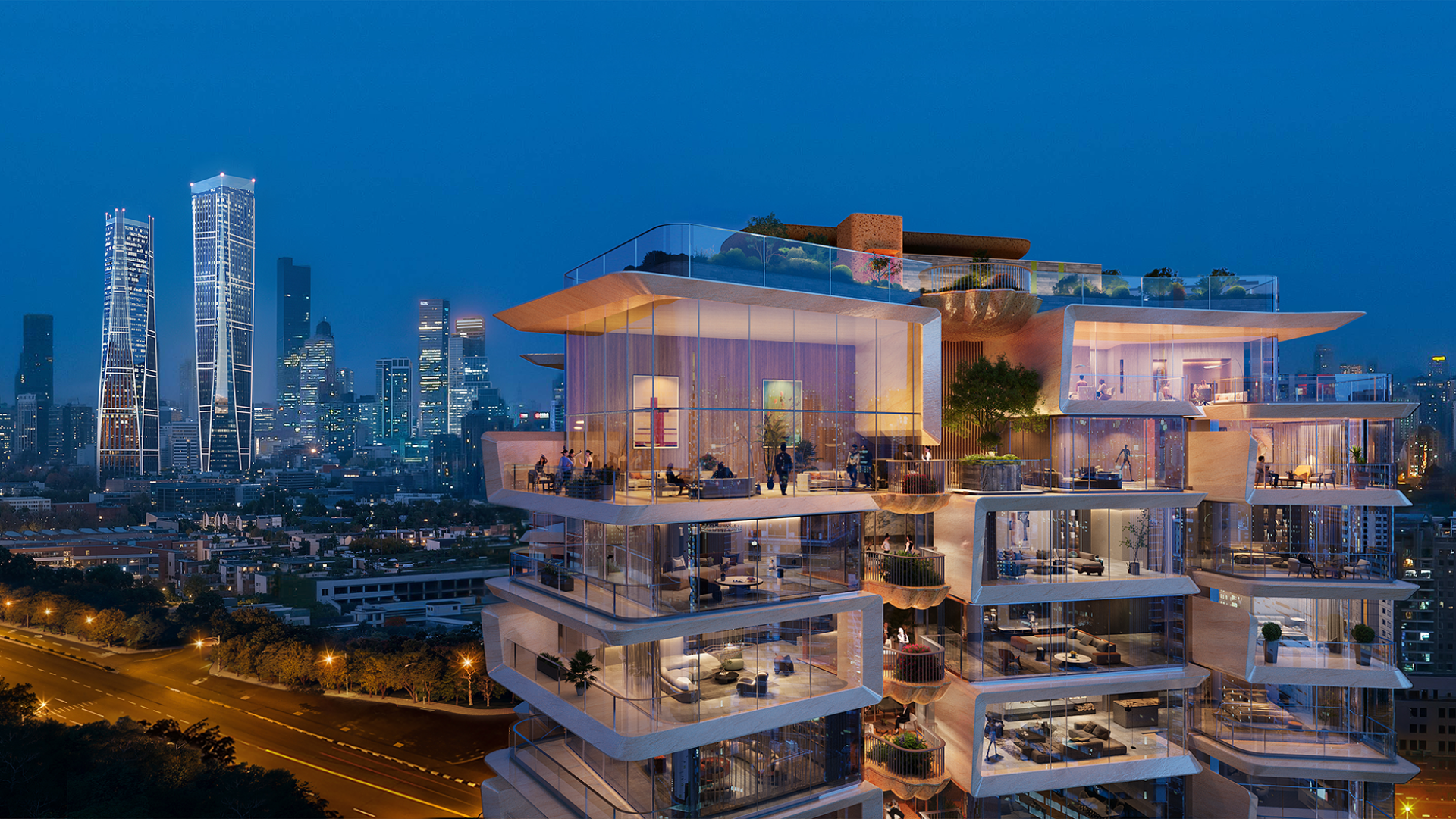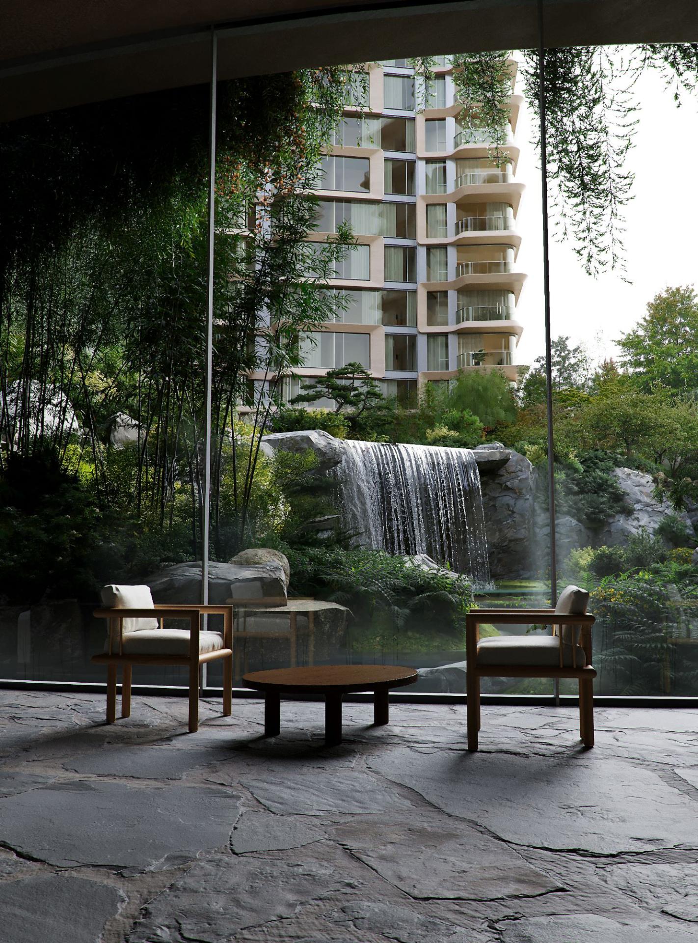Set in the heart of Chengdu Financial City, the site is surrounded by high-end commercial resources and green corridors. All four towers are oriented toward the city’s northwest green axis, positioned diagonally at the corners rather than aligned along the site edges, which liberates the central open space. This layout enables a porous ground plane, multiple entry points, pedestrian circulation, and interconnected pocket gardens. The interior layout reorganizes functional zones, clearly distinguishing public and private areas. Four “sky gardens”—a semi-private entry garden, a waiting garden, a sunken panoramic garden, and a private terrace adjacent to the master bedroom—are integrated into daily living, enriching spatial experience with a layered interplay of privacy, transparency, and connection to nature.