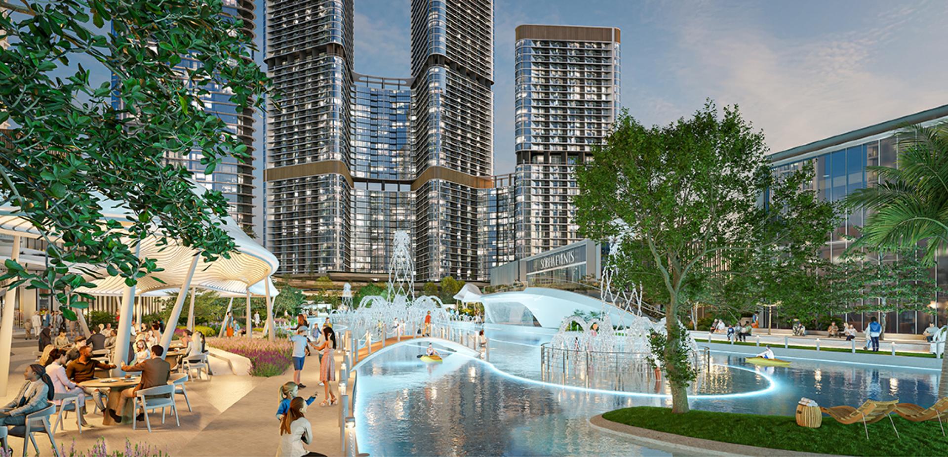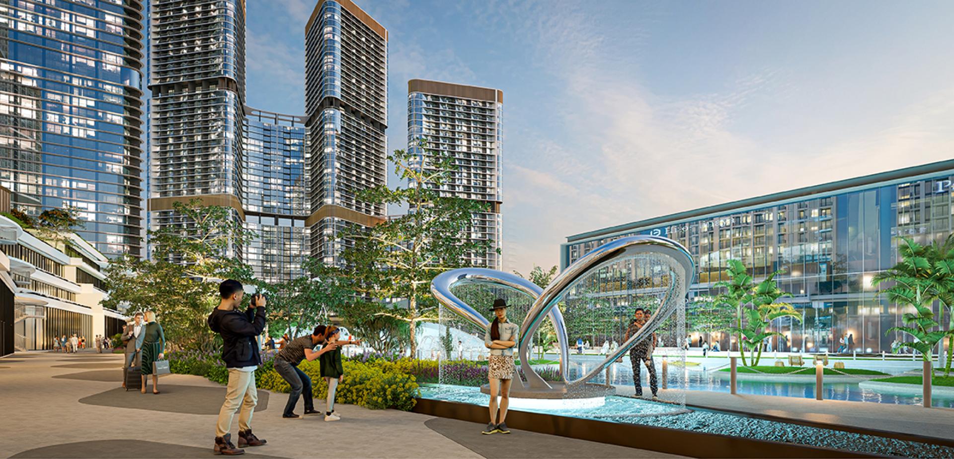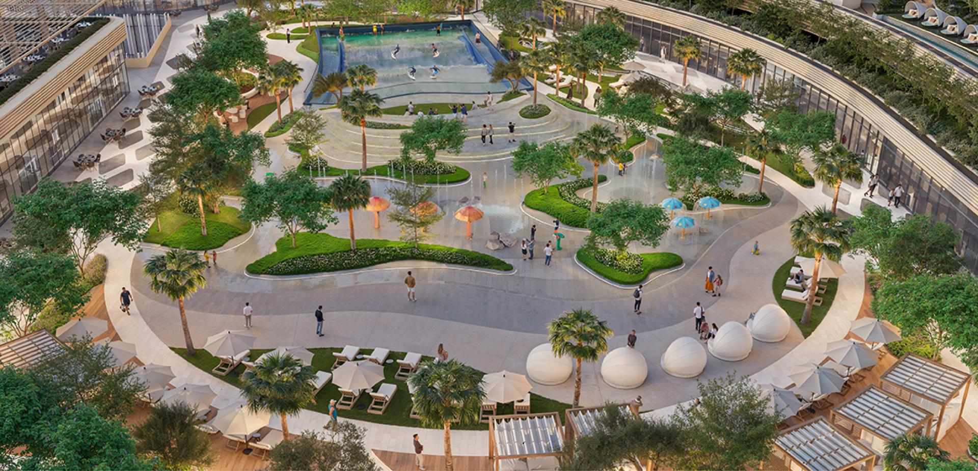 The plaza, designed as a living sculpture, is animated by native planting, sculptural trees, reflective pools, splash zones, and curated art installations. Community life is encouraged through shaded promenades, floating cabanas, and interactive lighting. A signature artwork by Simon Ma and a DMX-controlled multimedia fountain transform the plaza into a stage for civic identity and cultural engagement.