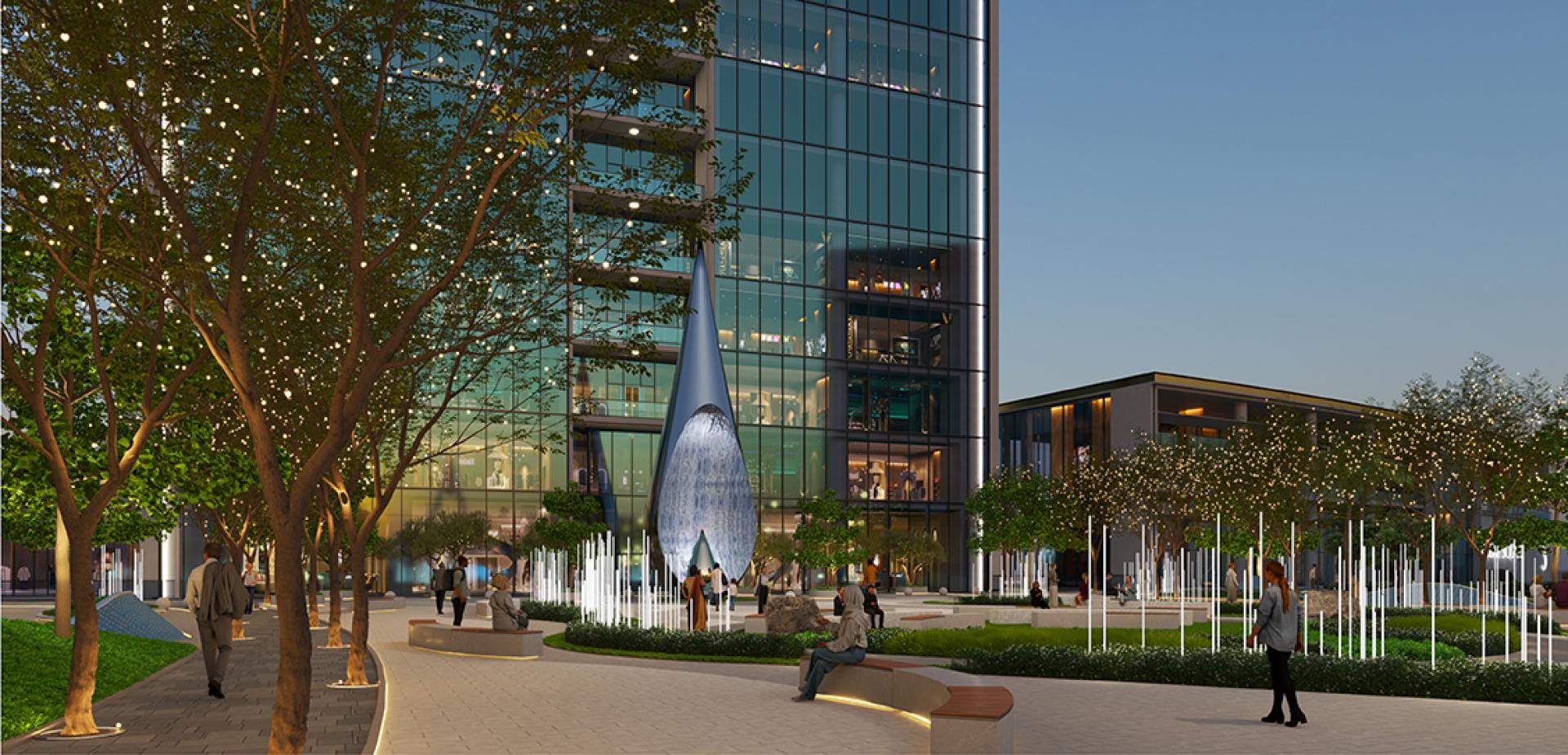 At its core stands a 26-storey headquarters tower, framed by thirteen sculpted low-rise buildings, a boutique hotel, retail and dining spaces, an events hub, and a landscaped civic plaza. Anchored by water, art, and light, the masterplan is arranged symmetrically along a raised canal, ensuring clarity of circulation and intuitive transitions between public and private zones.