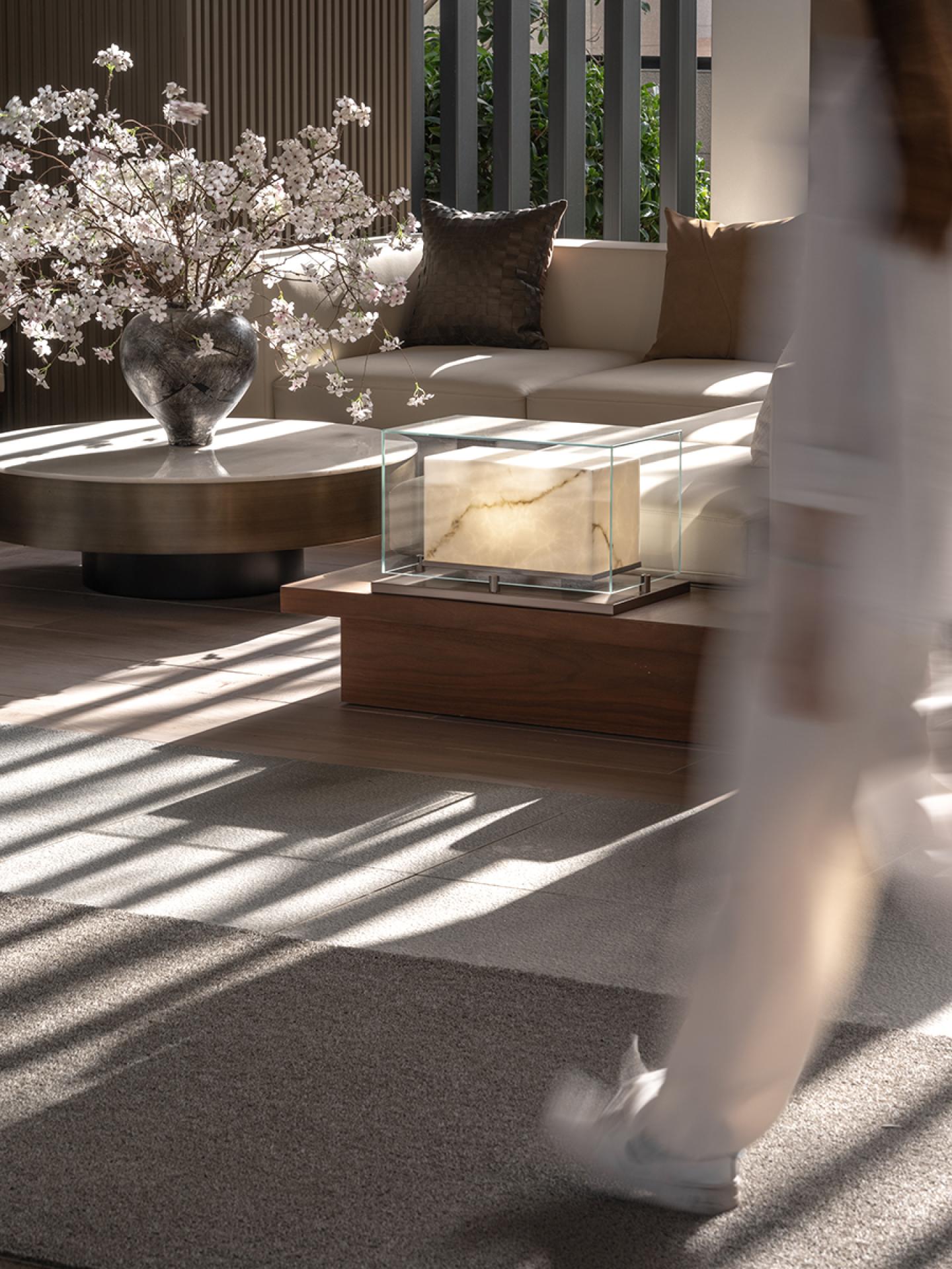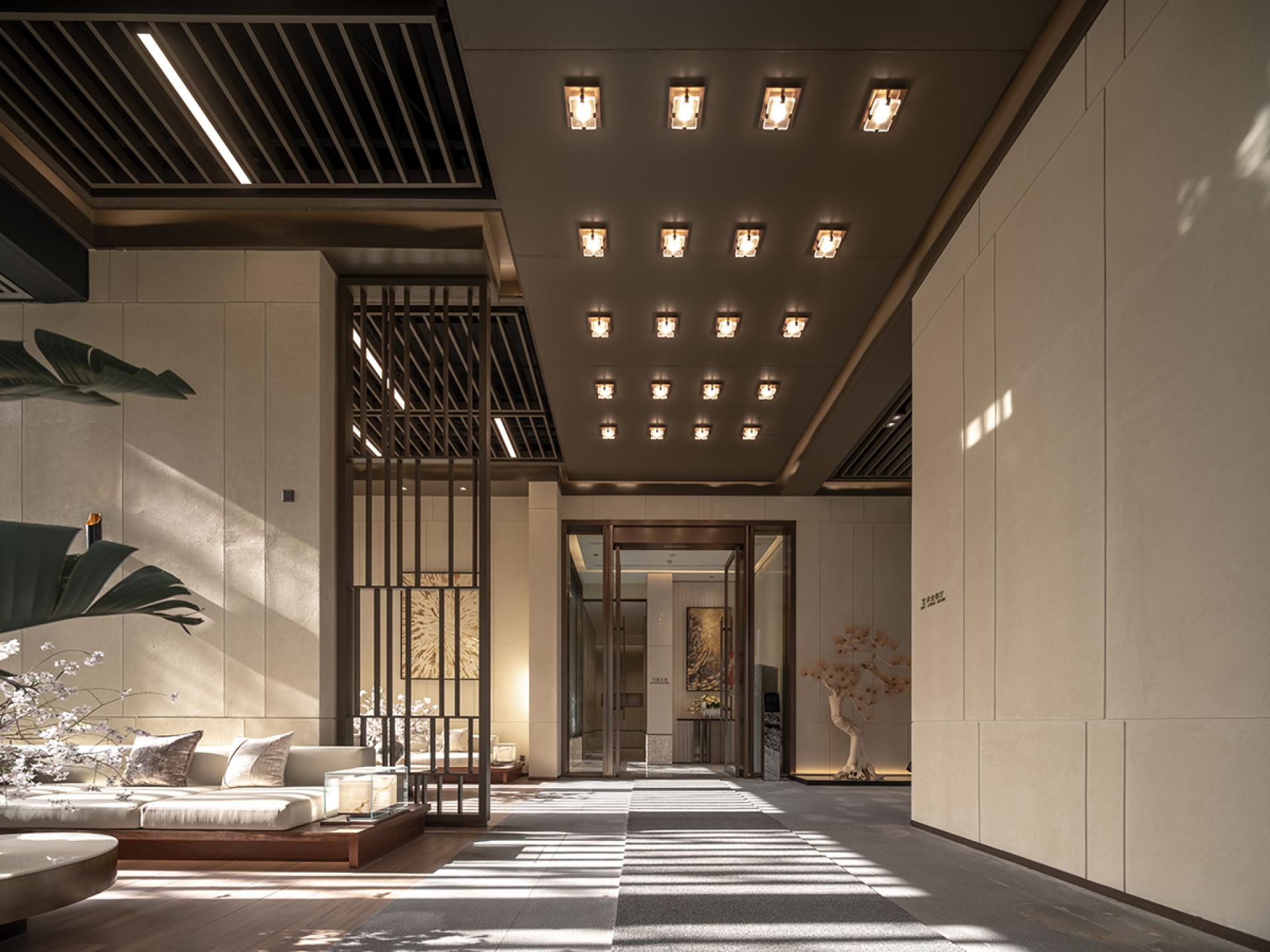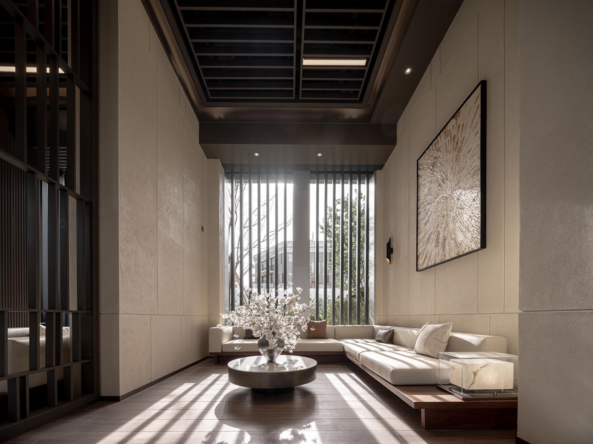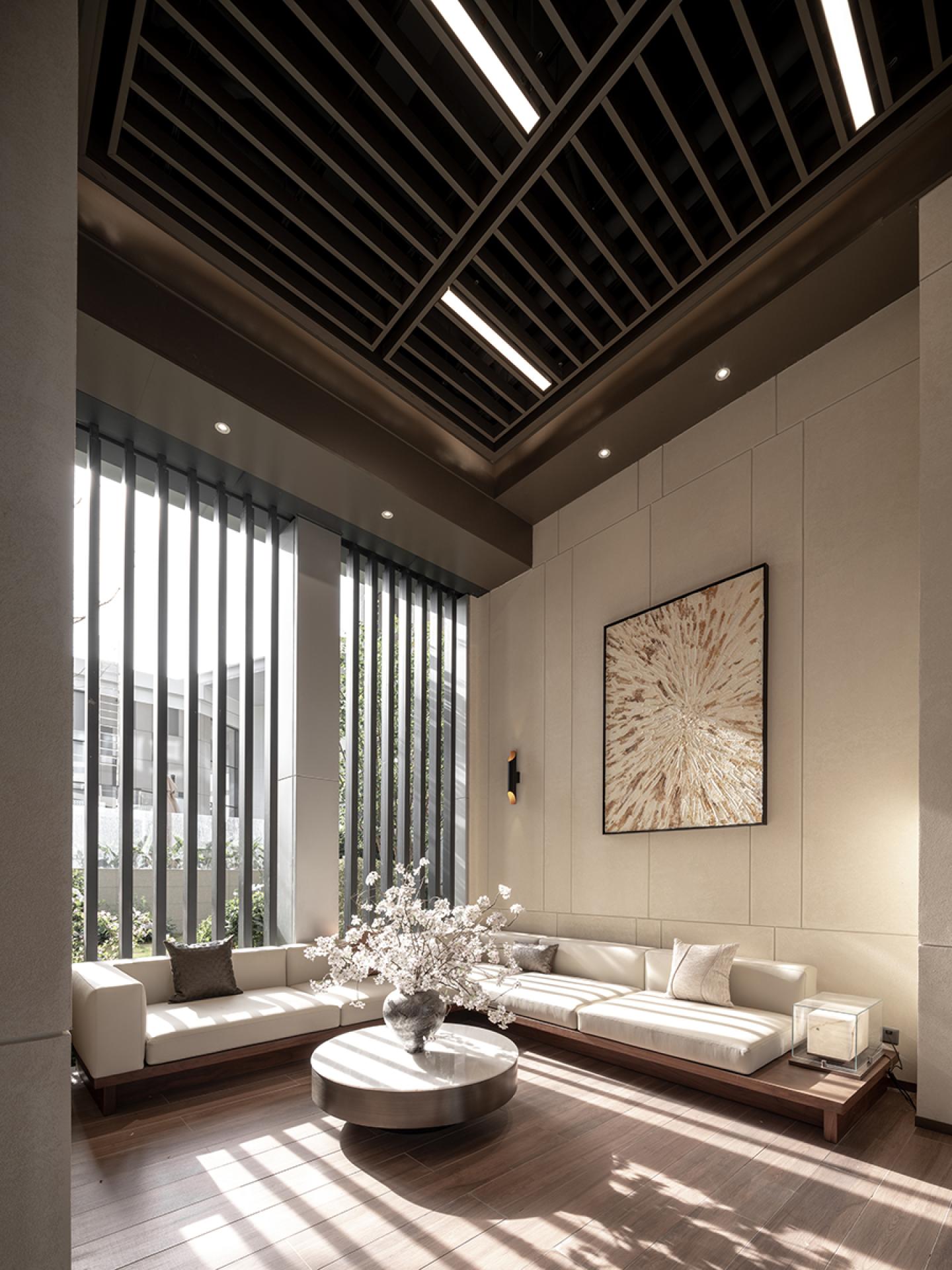 The lounge features a modern minimalistdesign. A dark grille ceiling with warmlighting creates a serene ambiance, whilelight-toned walls and sofas, accented by artpieces and greenery, ensure ample naturallight. Spatial zoning via partitions enhancescomfort, elegance, and layered depth.