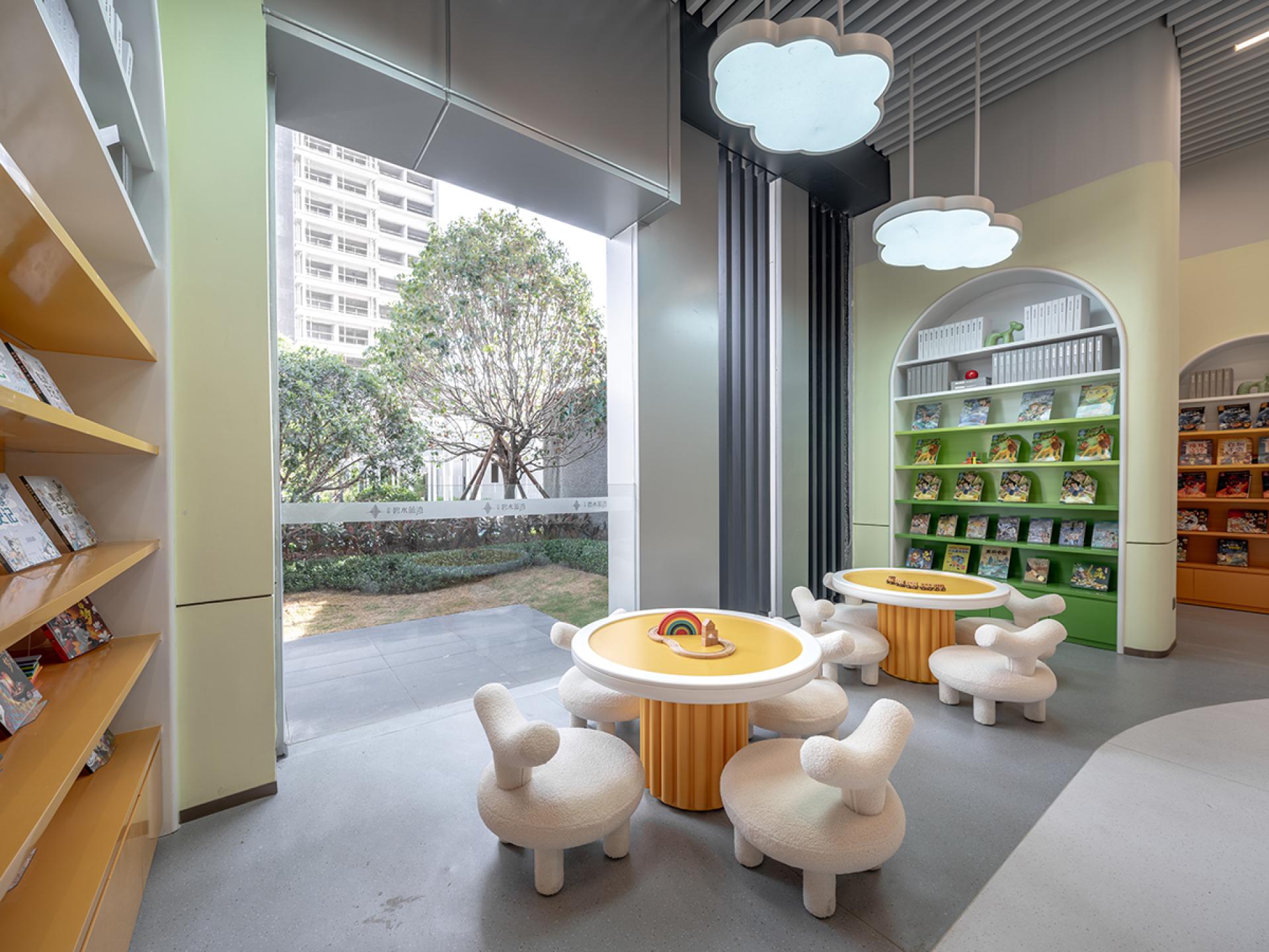 The children's reading zone is adorned withadorable cloud-shaped lights and playfulfurniture, filled with books. Soft, warmtones create a comfortable atmosphereencouraging kids to read, interact, anddevelop a love for reading.