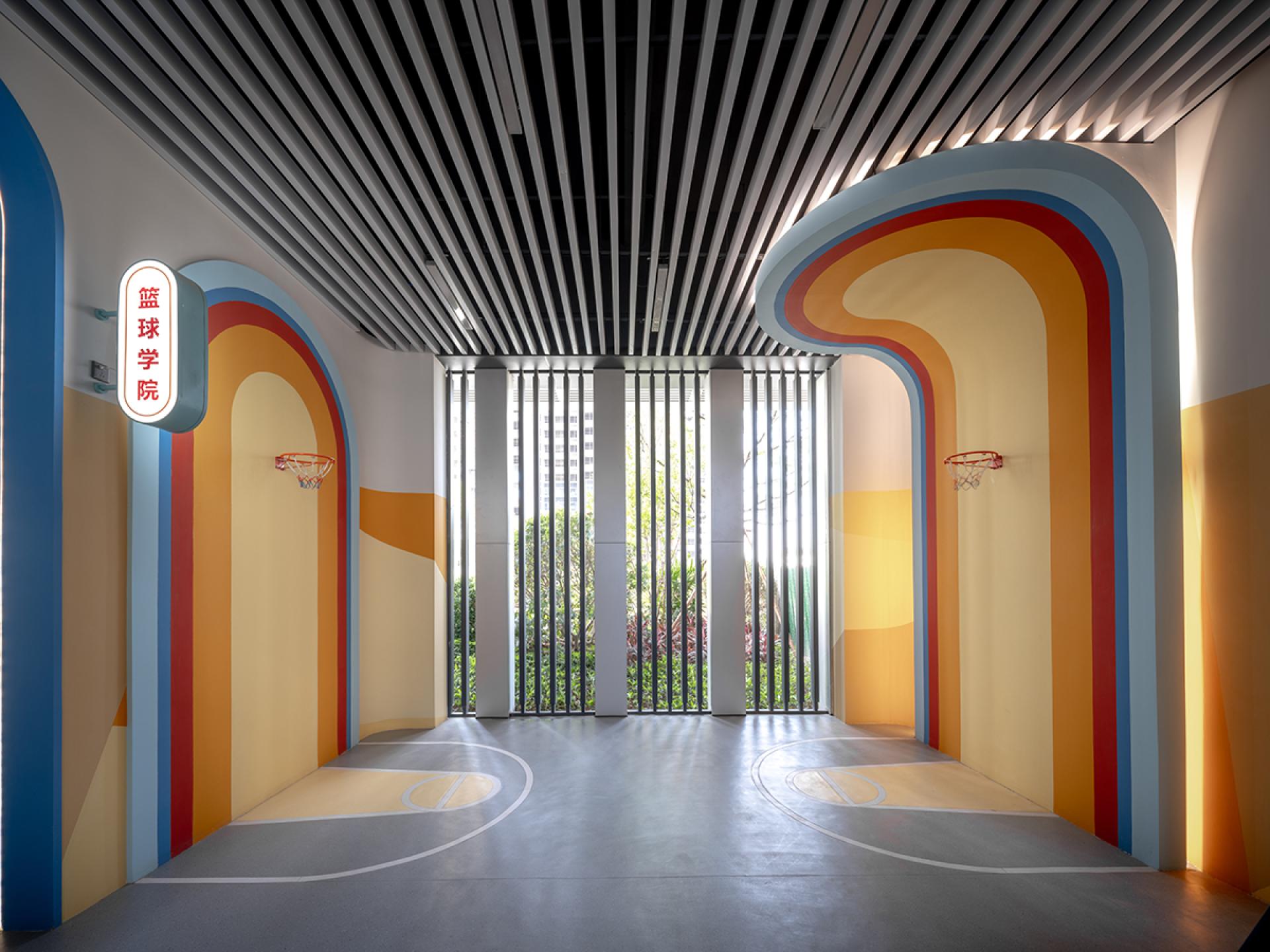 运动场以多彩拱门造型打造篮球学院,活力满满。地面绘有篮球场地元素,强化运动氛围。简洁现代的顶面与墙面色彩搭配协调,营造出既专业又富有趣味的篮球运动空间,吸引爱好者投身其中。