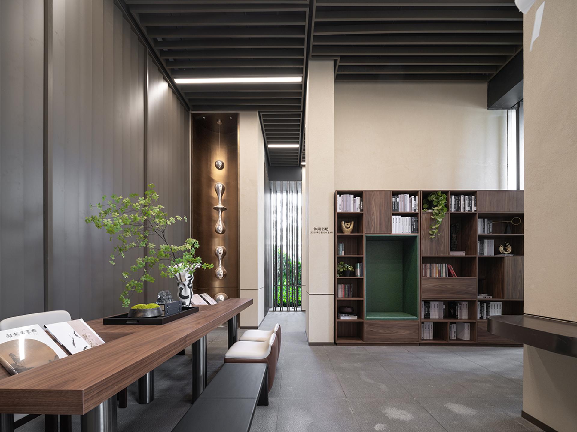 The leisure book bar employs a balancedcolor scheme to evoke calmness, withwooden shelves and furniture offering anatural texture. Lush greenery adds vibrancy, while soft lighting delivers a cozyexperience. The open layout fosters arelaxing and enjoyable readingenvironment.