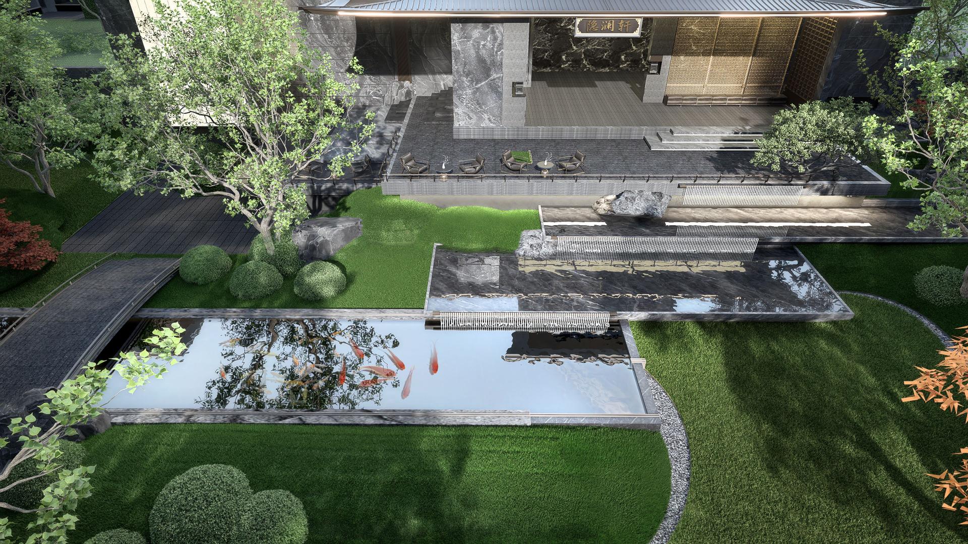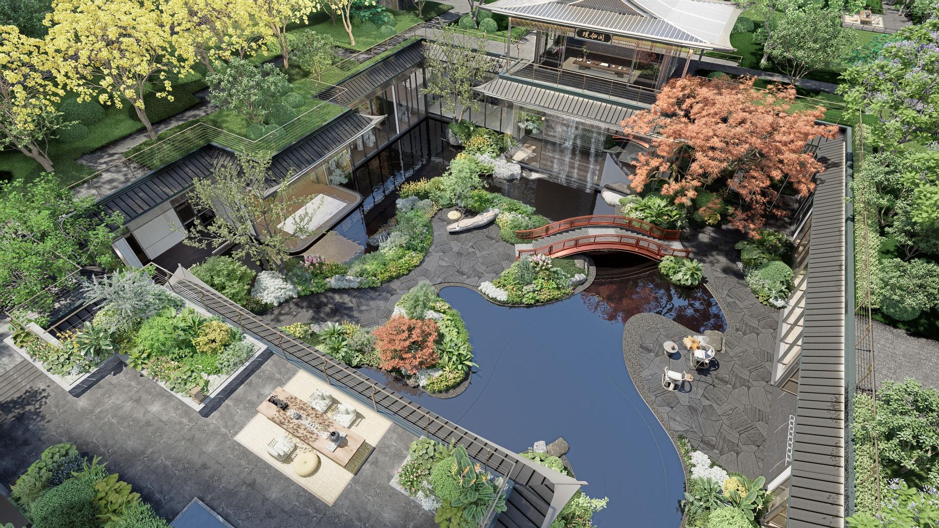 The second-courtyard sunken garden features a flying waterfall pavilion mirrored by a crimson bridge. Specially selected laceleaf Japanese maples add colors, while the site and architectural spaces interact to create a multi-functional, integrated environment.Regarding material application, a selection of stones including jungle green marble and Wyndham grey granite is used alongside champagne bronze stainless steel. Each material is processed with distinct techniques tailored to its properties, allowing for versatile application. Regarding safety, protection is ensured through four key dimensions, including hardware safeguards, circulation planning and others, adapting to various scenarios and the needs of different users.